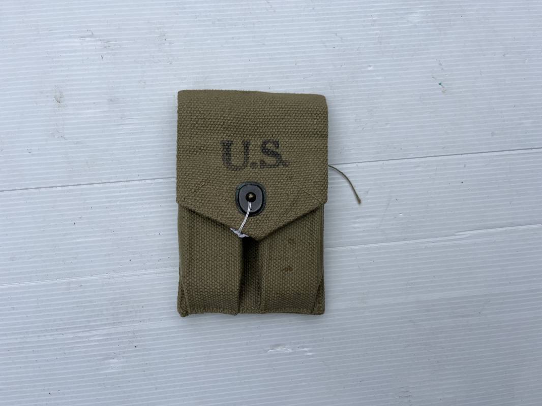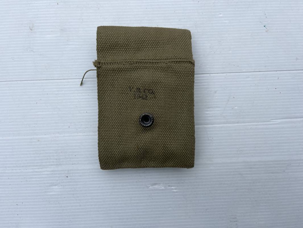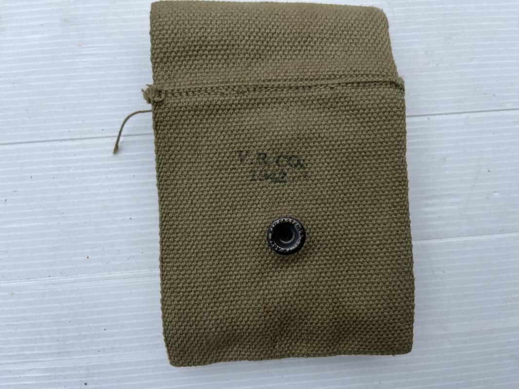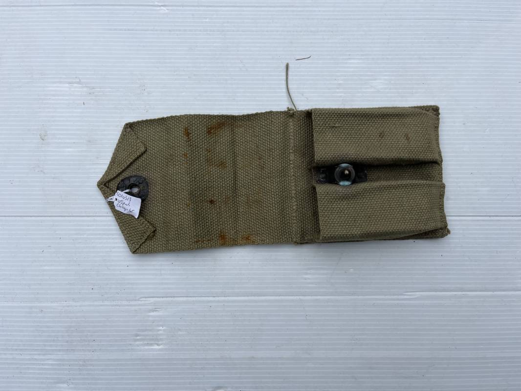 Pochette modéle 1923 en coton filé pour deux chargeurs de pistolet automatique colt 45. Passant pour ceinturon et bouton pression. Marquage fabricant VR Co 1942 . Légèrement porté, parfait état. Ref 19026