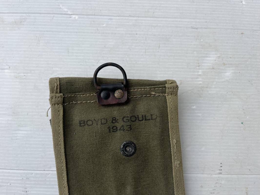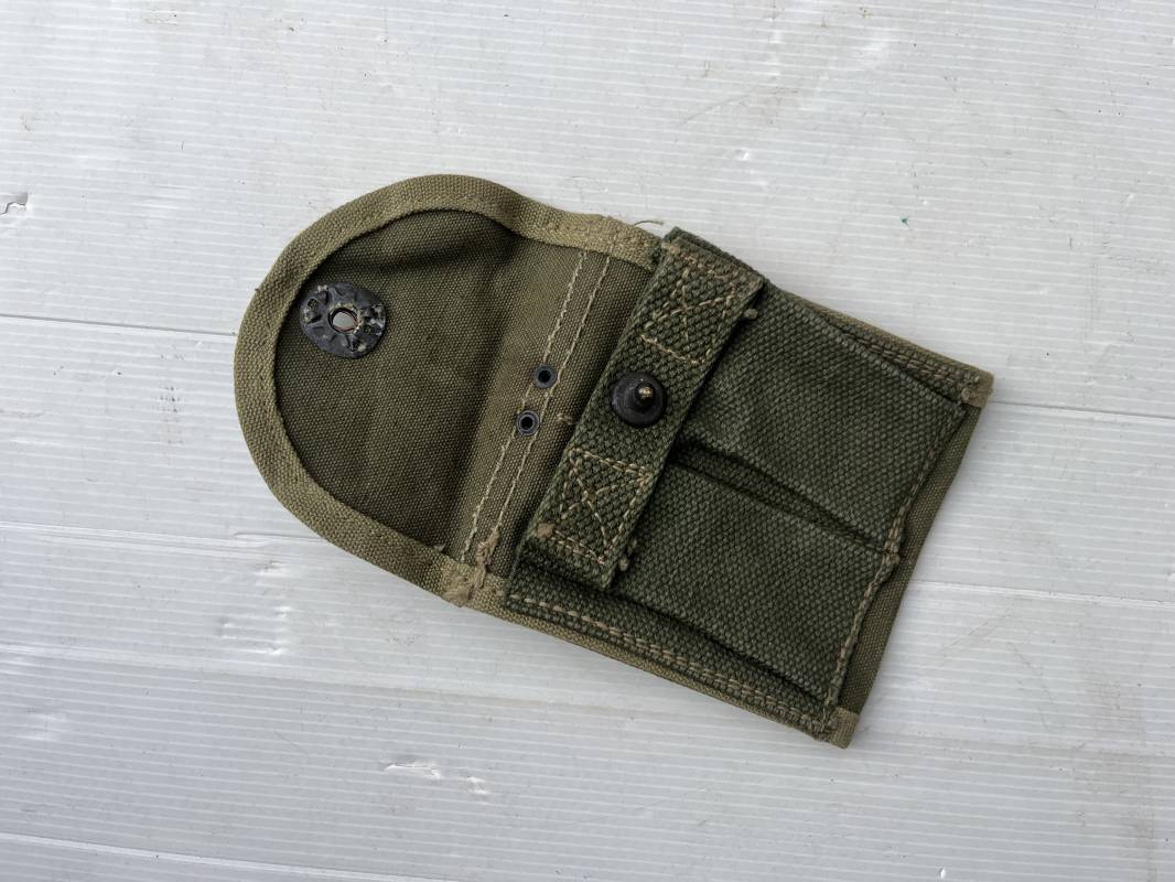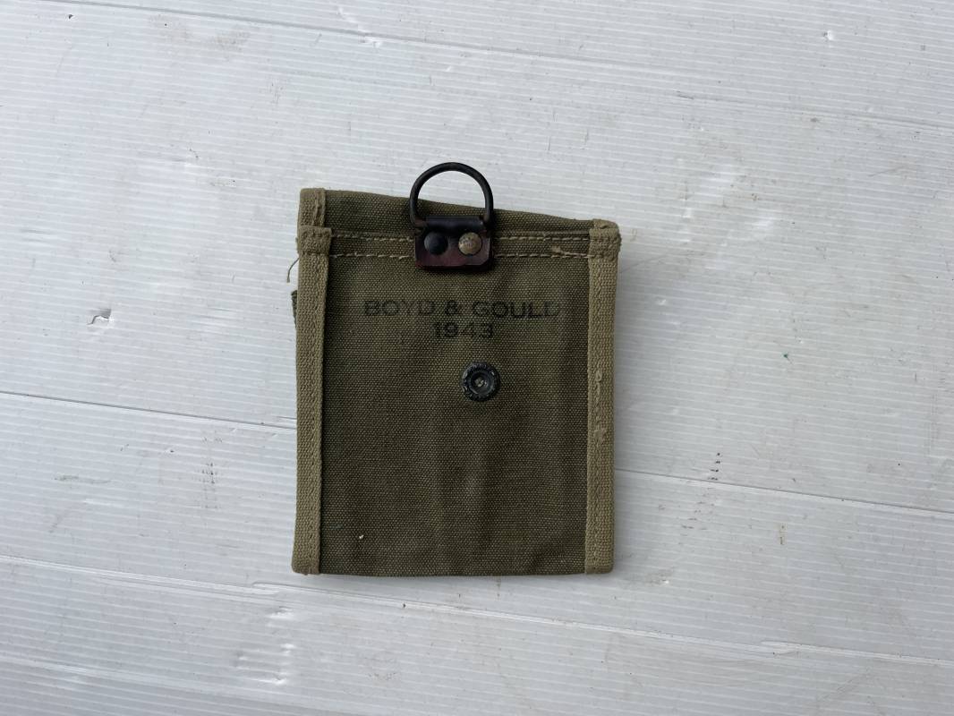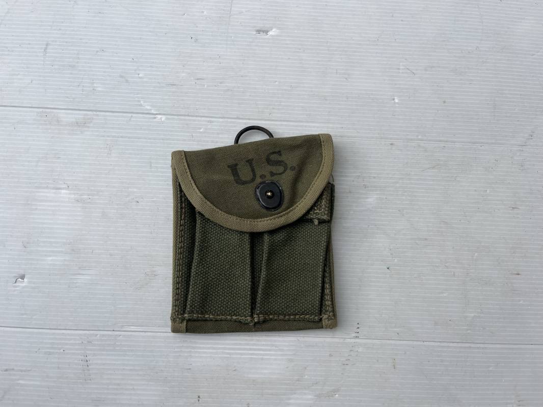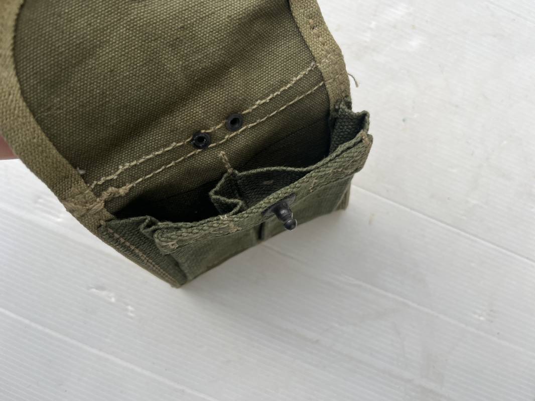 Pochette porte chargeurs américaine pour la carabine USM1 . Pochette en toile OD Marquage fabricant daté 1943 . Modifié Armée Francaise par l ajout d un 'D' métallique riveté pour le port a la bretelle de suspension . Légèrement Porté en trés bel état Ref 21764