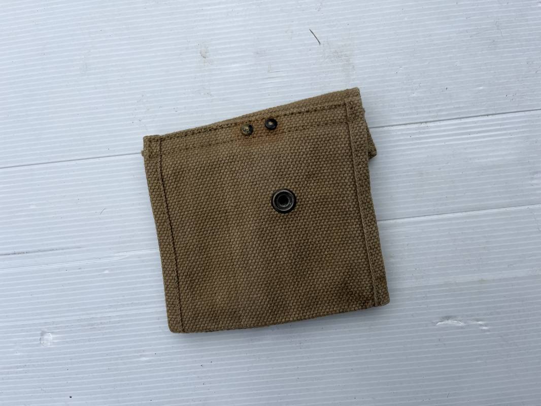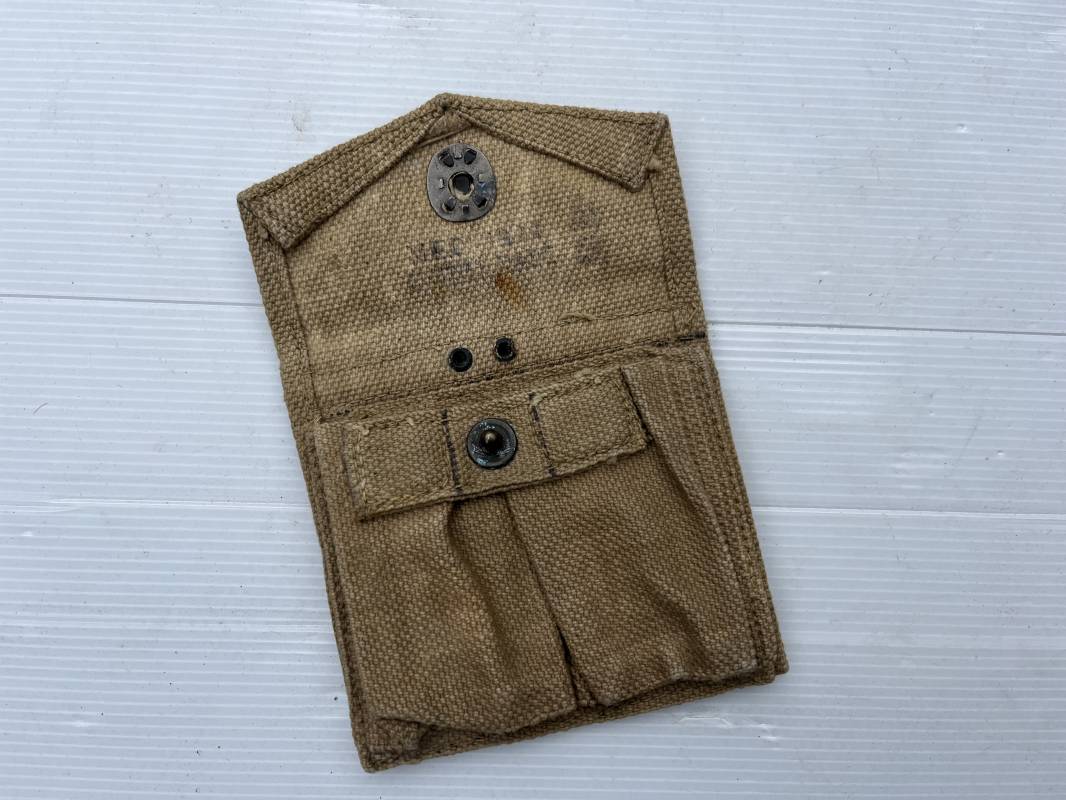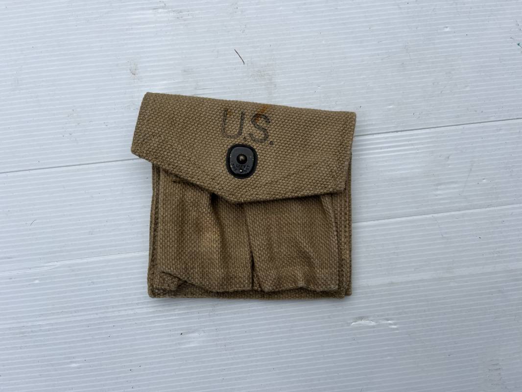 Pochette de deux chargeurs de carabine M1. Pochette en coton filé beige. Marquage fabricant British Made 1944 marqué US. Rabat avec boutons pression. Porté en bon état. Ref 19450