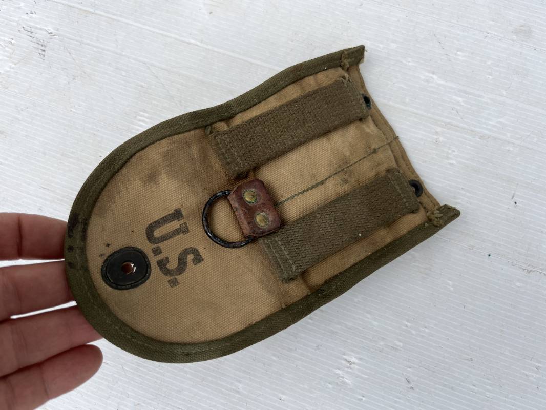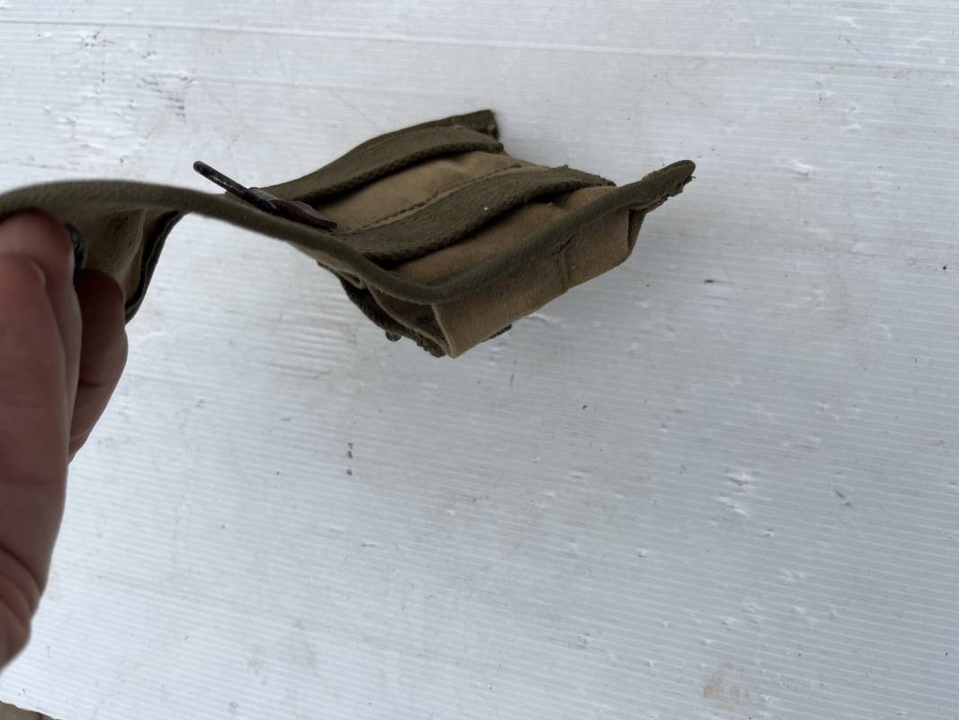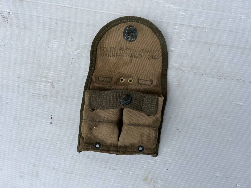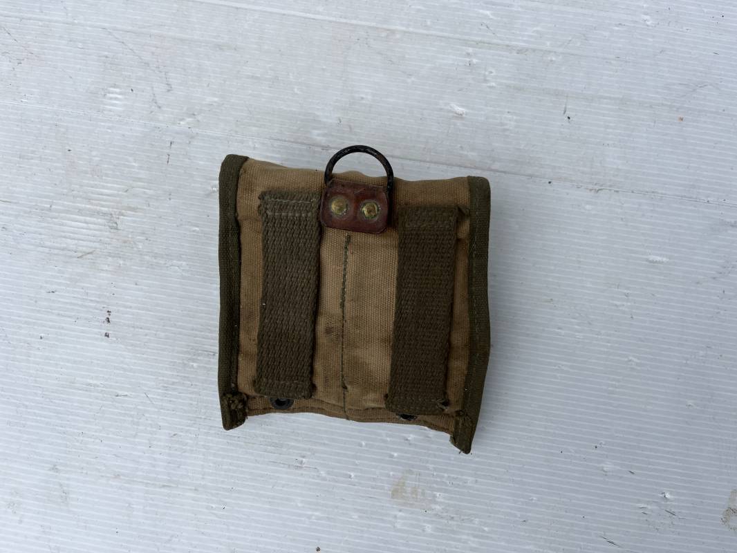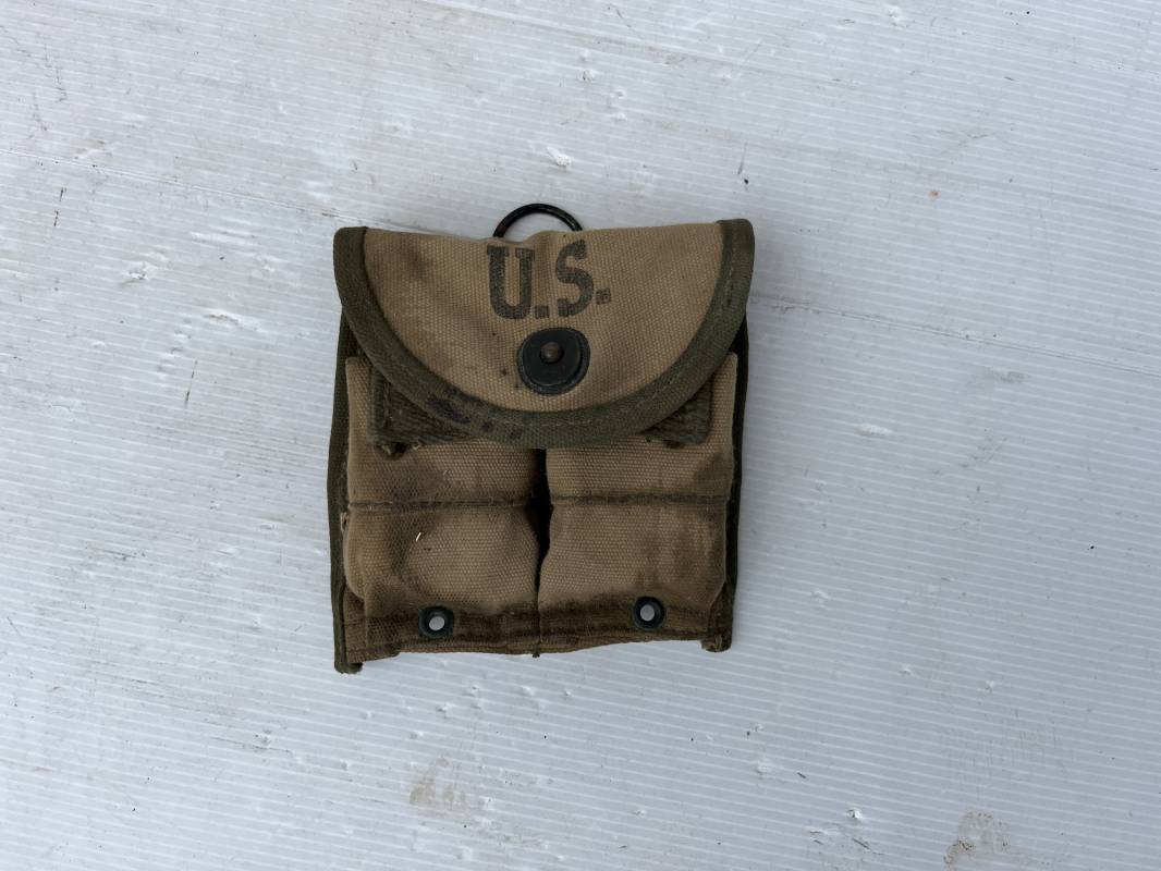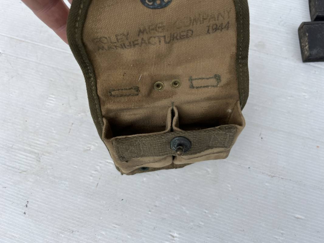 Pochette porte chargeurs modéle 1943 américaine pour la carabine USM1 . Pochette en toile OD Marquage fabricant daté 1944 . Modifié Armée Francaise par l ajout d un 'D' métallique riveté pour le port a la bretelle de suspension Port éen bel état Ref 19161