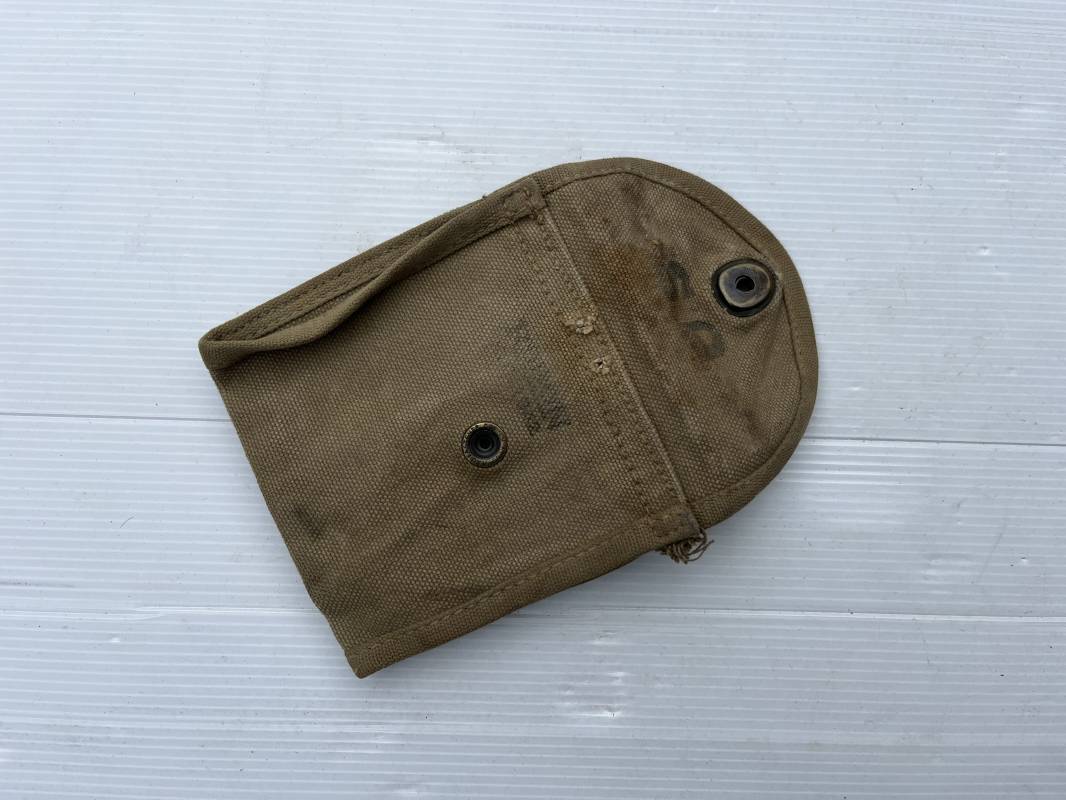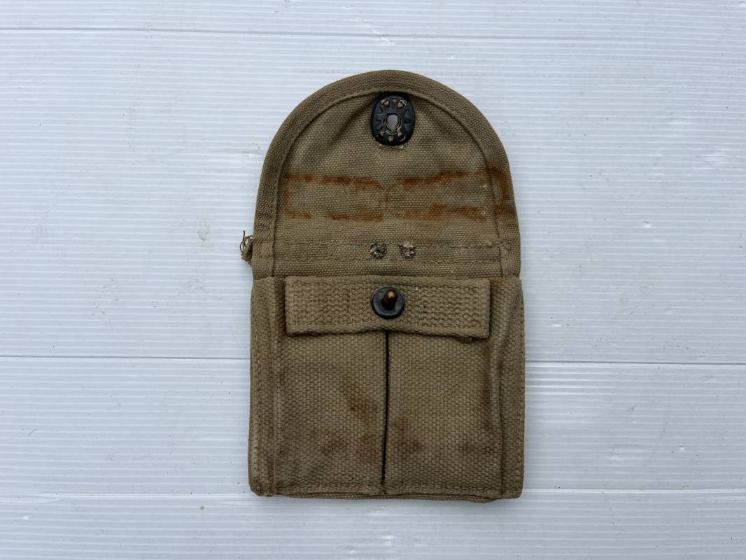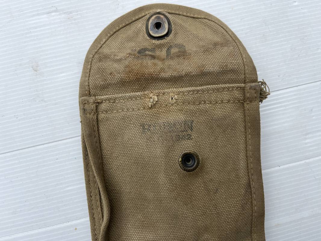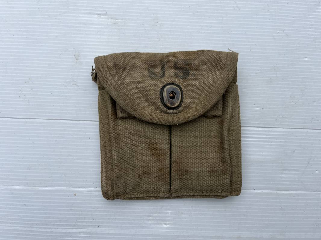 Pochette de deux chargeurs de carabine M1. Pochette en coton Olive Drab . Marquage fabricant au dos daté 1942 , marqué US. Rabat avec bouton pression.Porte chargeurs porté . Bon équipement terrain . Ref 18021