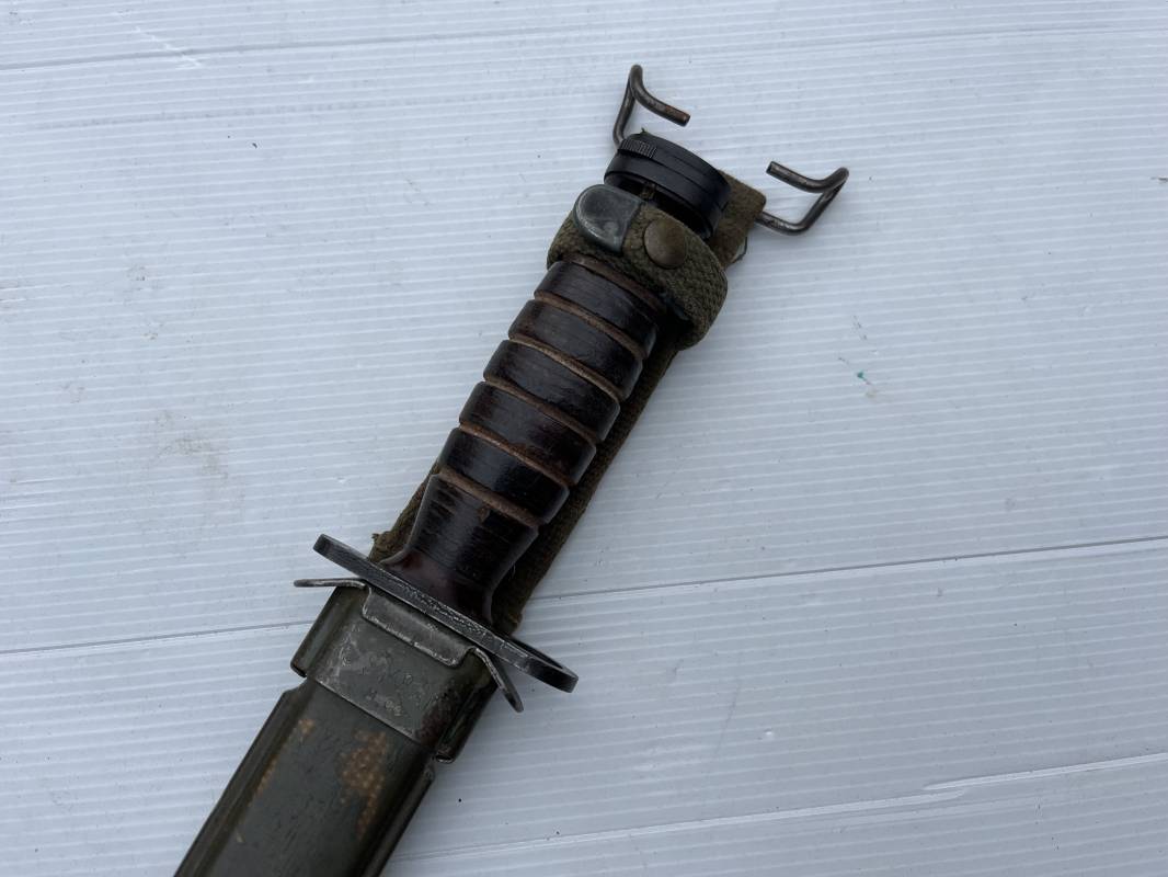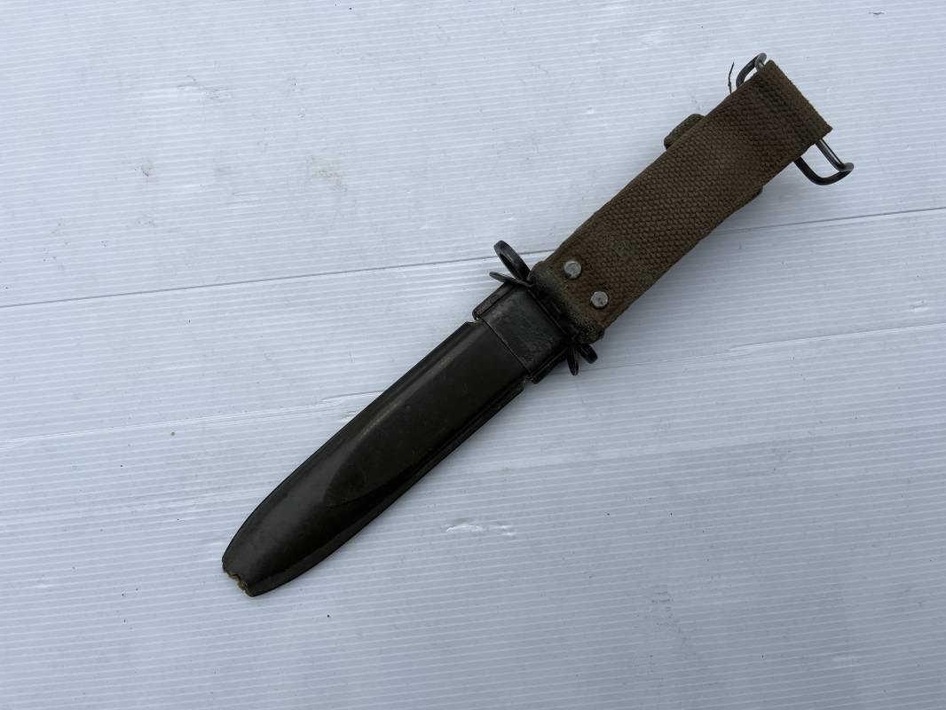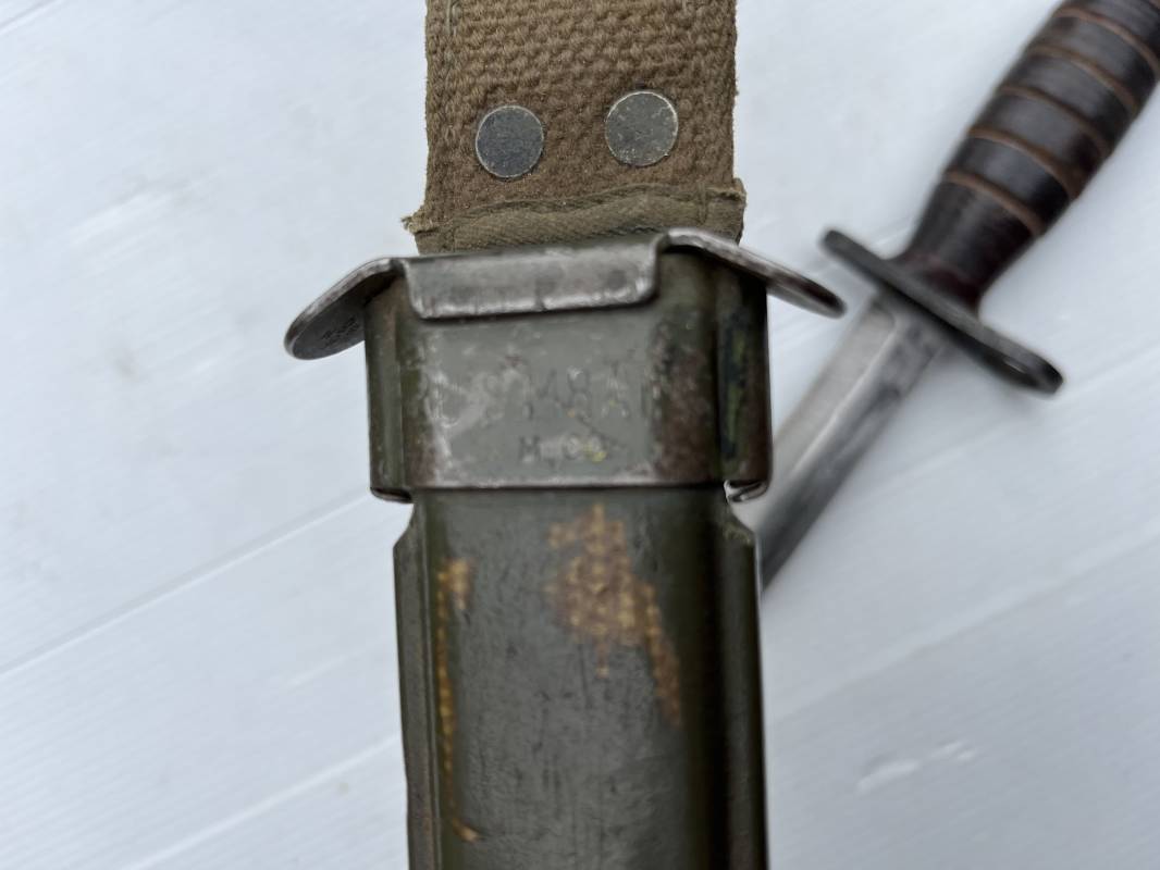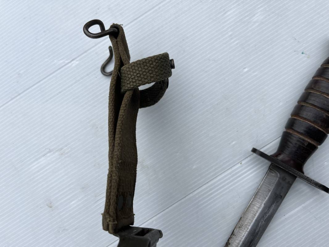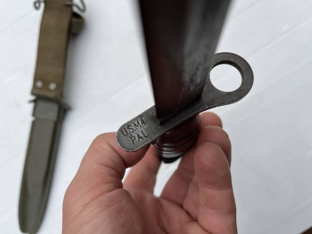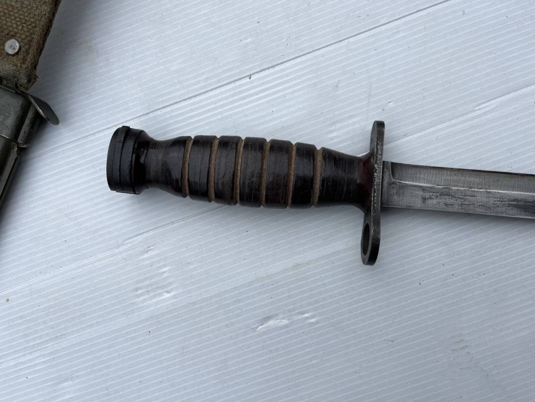 Trés beau poignard baionnette USM4 pour la carabince USM1 . Poignard aavec manche en cuir , pommeau acier avec pontet de fixation , garde plate marquage fabricant USM4 PAL . Lame bronzée . Fourreau en fibre ( petit manque au bout du fourreau ( voir photos ) Chape acier USM8A1 , passant de ceinturon en toile avec fermoir et pression . Crochet metallique de ceinturon . Bel ensemble en parfait état 1943/45 Ref 19608