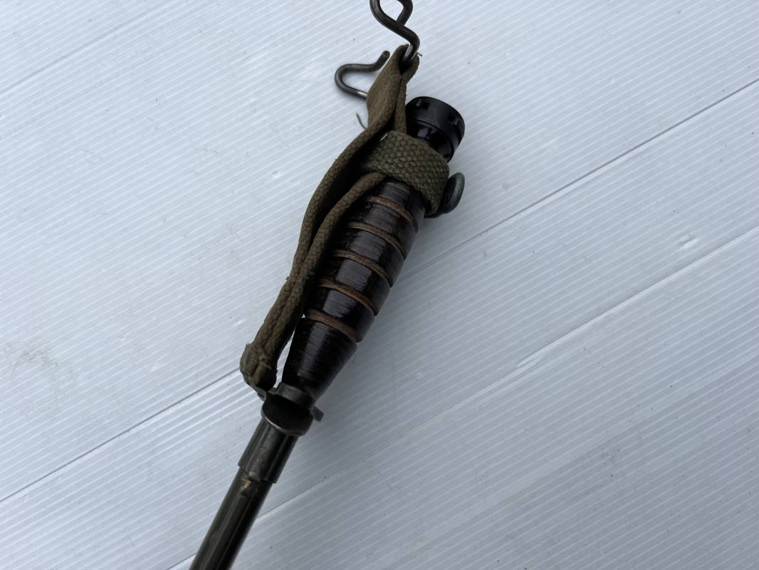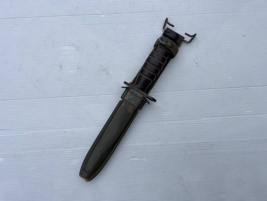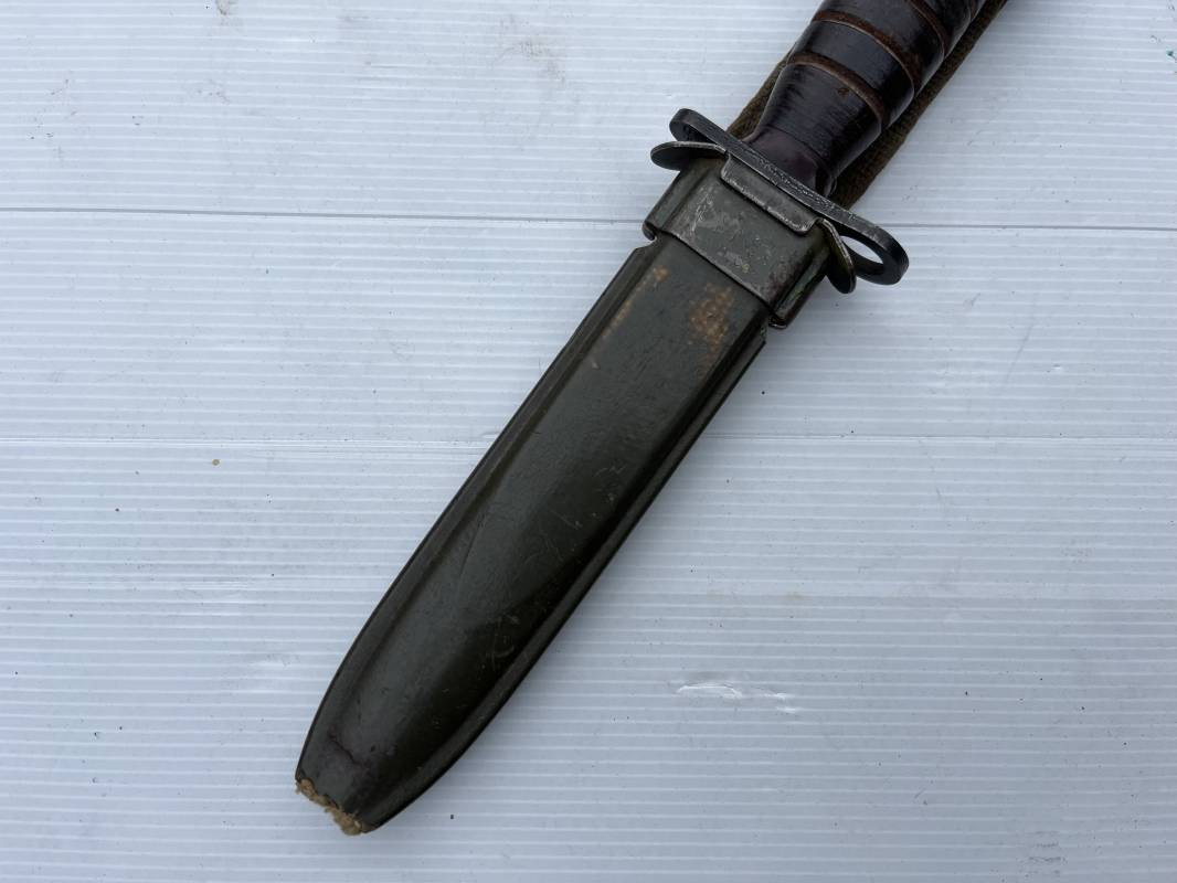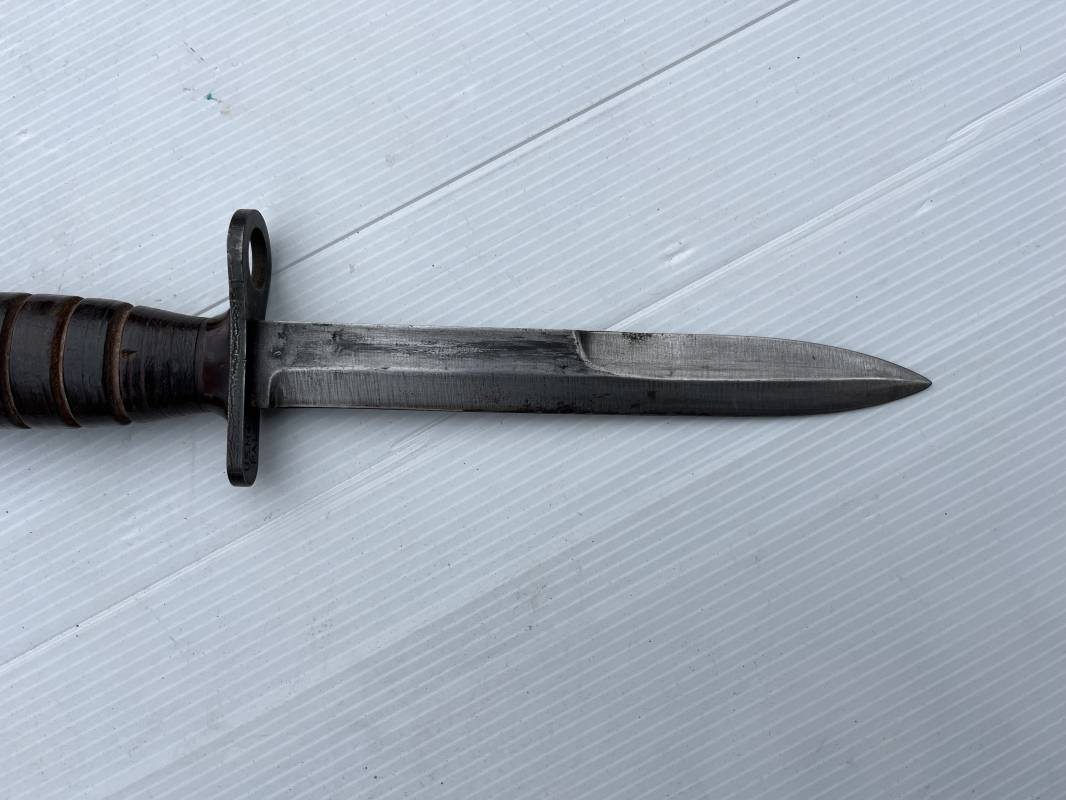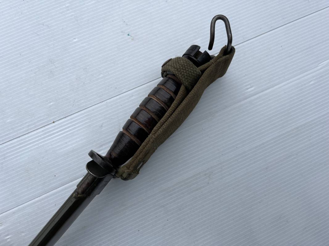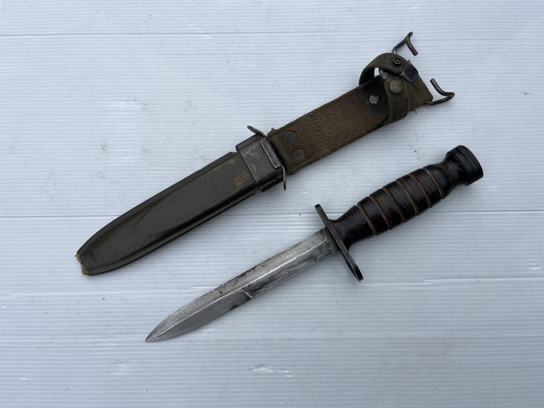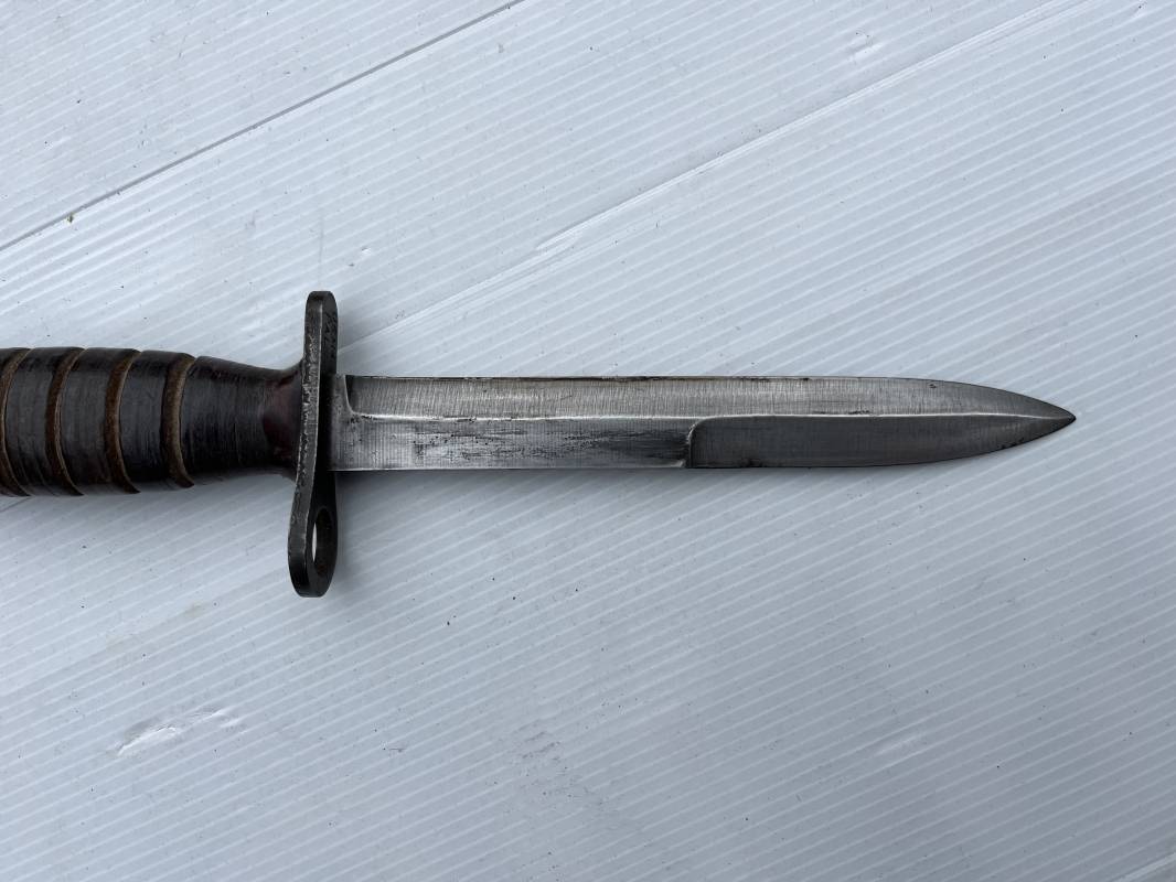Trés beau poignard baionnette USM4 pour la carabince USM1 . Poignard aavec manche en cuir , pommeau acier avec pontet de fixation , garde plate marquage fabricant USM4 PAL . Lame bronzée . Fourreau en fibre ( petit manque au bout du fourreau ( voir photos ) Chape acier USM8A1 , passant de ceinturon en toile avec fermoir et pression . Crochet metallique de ceinturon . Bel ensemble en parfait état 1943/45 Ref 19608