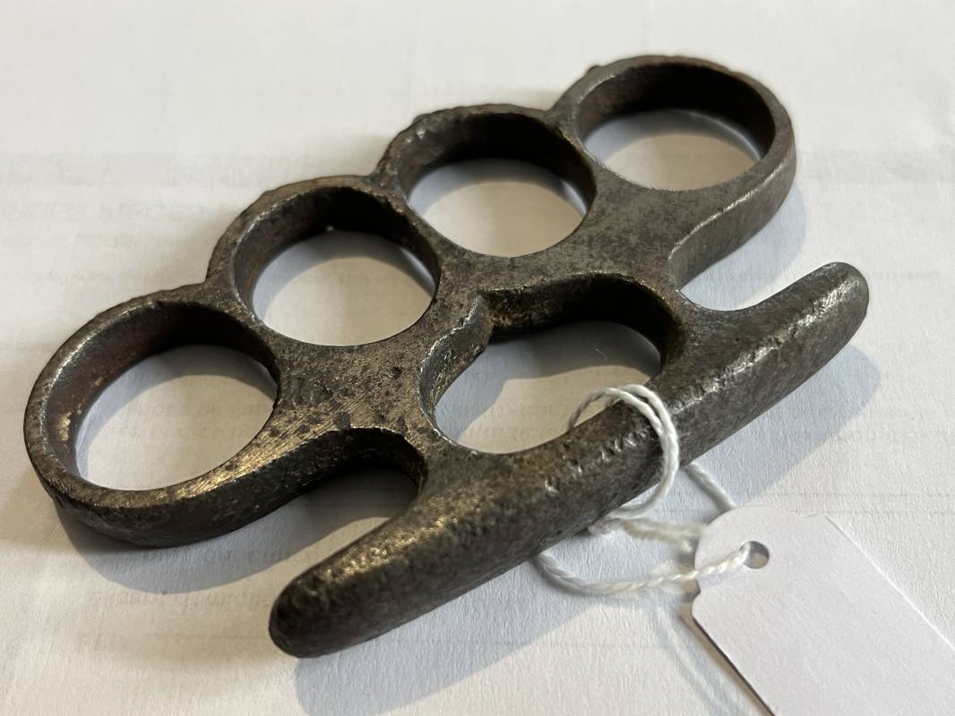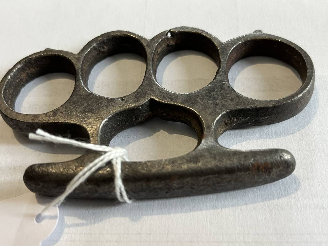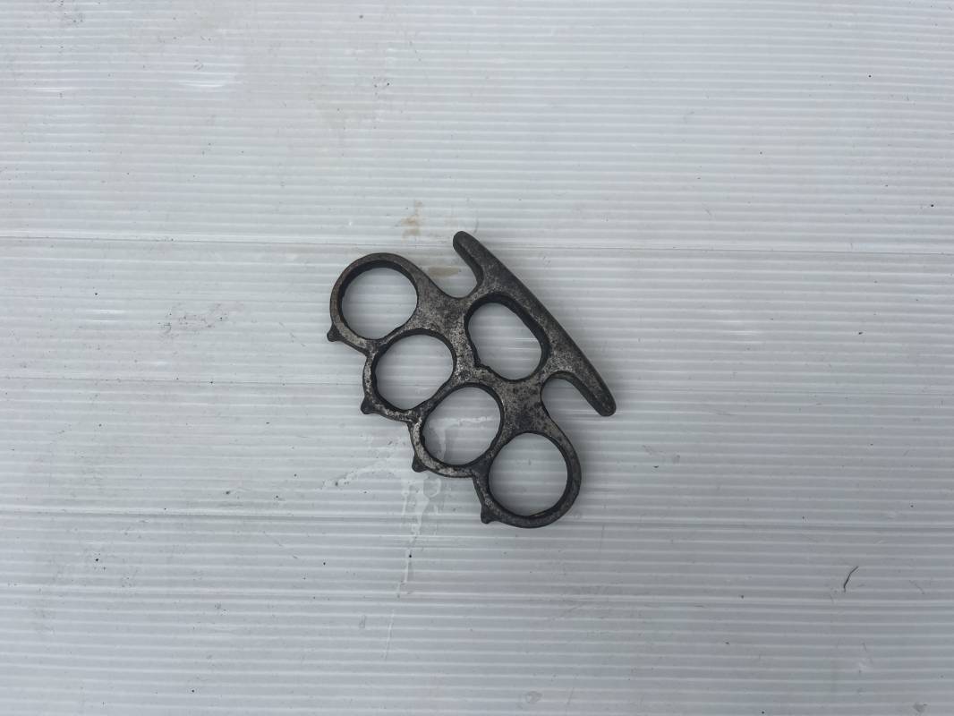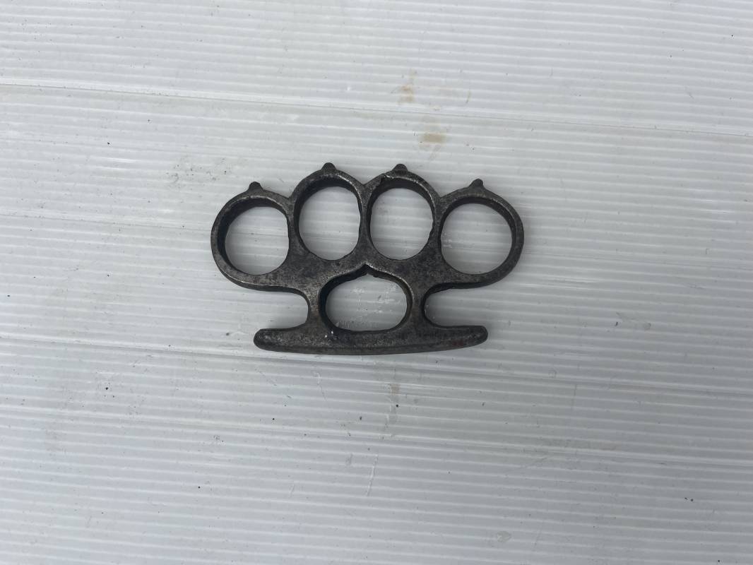 Poing américain en métal . Arme de corps a corps pour troupe d assaut américaine . . Métal brut . Ce poing a été trouvé en brocante en Normandie . Utilisé en bon état . Article vendu uniquement a client majeur . Ref 22001