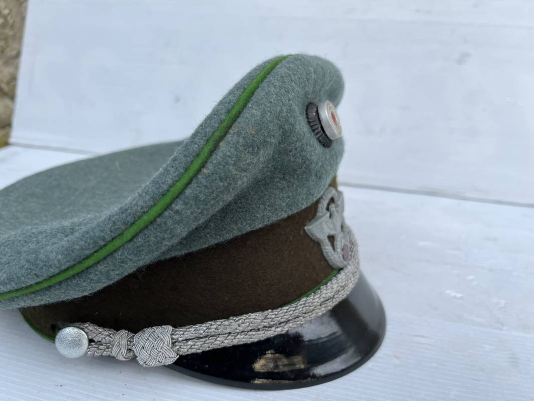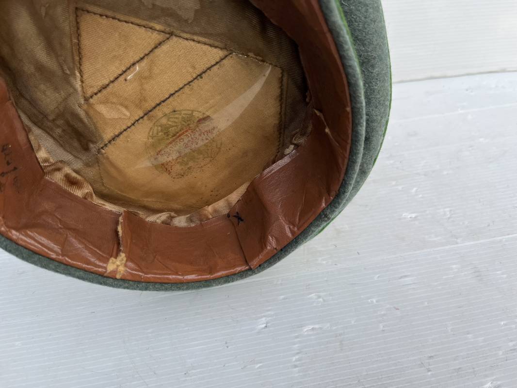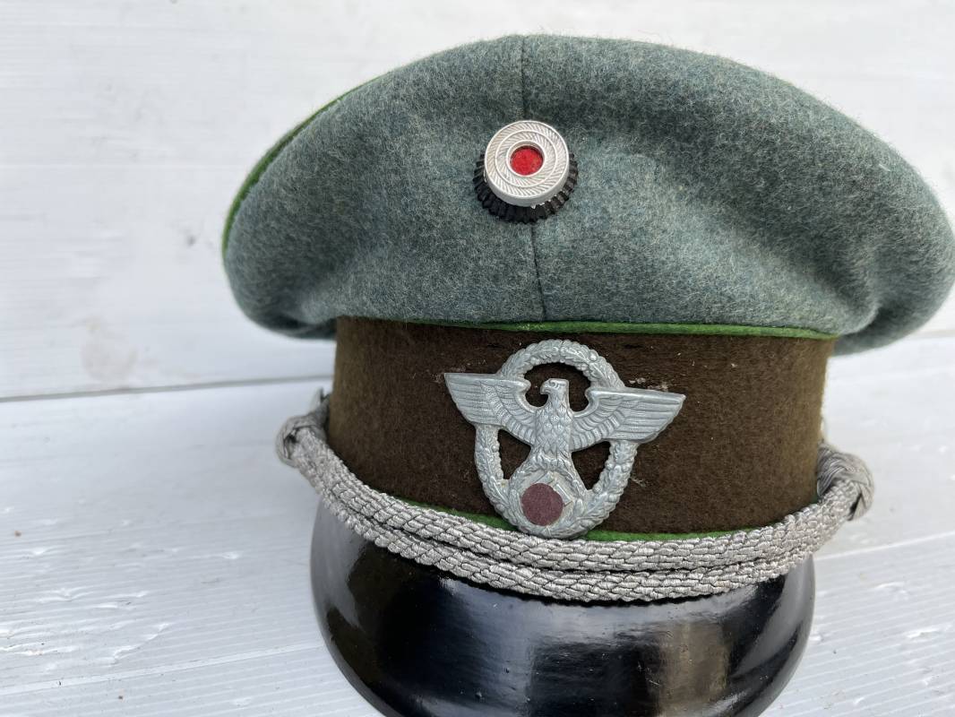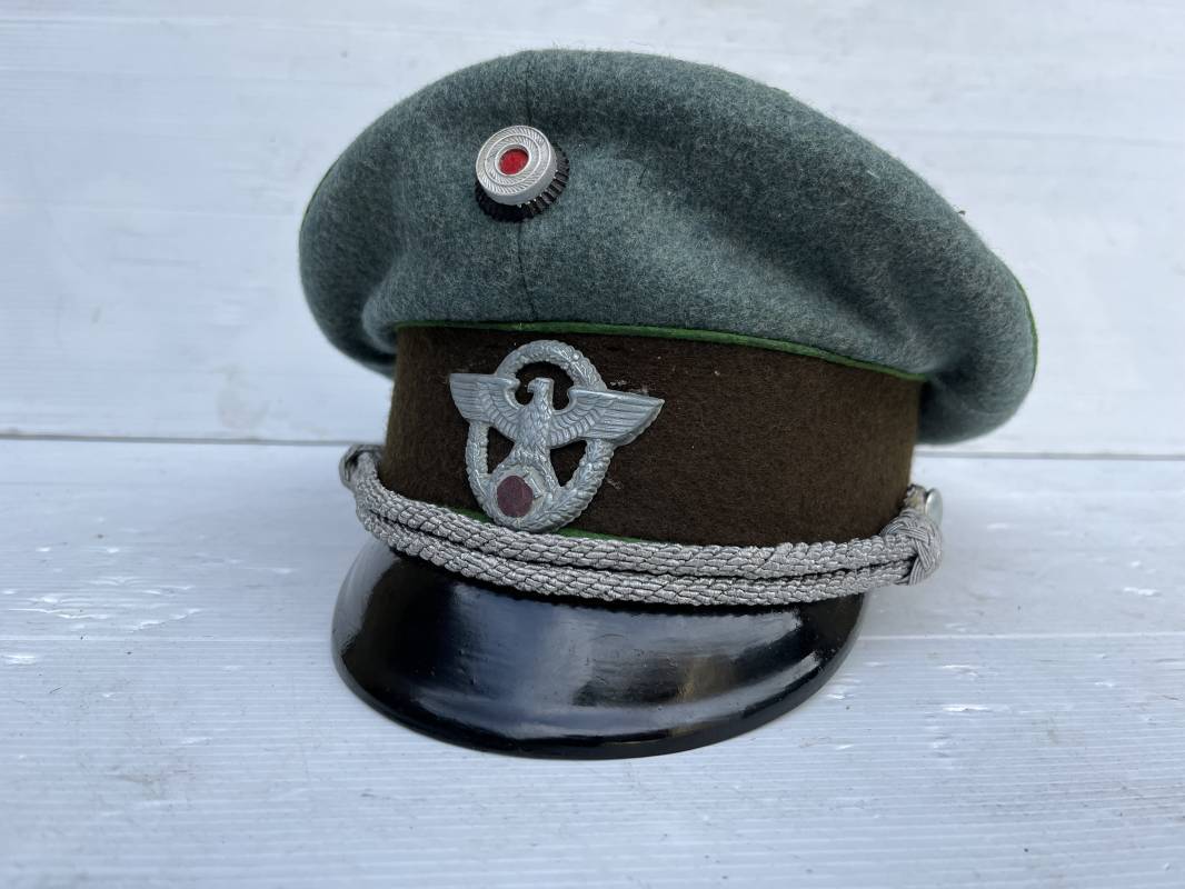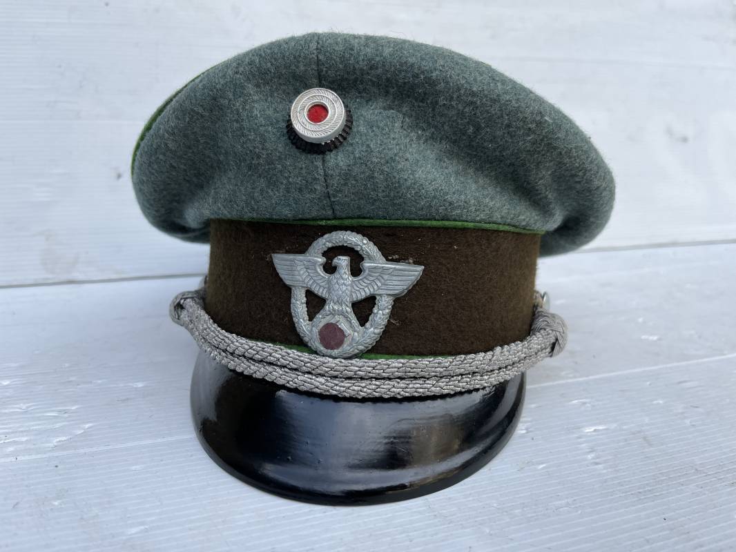 Belle casquette d'un officier de la Police. Casquette en drap 'vert police '. Liseré vert de la Polizei. Cocarde métallique. Aigle en zinc. Bandeau de coiffe extèrieur en drap marron foncé. Jugulaire torsadée d'officier . Belle forme haute et rigide. Visière en fibre noire vulcanisée, revers guilloché crème. Intèrieur doublé en satinette dorée .Rhodoid Marquage fabricant et logo . Taille 55. Bandeau de coiffe intèrieur en carton cuir ( alkor) marron clair. Casquette légèrement portée en bel état 1940/45. Ref 19786