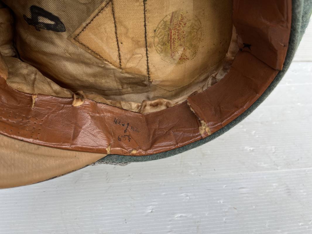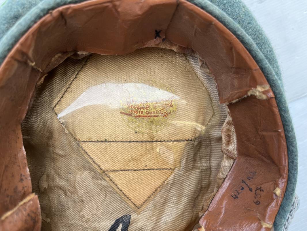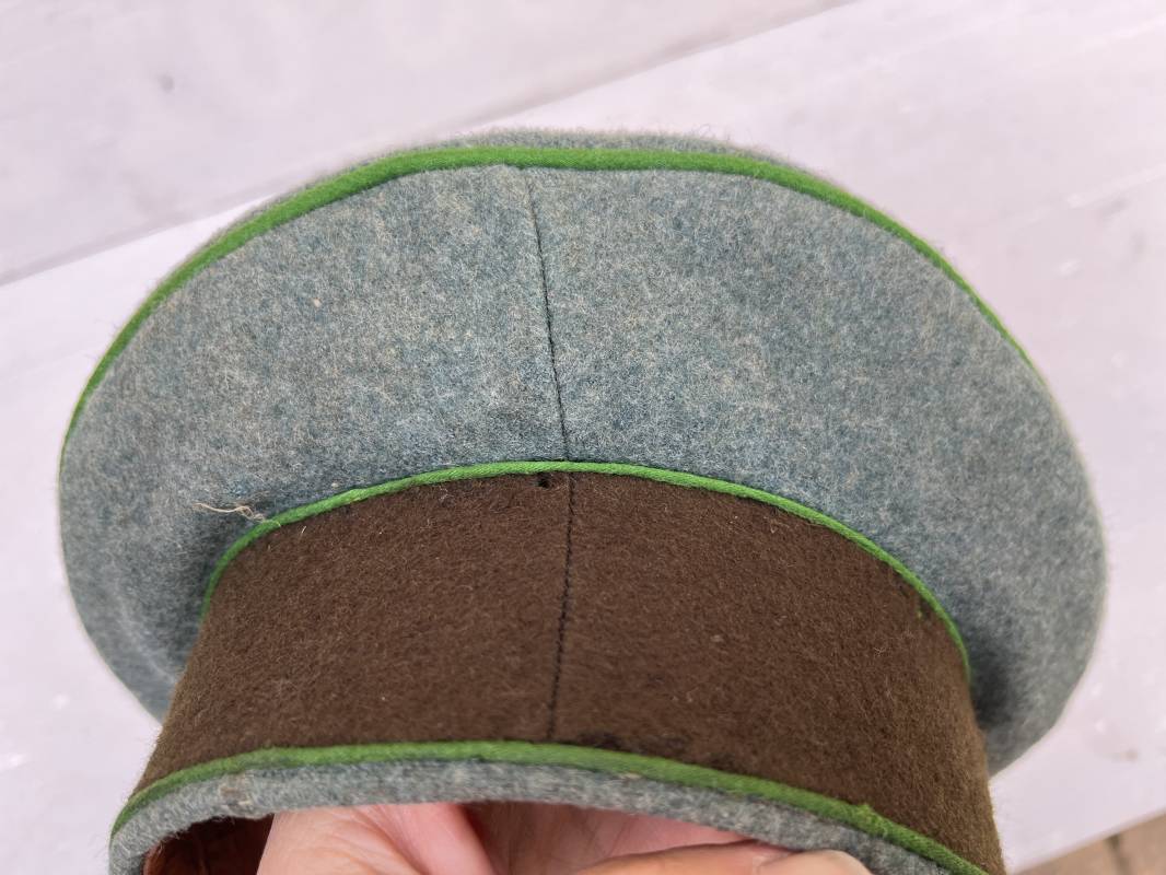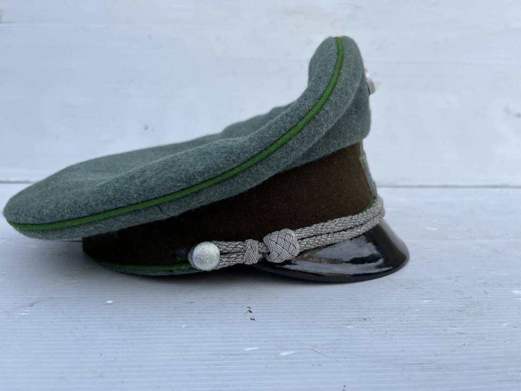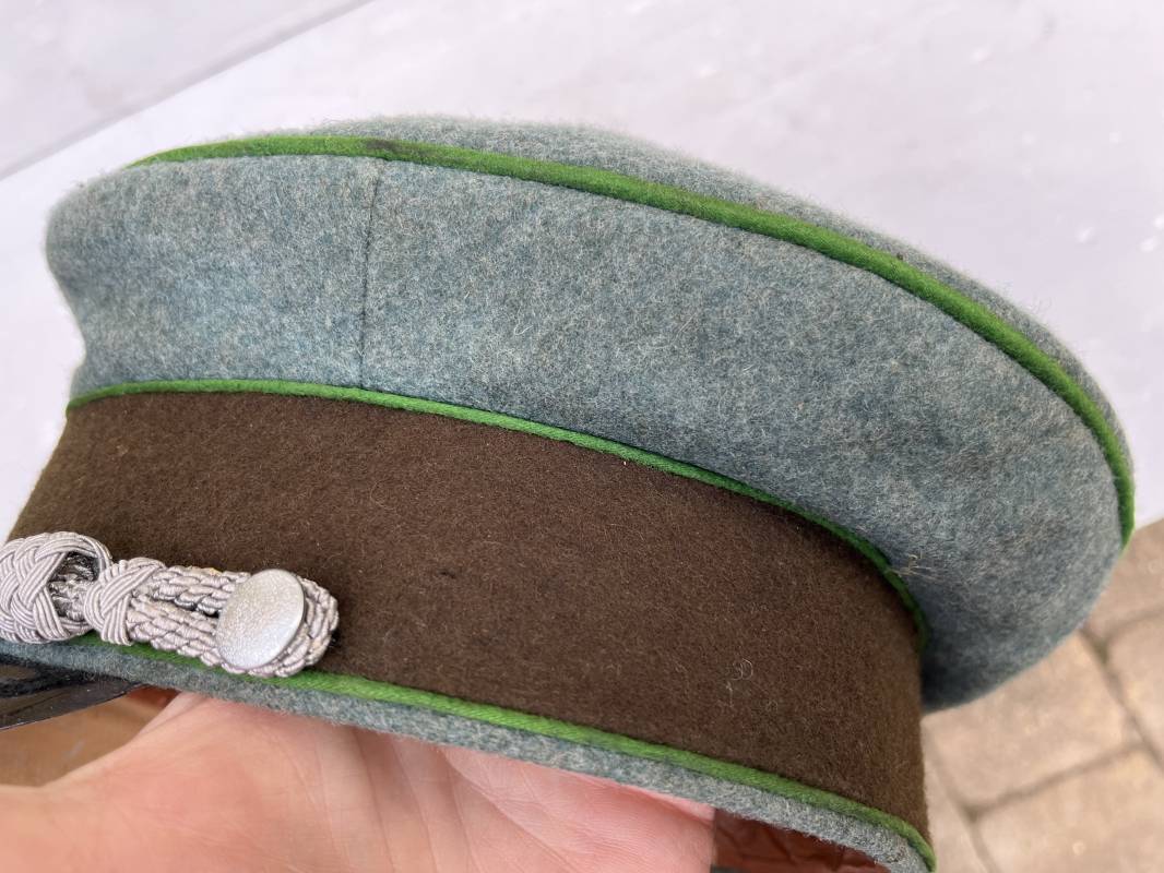 Belle casquette d'un officier de la Police. Casquette en drap 'vert police '. Liseré vert de la Polizei. Cocarde métallique. Aigle en zinc. Bandeau de coiffe extèrieur en drap marron foncé. Jugulaire torsadée d'officier . Belle forme haute et rigide. Visière en fibre noire vulcanisée, revers guilloché crème. Intèrieur doublé en satinette dorée .Rhodoid Marquage fabricant et logo . Taille 55. Bandeau de coiffe intèrieur en carton cuir ( alkor) marron clair. Casquette légèrement portée en bel état 1940/45. Ref 19786