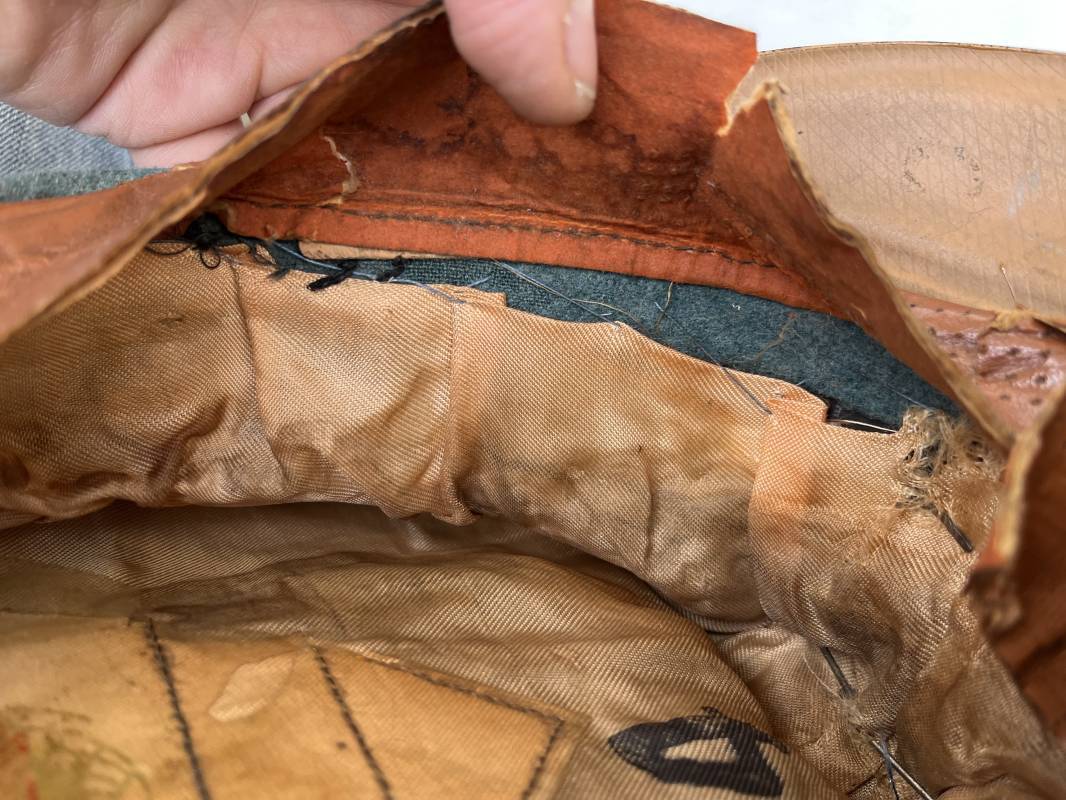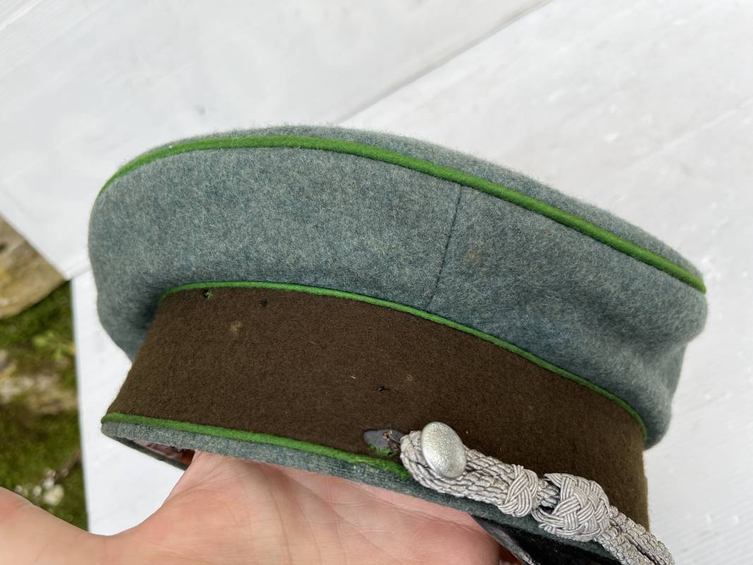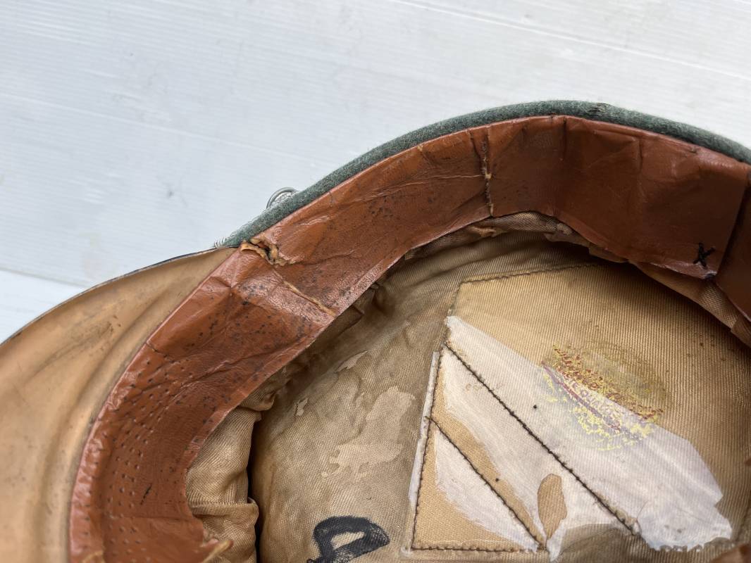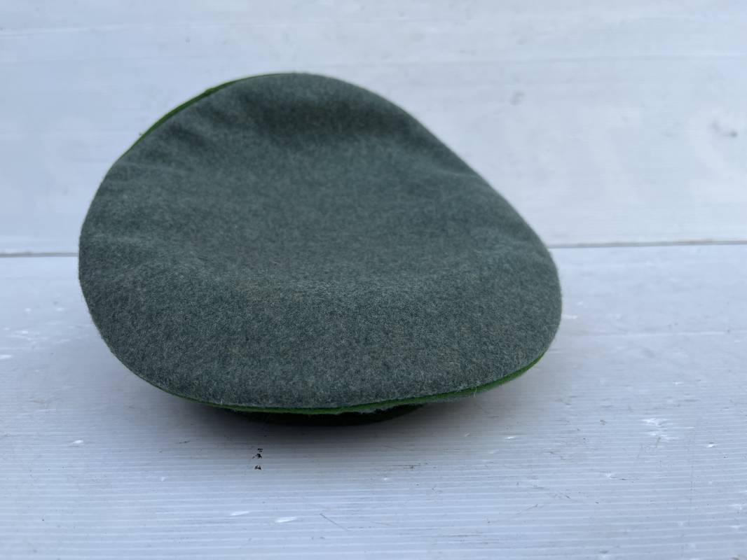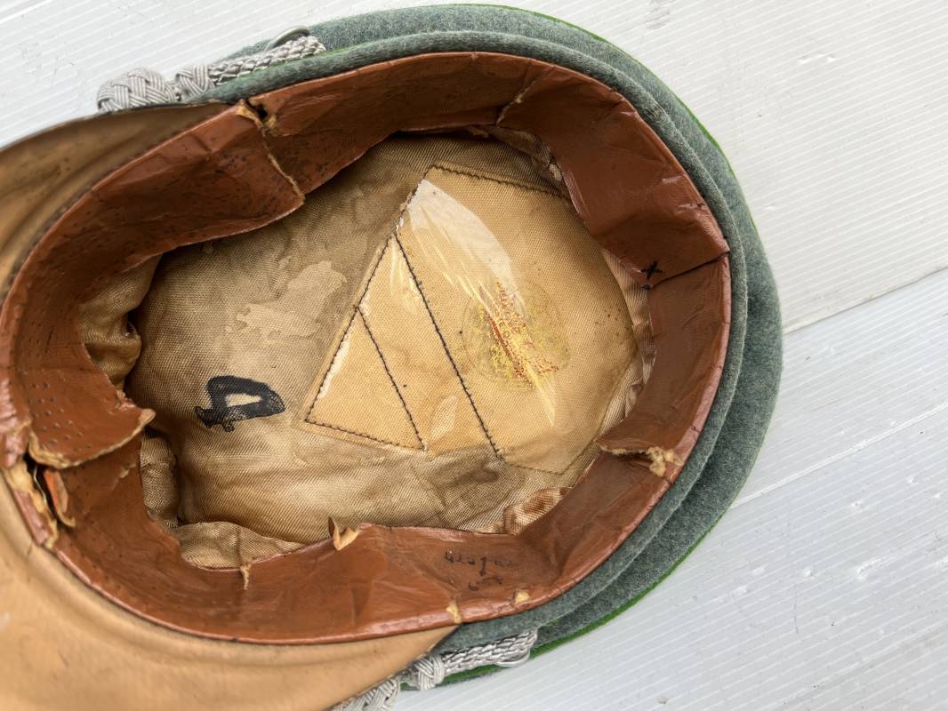 Belle casquette d'un officier de la Police. Casquette en drap 'vert police '. Liseré vert de la Polizei. Cocarde métallique. Aigle en zinc. Bandeau de coiffe extèrieur en drap marron foncé. Jugulaire torsadée d'officier . Belle forme haute et rigide. Visière en fibre noire vulcanisée, revers guilloché crème. Intèrieur doublé en satinette dorée .Rhodoid Marquage fabricant et logo . Taille 55. Bandeau de coiffe intèrieur en carton cuir ( alkor) marron clair. Casquette légèrement portée en bel état 1940/45. Ref 19786