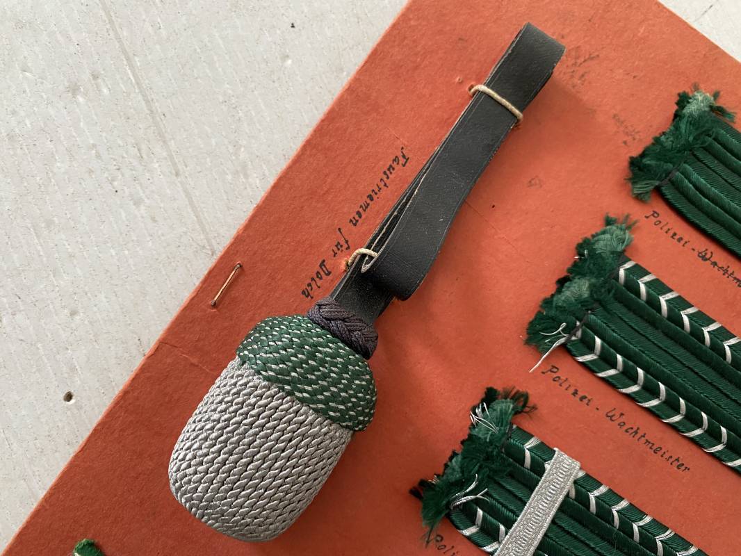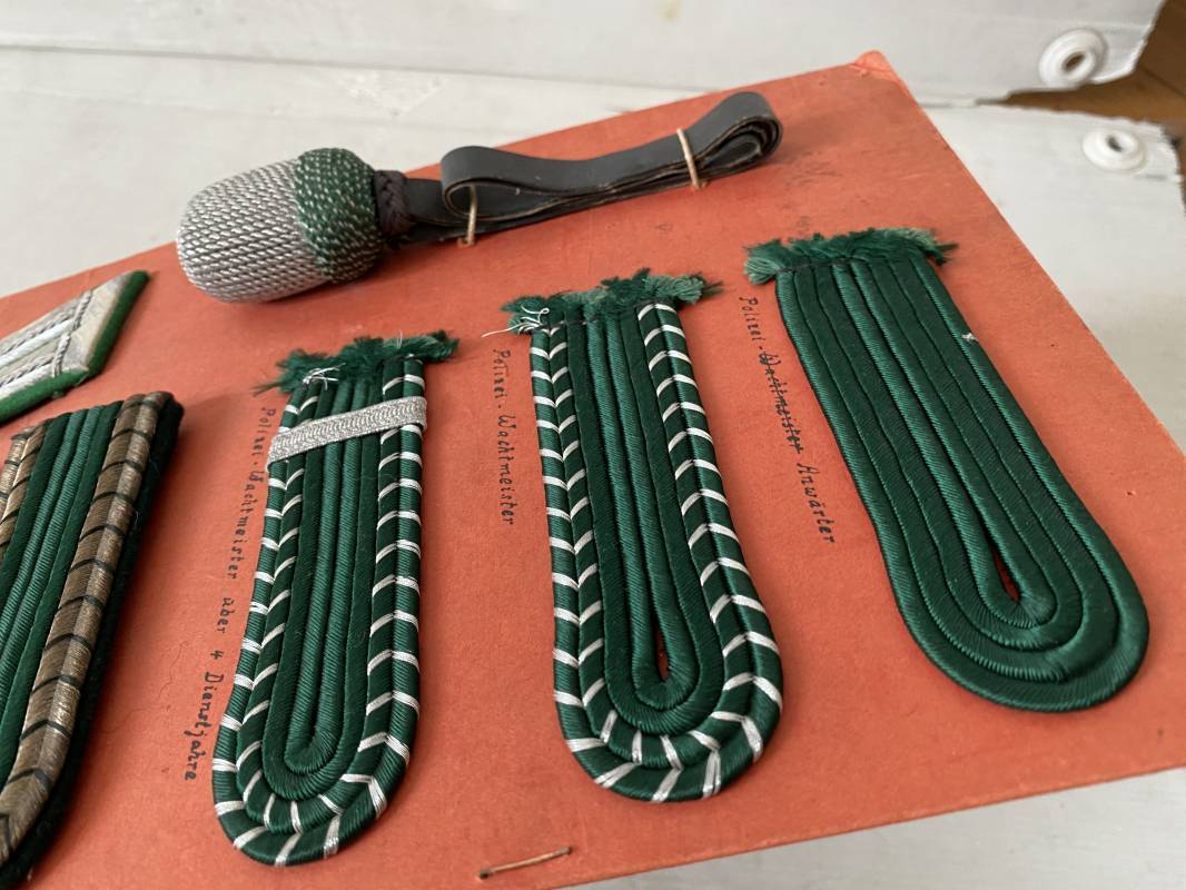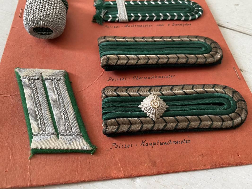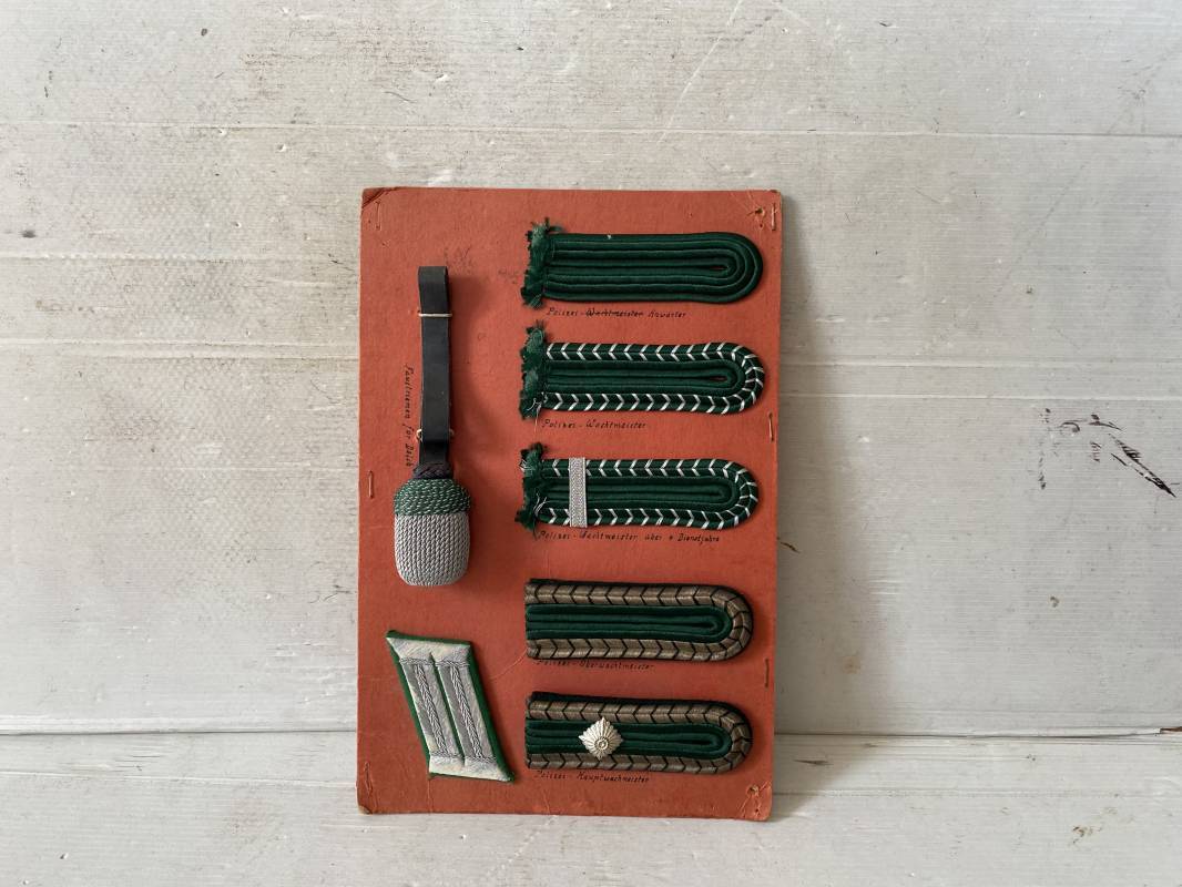 Planche pédagogique à grades de la Polizei. Carton d'origine de présentation des grades de la Polizei. Planche carton 20x30cm qui comprend : 5 pattes d'épaules, un coin de col (Litzen) et une dragonne de sous officier. Annotations manuscrites des différents grades et insignes . Belle planche 1935/45. Ref 15932
