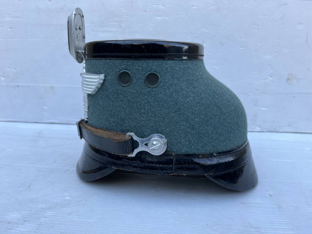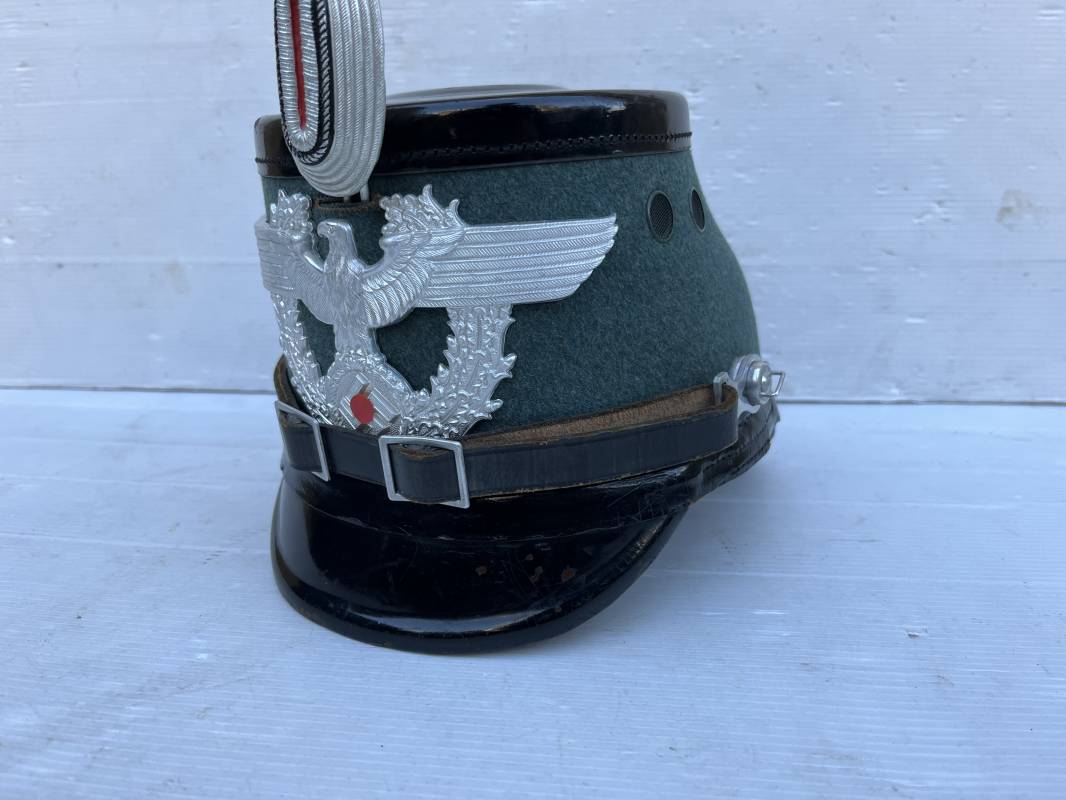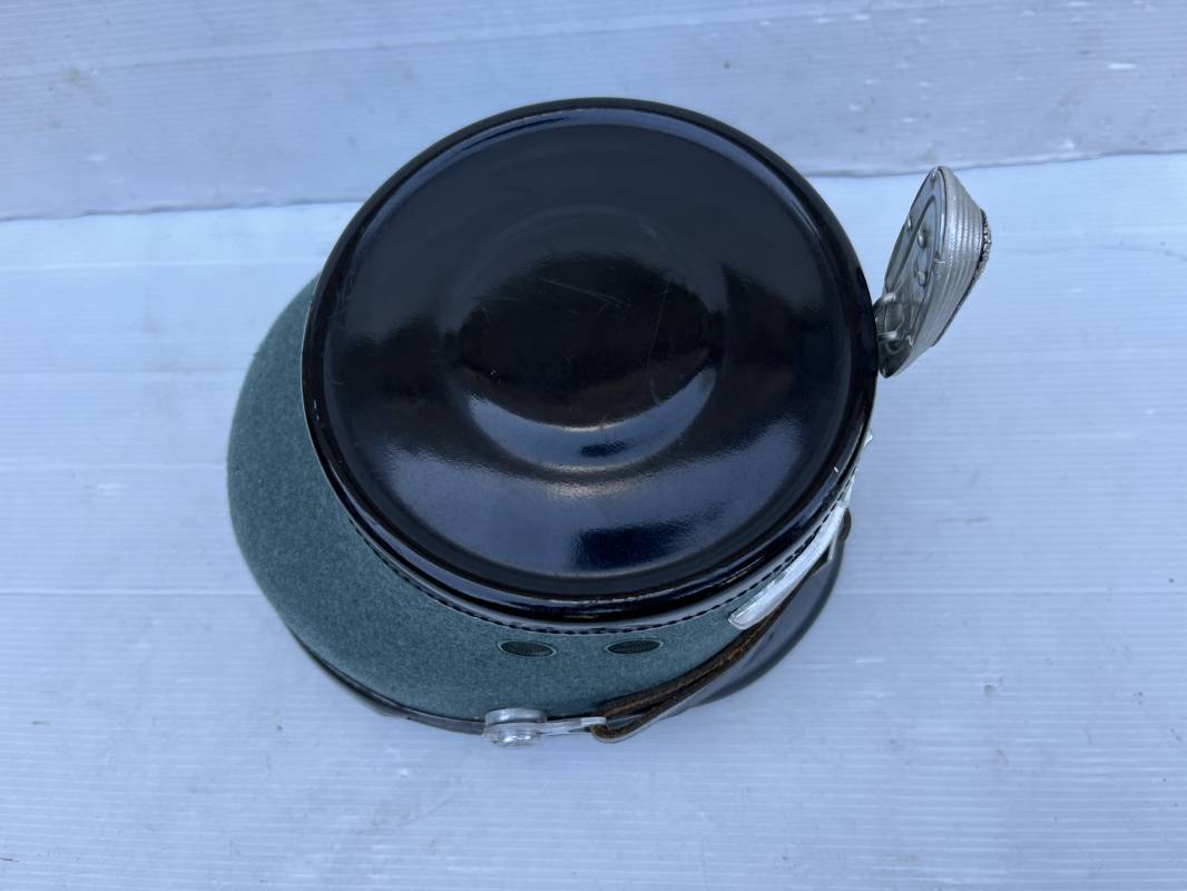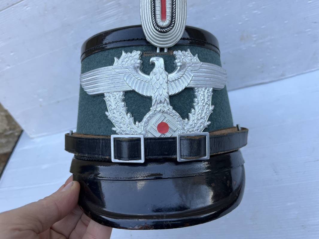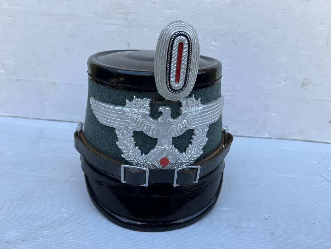 Trés beau shako troupe de la police allemande . Shako en fibre vulcanisée noire recouvert pour partie de drap fin ' vert police '. Aigle frontal à relief en alu , fixation par deux visses . Visière et nuquière en fibre . Cocarde amovible en alu marquage fabricant au dos et DRGM 1938 . Oeillets grillagés de ventilation .Jugulaire en cuir noir avec boucles et crochets en alu . Intérieur bandeau cuir naturel de couleur fauve , lacet en cuir marquage encre noire sous la coiffe 1938 . Cuir trés souple . Taille 56 . Tampon encre noire dans la coiffe intérieur n ° Matricule 43/832 . Shako légérement porté en parfait état Trés belle coiffure , définitive en collection , aucun défaut 1935/45 Ref 19273