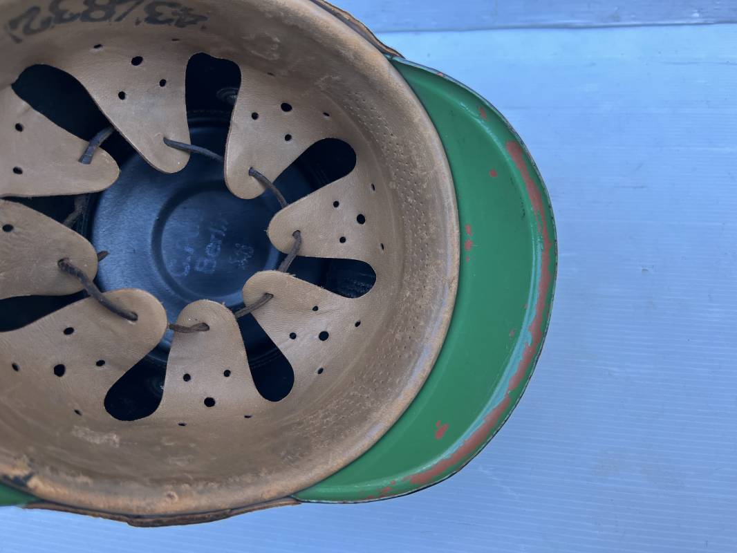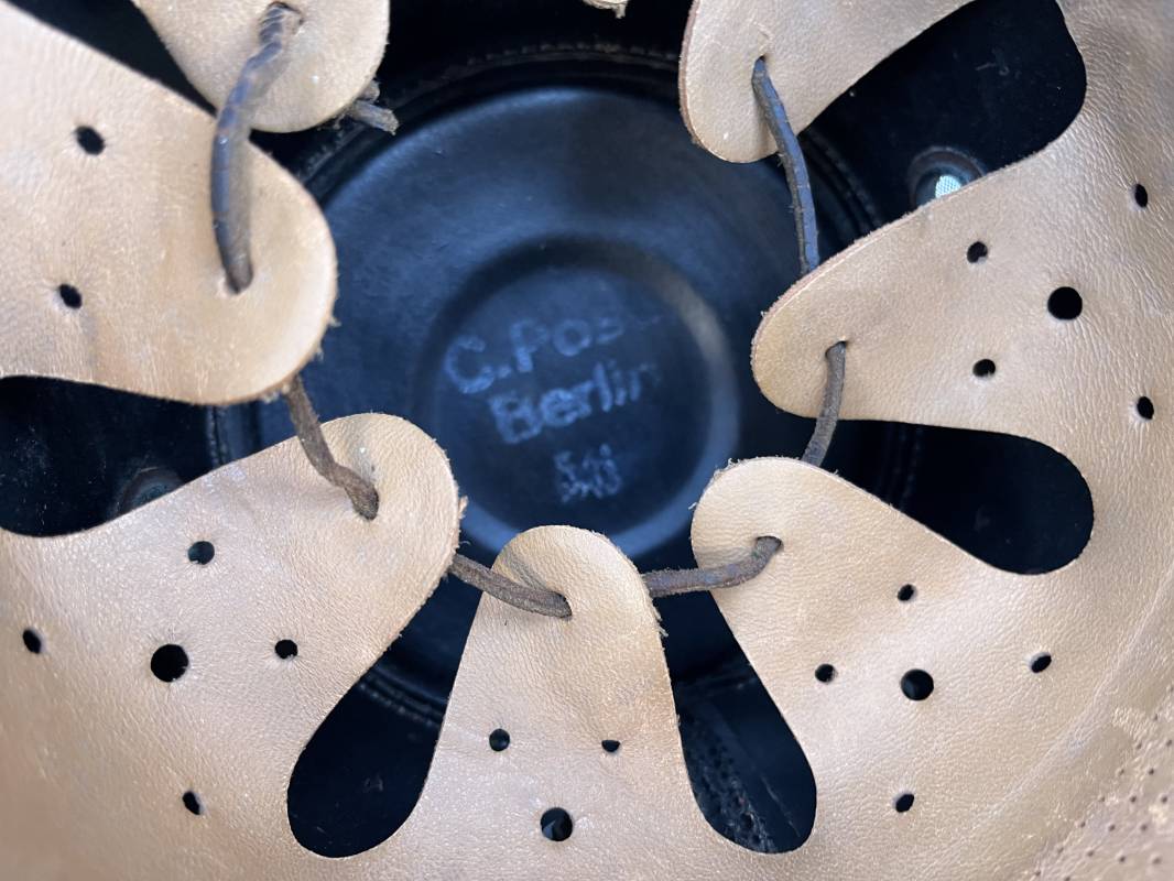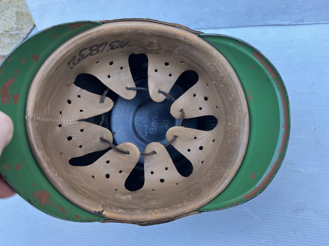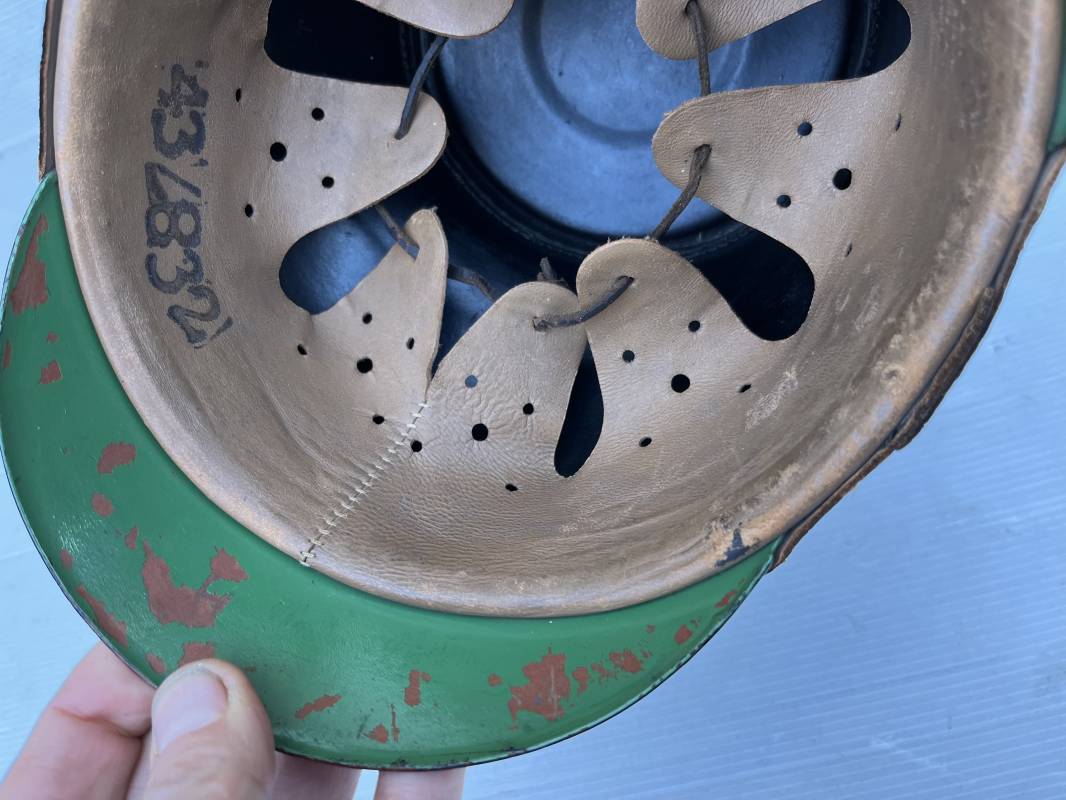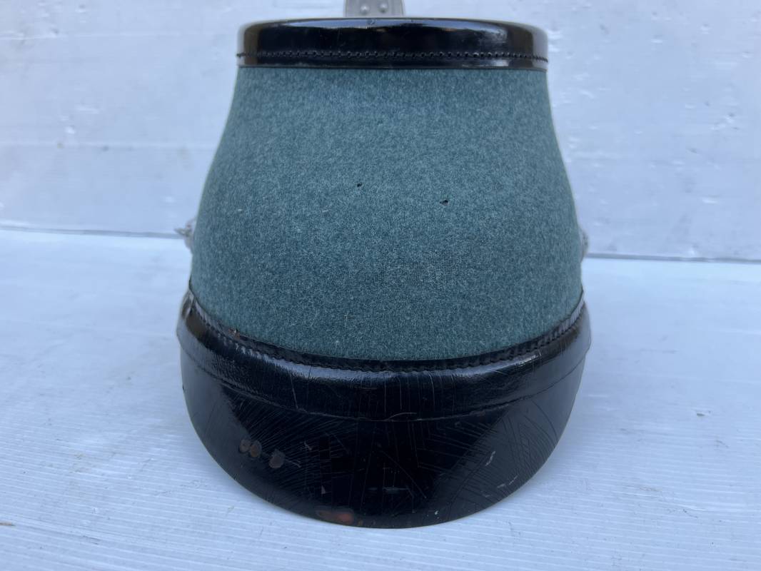 Trés beau shako troupe de la police allemande . Shako en fibre vulcanisée noire recouvert pour partie de drap fin ' vert police '. Aigle frontal à relief en alu , fixation par deux visses . Visière et nuquière en fibre . Cocarde amovible en alu marquage fabricant au dos et DRGM 1938 . Oeillets grillagés de ventilation .Jugulaire en cuir noir avec boucles et crochets en alu . Intérieur bandeau cuir naturel de couleur fauve , lacet en cuir marquage encre noire sous la coiffe 1938 . Cuir trés souple . Taille 56 . Tampon encre noire dans la coiffe intérieur n ° Matricule 43/832 . Shako légérement porté en parfait état Trés belle coiffure , définitive en collection , aucun défaut 1935/45 Ref 19273