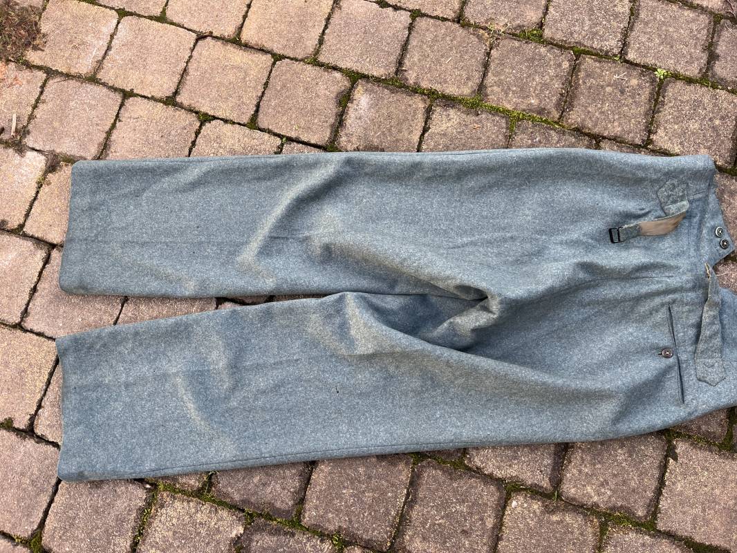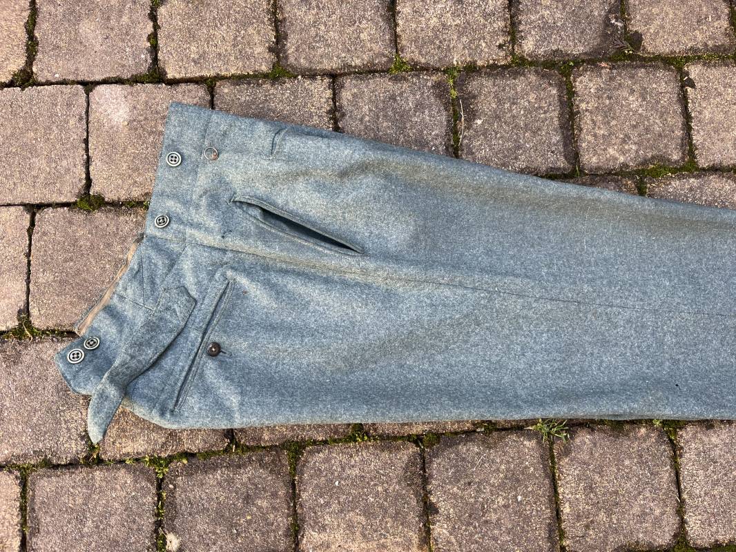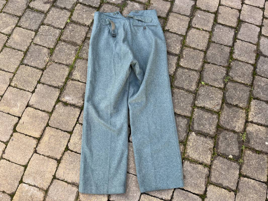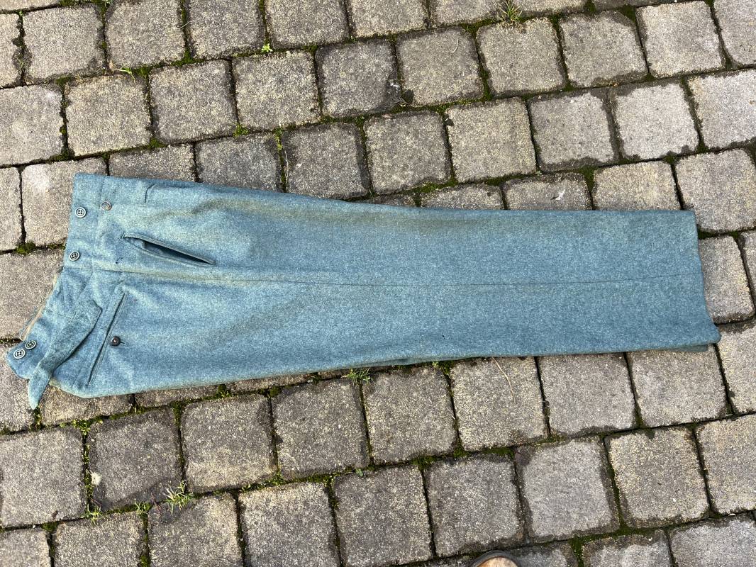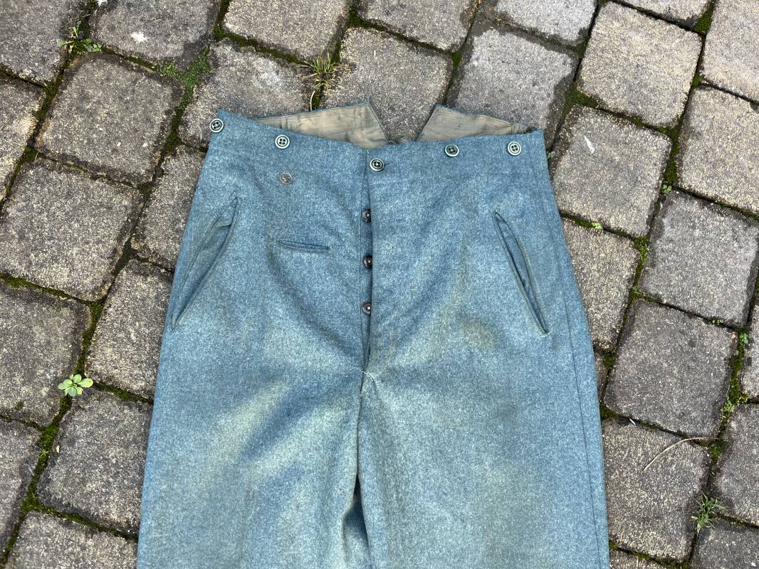 Beau pantalon troupe modele 1936 de la police ou gendarmerie en drap vert . Pantalon de dotation . Trois poches dont une fessière . Poche a gousset . Martingale dans le dos . Boutons en bakélite vert cousus d origine . Martingale et boucle métallique . Intérieur doublé en satinette gris vert , poches en coton blanc . Marquages encre fabricant H Hillgen . Drap frais , légérement porté en bel état Taille 40 Longueur 107 cm . Beau pantalon de dotation de la Schutzpolizei ou gendarmerie allemande . 1935/45 Ref 21768