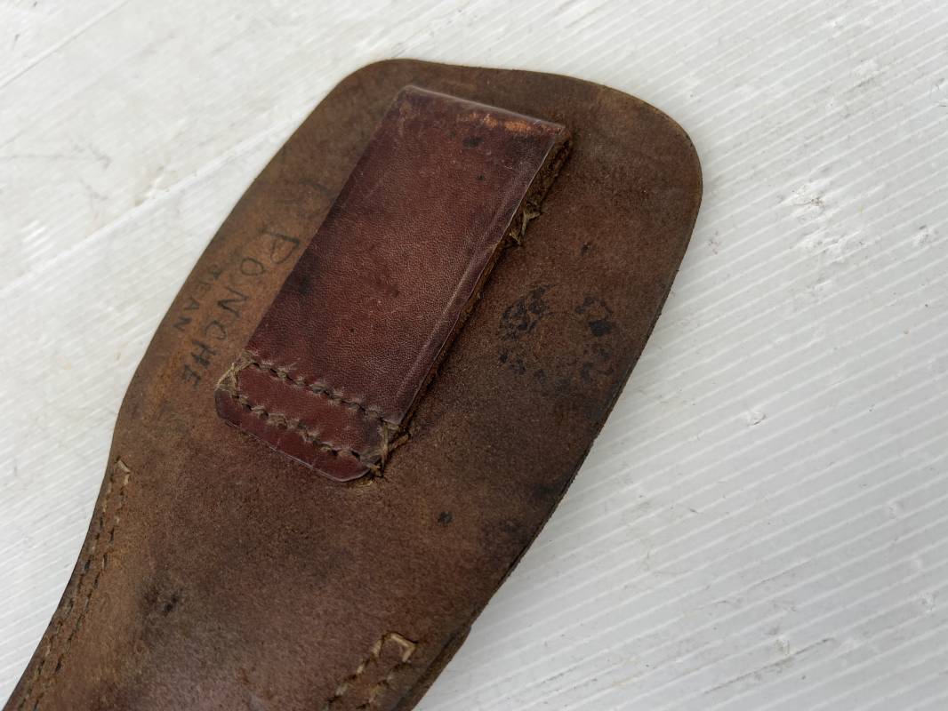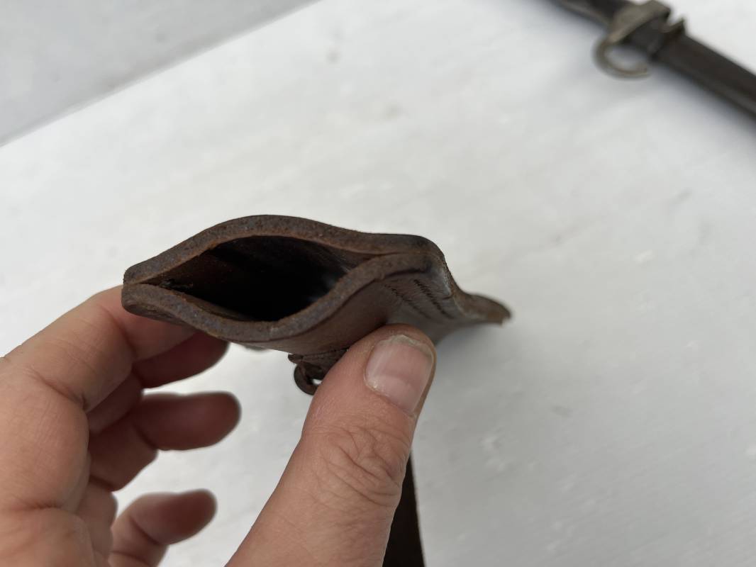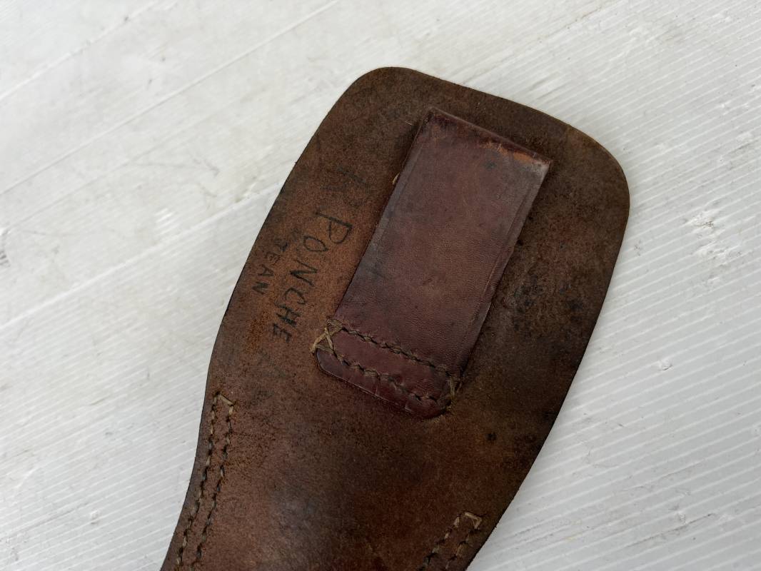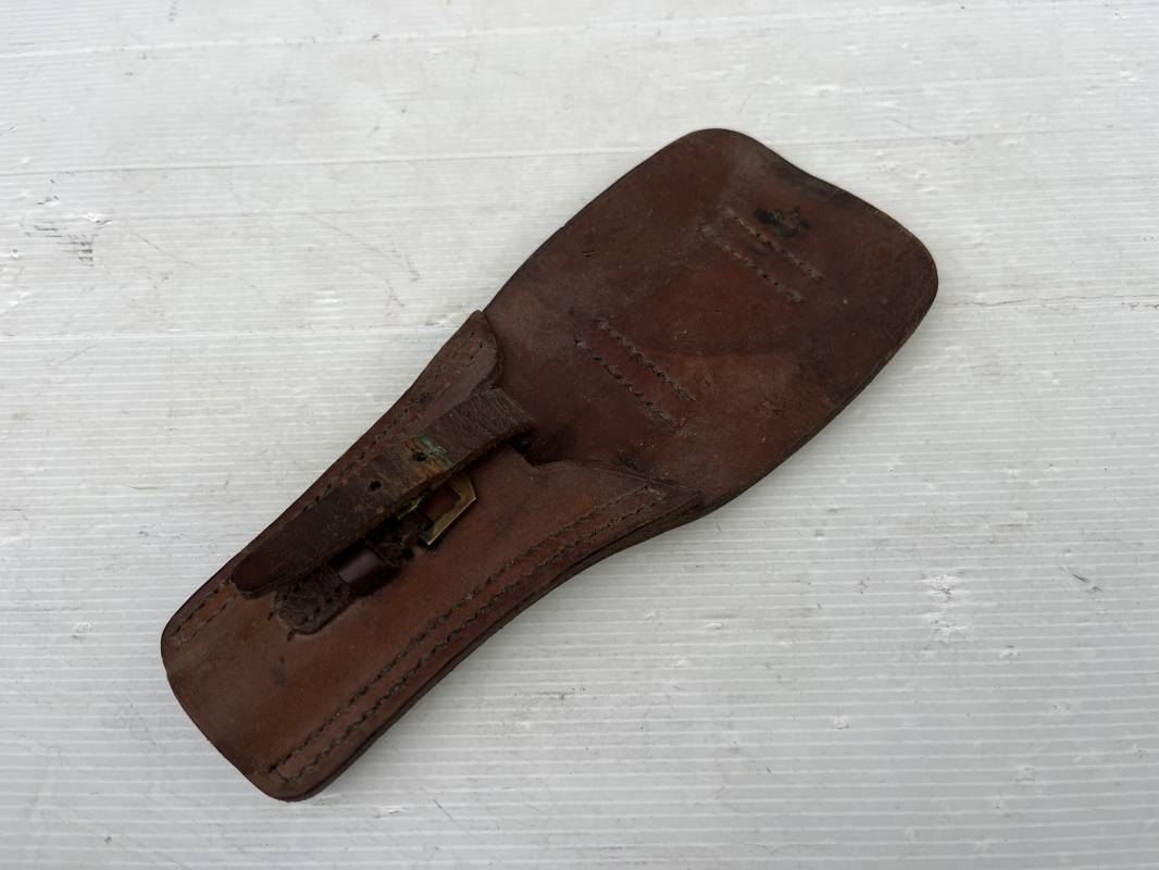 Gousset pour baionnette modèle 1892 du fusil mousqueton. Porte baionnette en cuir marron, passant cuir de ceinturon. Lanière cuir et boucle laiton à un ardillon, cuir souple. Tampon rond de fabricant . Nom du soldat manuscri sur le derrière . Légérement porté en bel état . Ref 19118