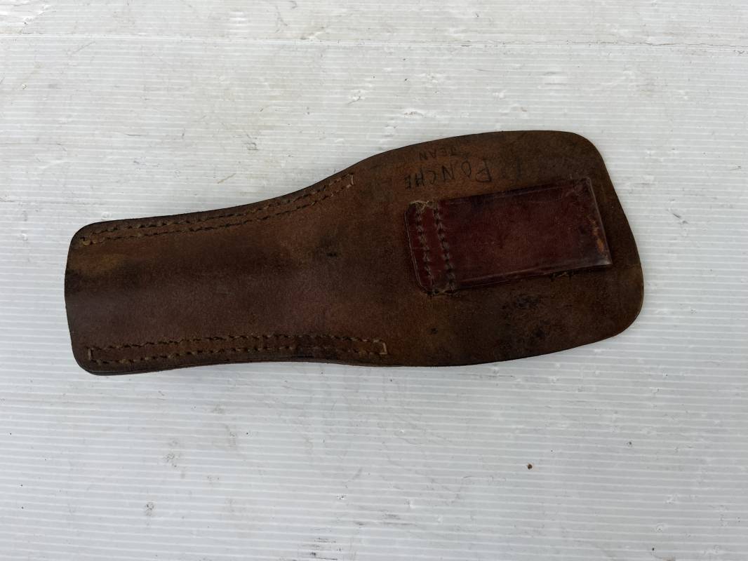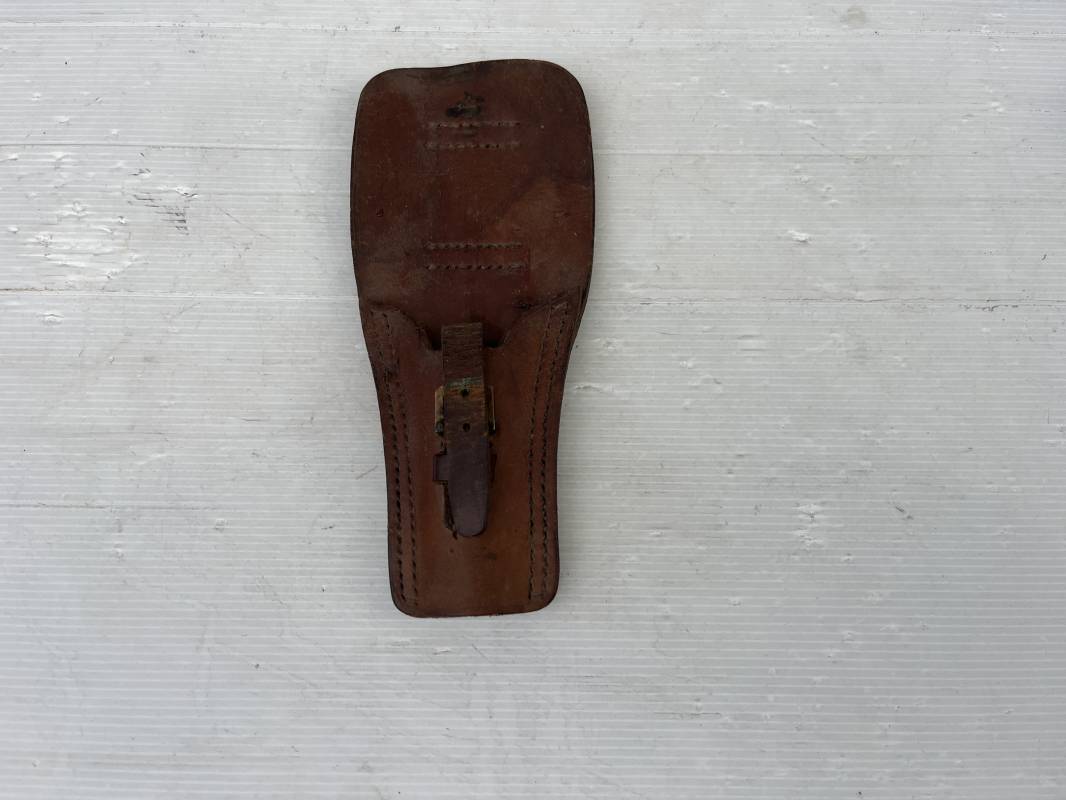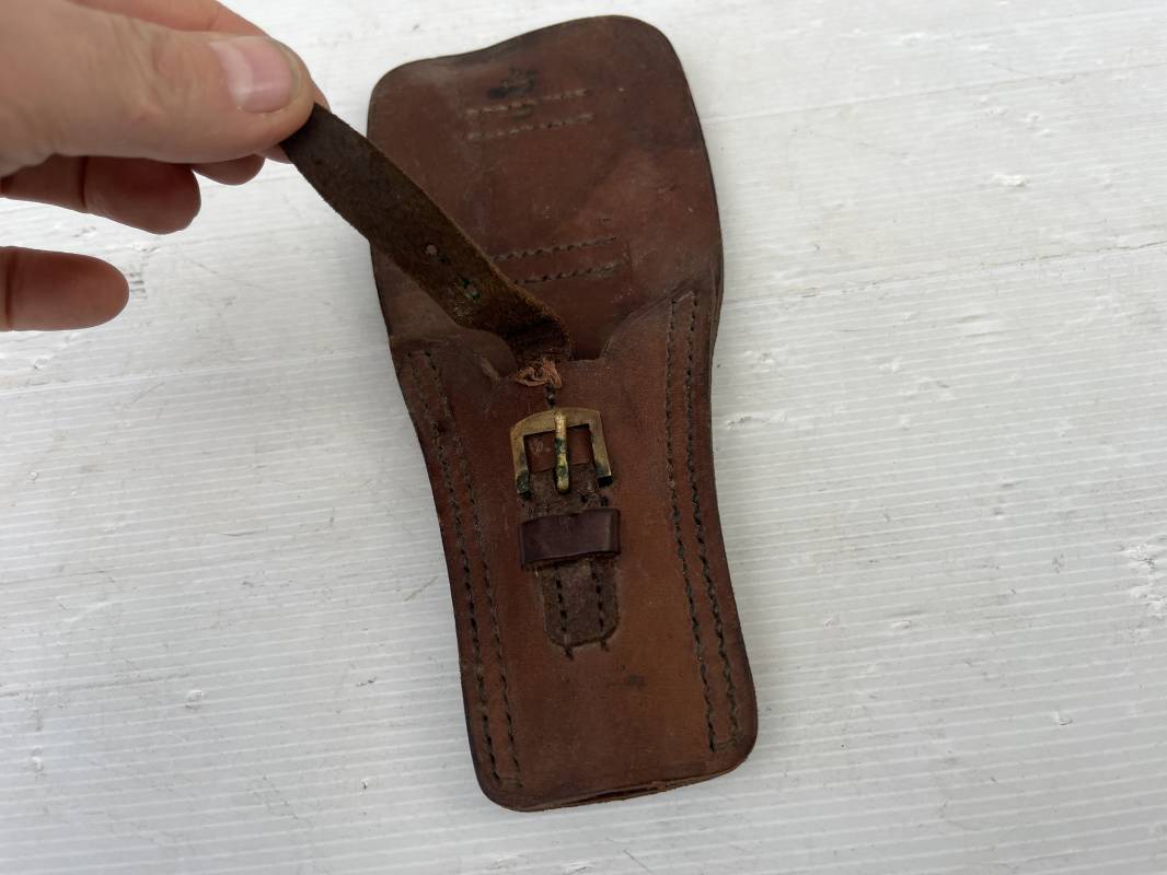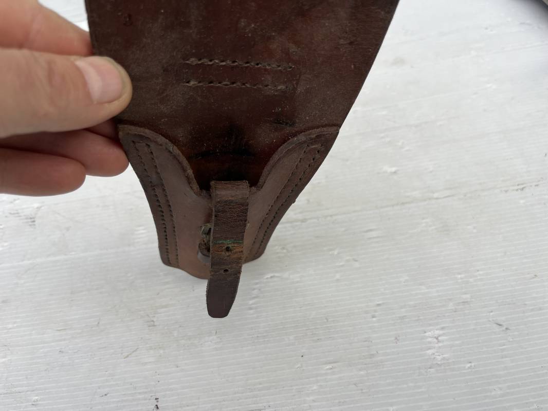Gousset pour baionnette modèle 1892 du fusil mousqueton. Porte baionnette en cuir marron, passant cuir de ceinturon. Lanière cuir et boucle laiton à un ardillon, cuir souple. Tampon rond de fabricant . Nom du soldat manuscri sur le derrière . Légérement porté en bel état . Ref 19118