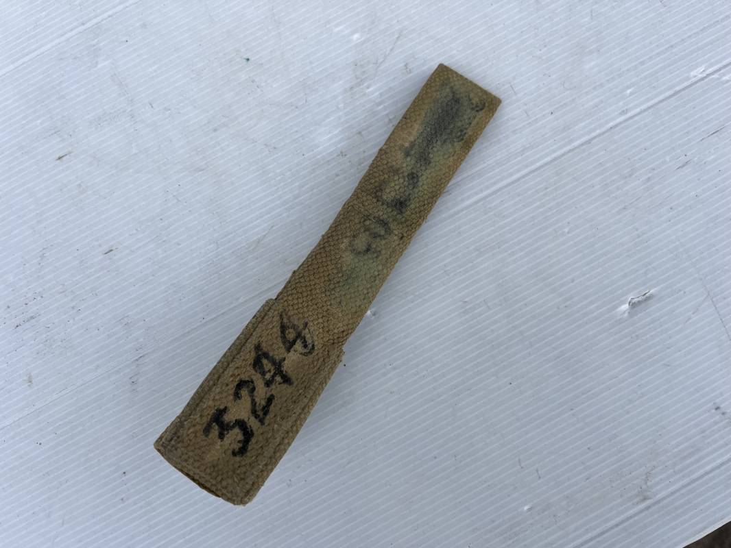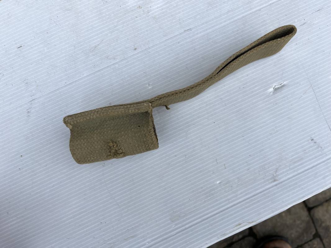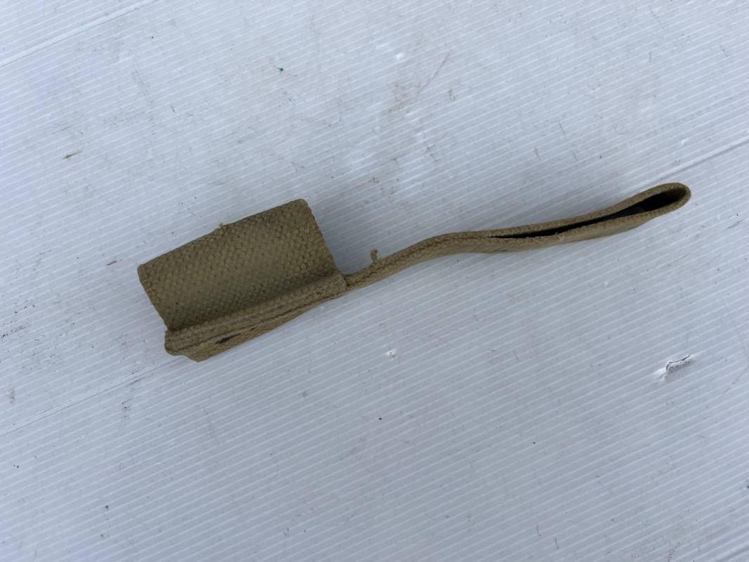 Bon gousset porte baionnette pattern 1937 en coton filé blancoté . Passant de ceinturon , Numero matricule au dos . Porté . Trouvé en brocante dans le nord de la France Ref 19888