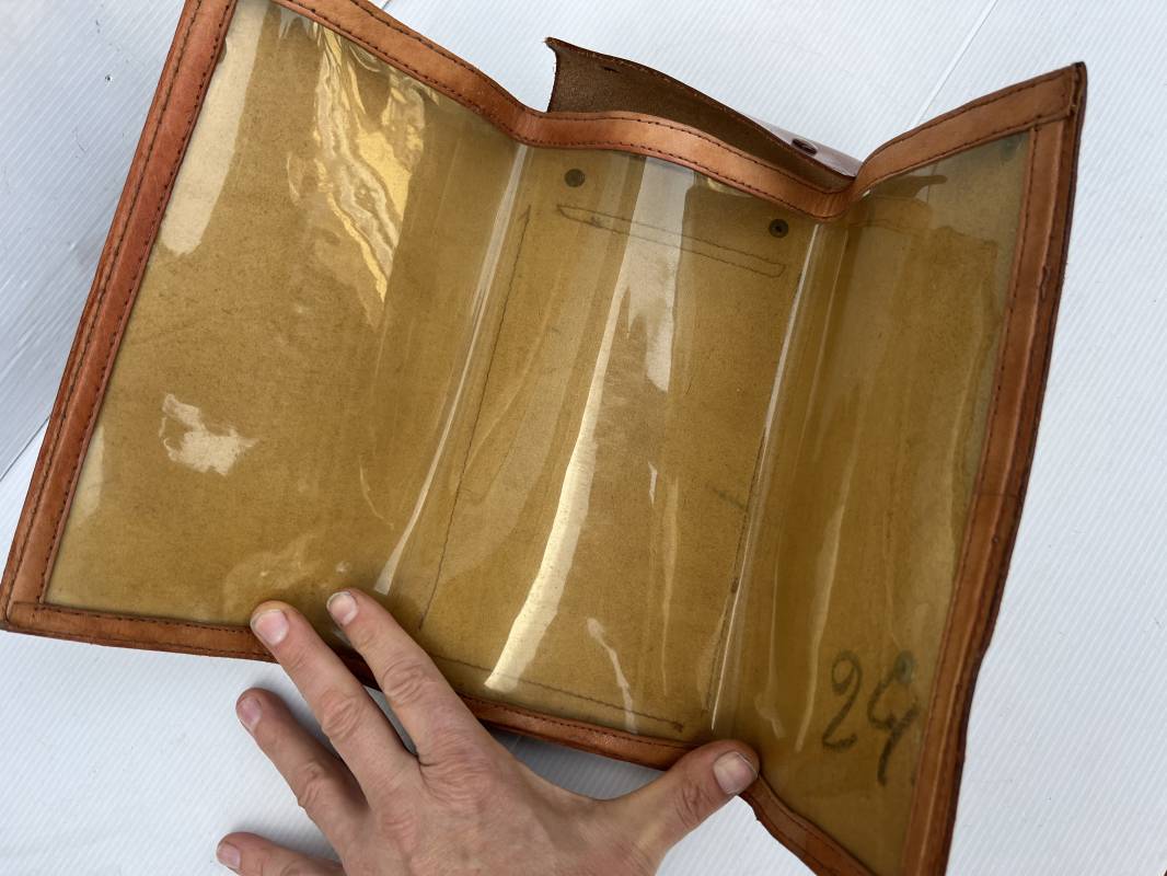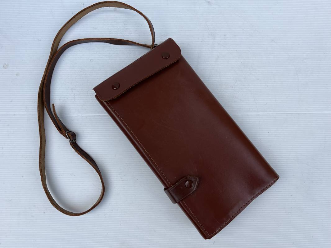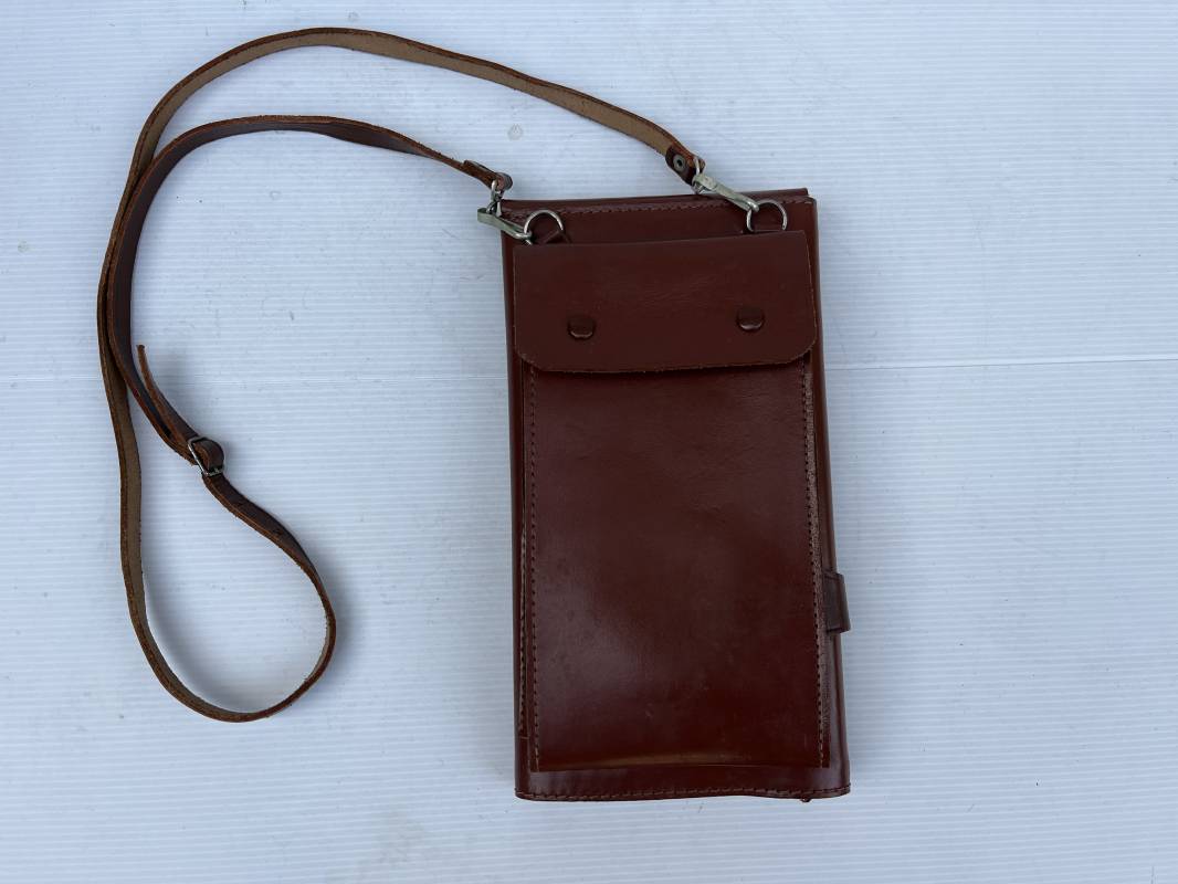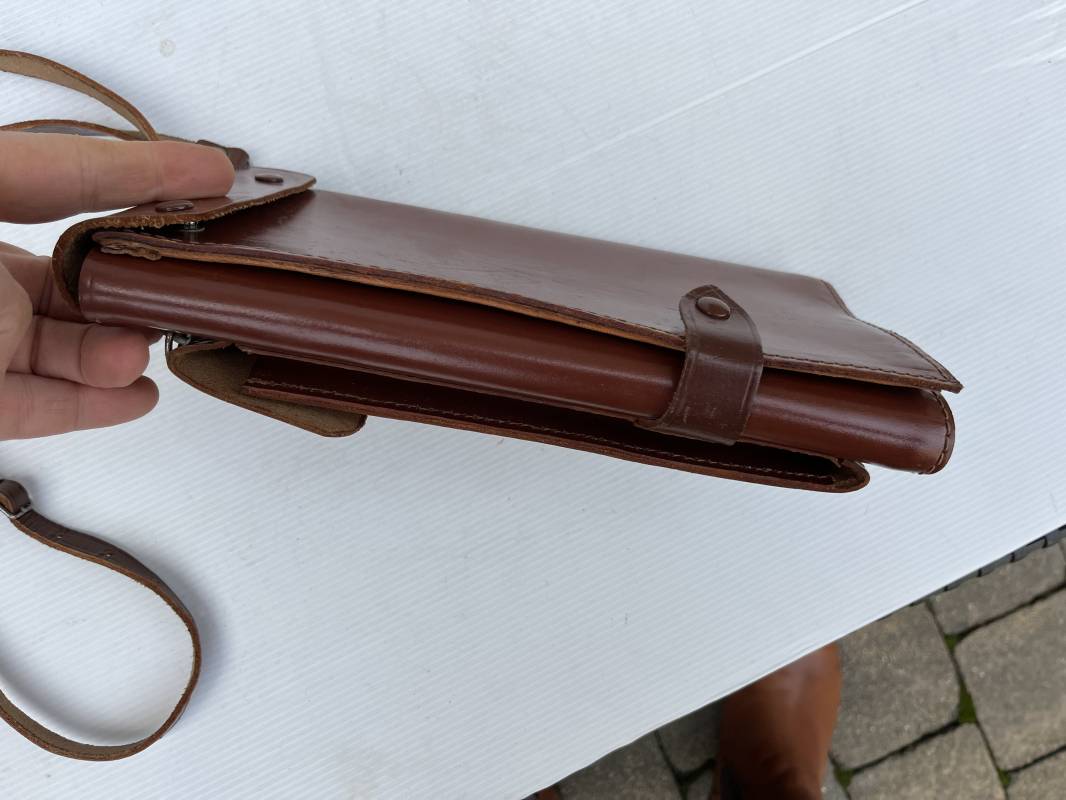Superbe porte cartes type 'Liseuse' en cuir marron et sa sangle.Etui dans un état de conservation exceptionnel Dimensions plié 28x16 cm. Cuir marron. Intèrieur en plexi translucide. Fermeture par rabat en cuir avec pression. Sangle de portage en cuir. Etat quasi neuf 1935/40. Ref 19881