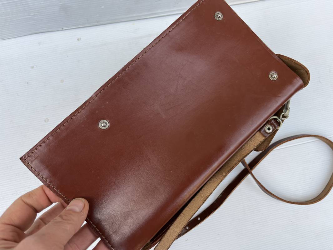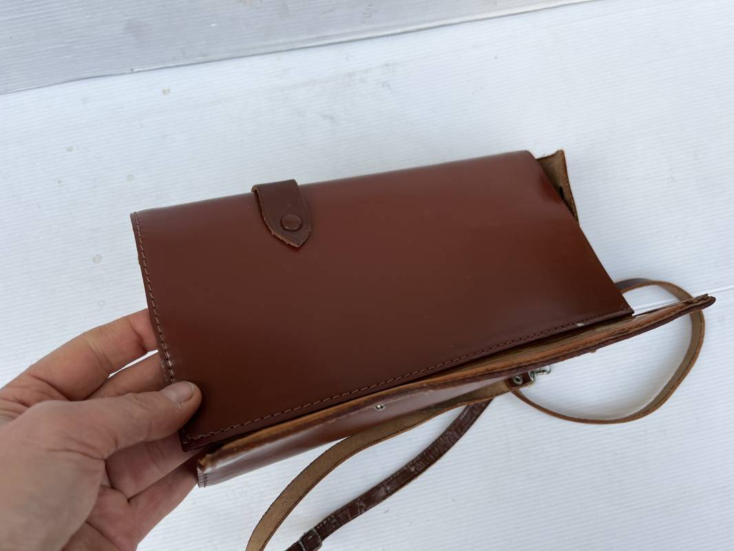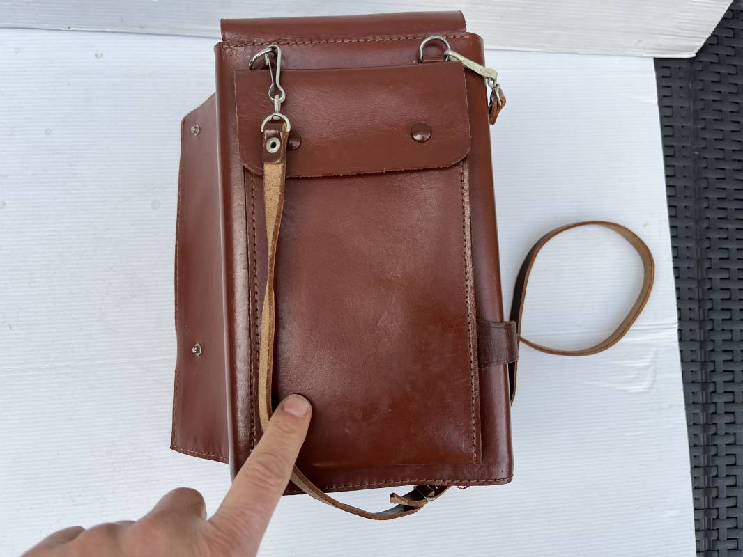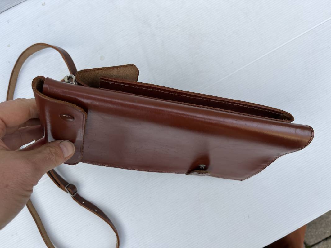 Superbe porte cartes type 'Liseuse' en cuir marron et sa sangle.Etui dans un état de conservation exceptionnel Dimensions plié 28x16 cm. Cuir marron. Intèrieur en plexi translucide. Fermeture par rabat en cuir avec pression. Sangle de portage en cuir. Etat quasi neuf 1935/40. Ref 19881
