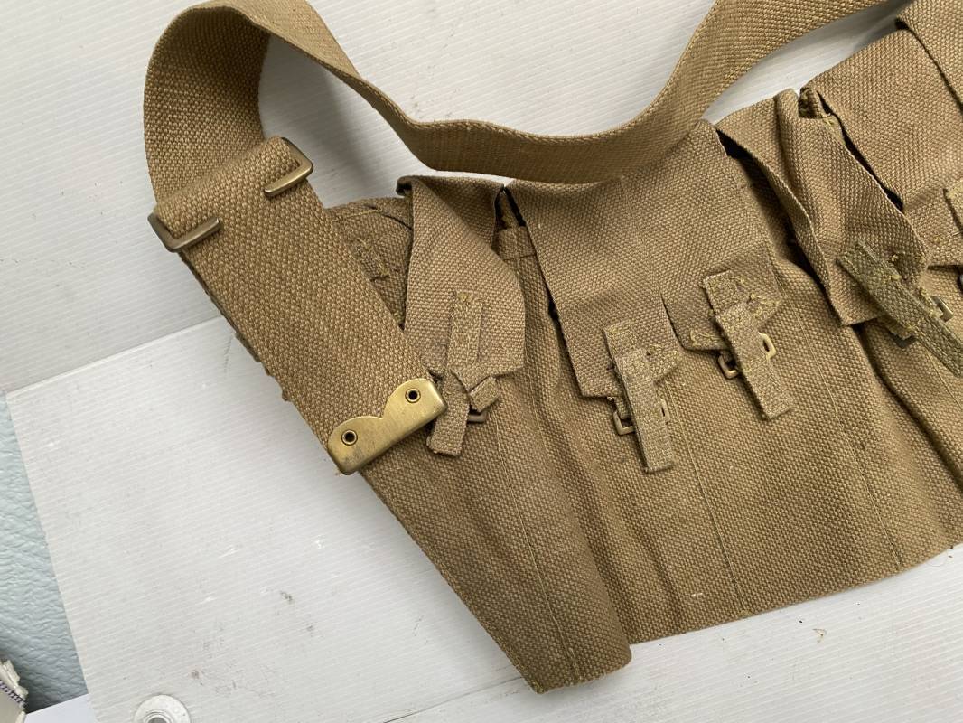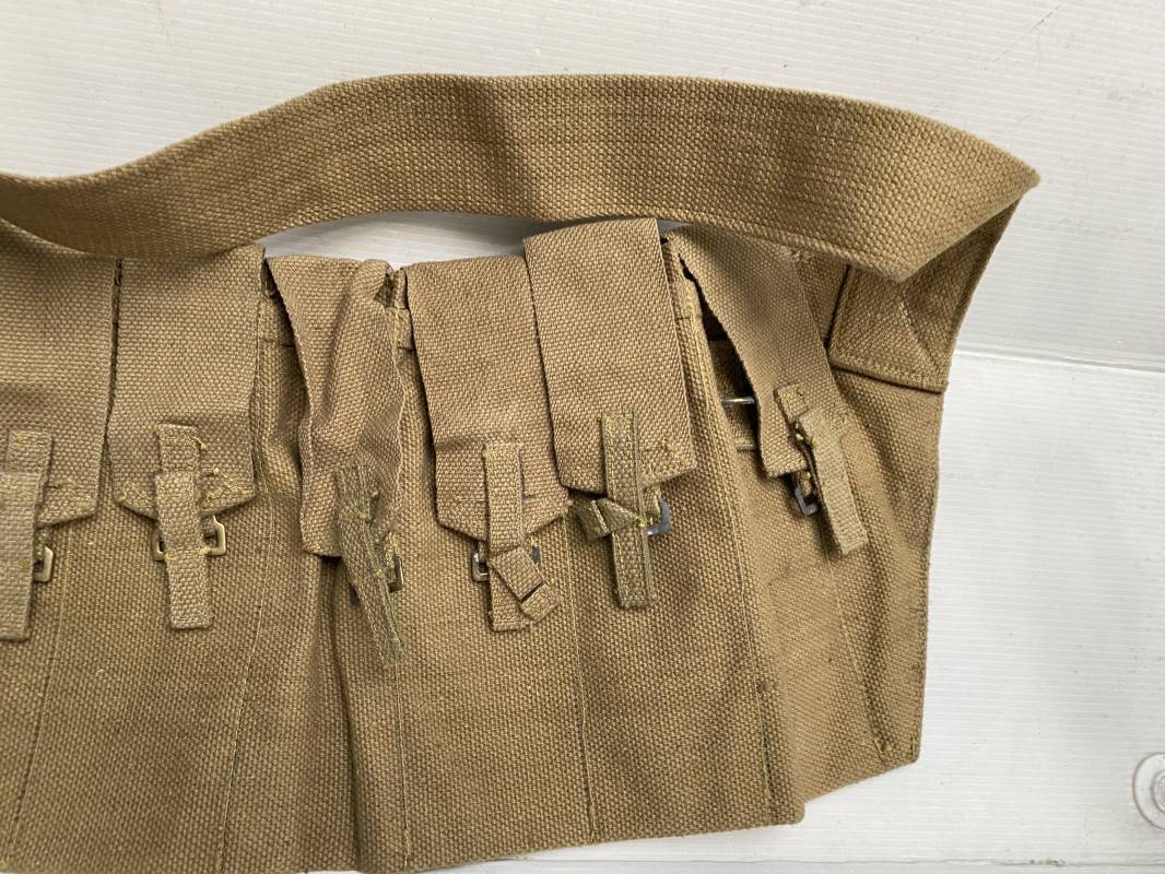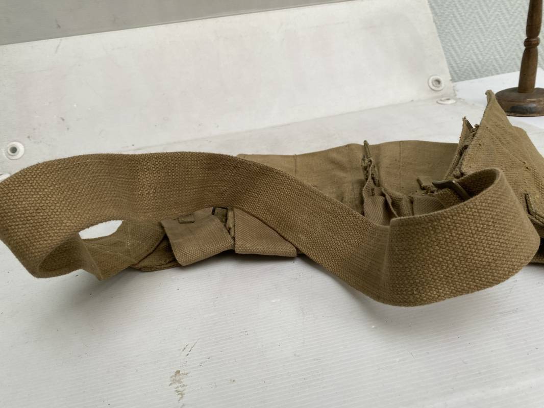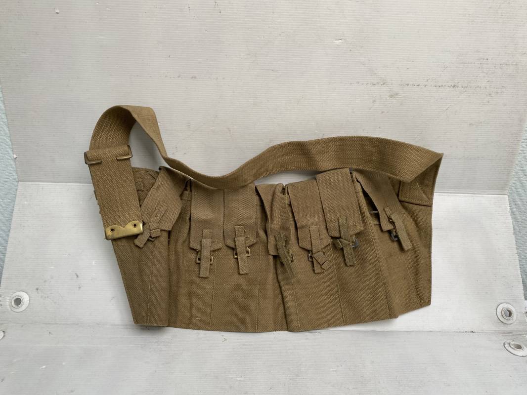 Très beau bandoulier porte chargeurs PM Sten pour troupe de choc anglaise (commando/parachutiste). Pochette de sept chargeurs en toile web. Boucles et passants laiton. Large sangle de transport. Tampon encre fabricant B. Ltd 1944. Légèrement utilisé en parfait état. Ref 17044