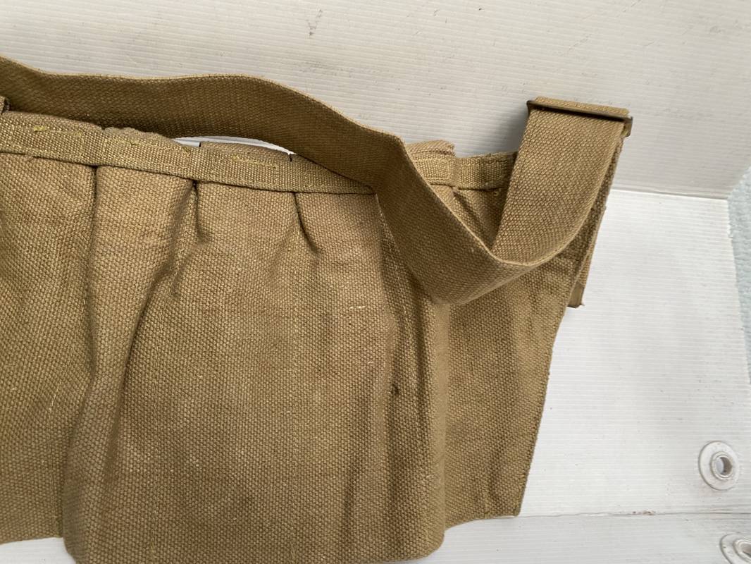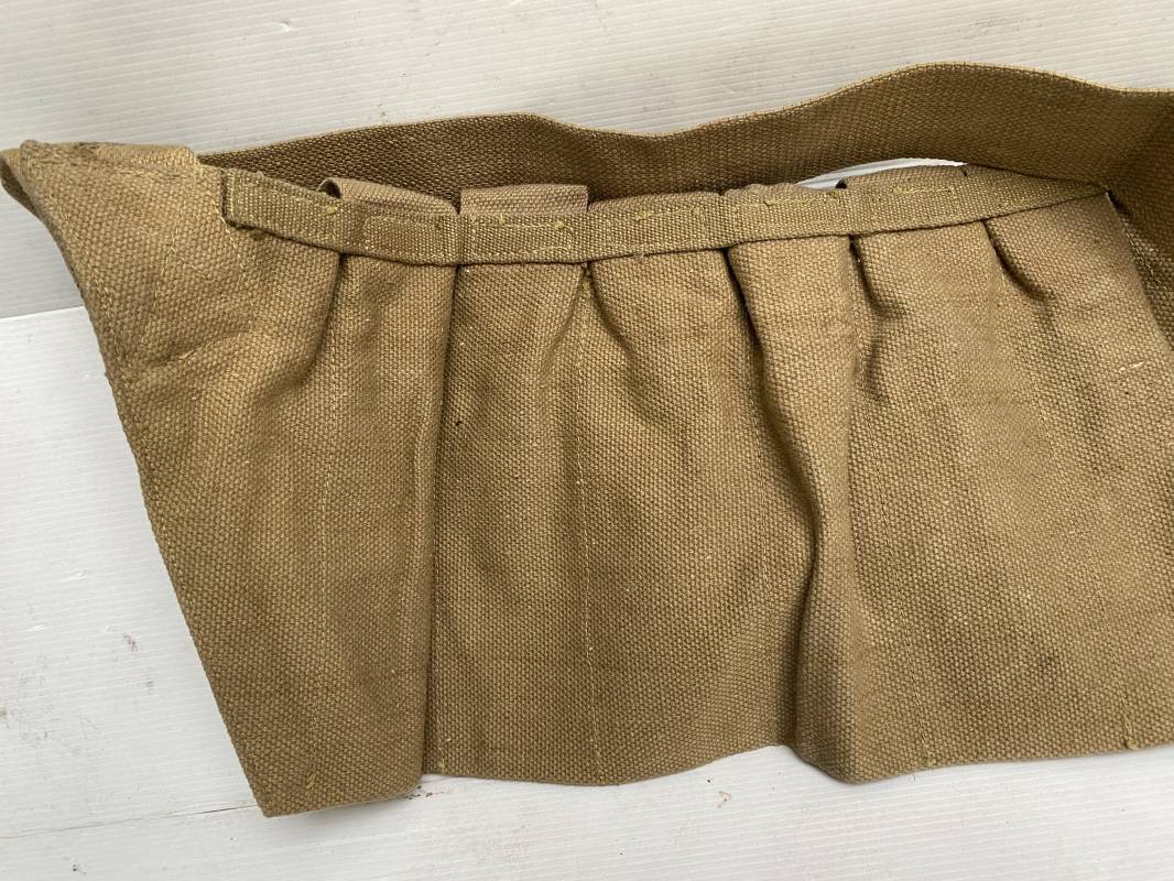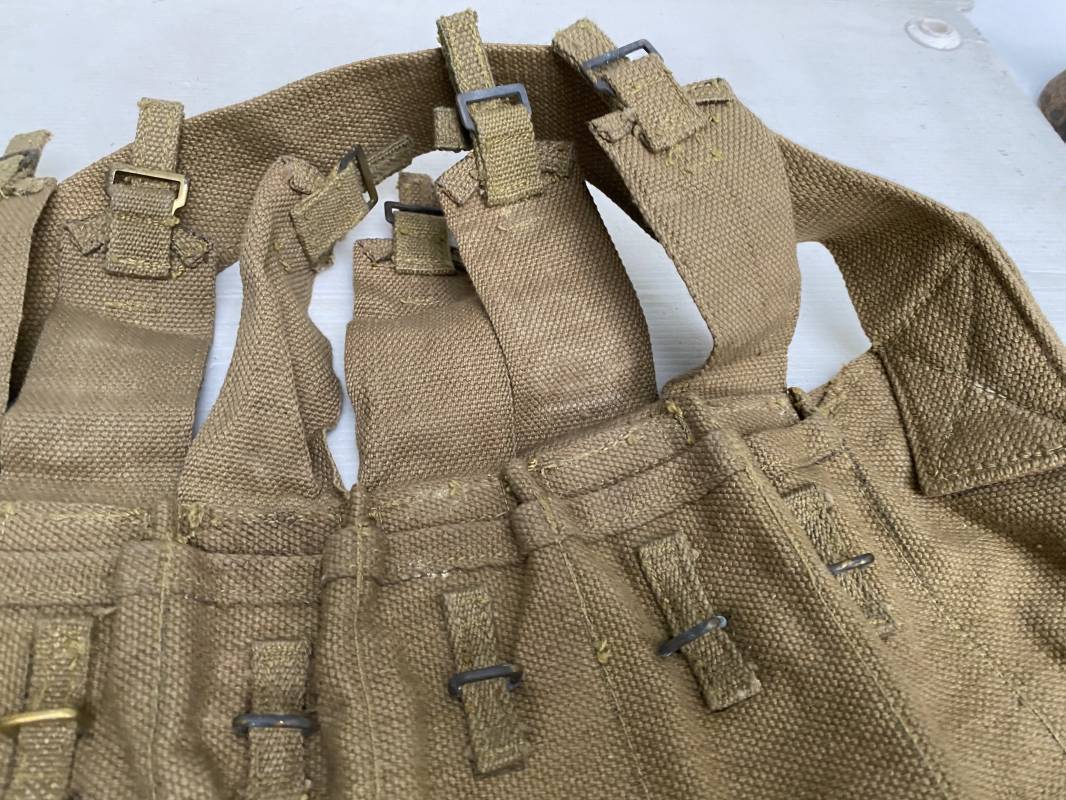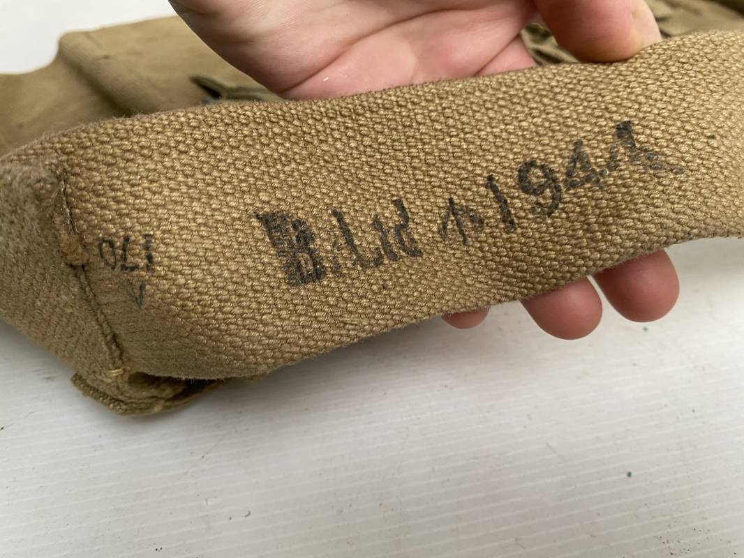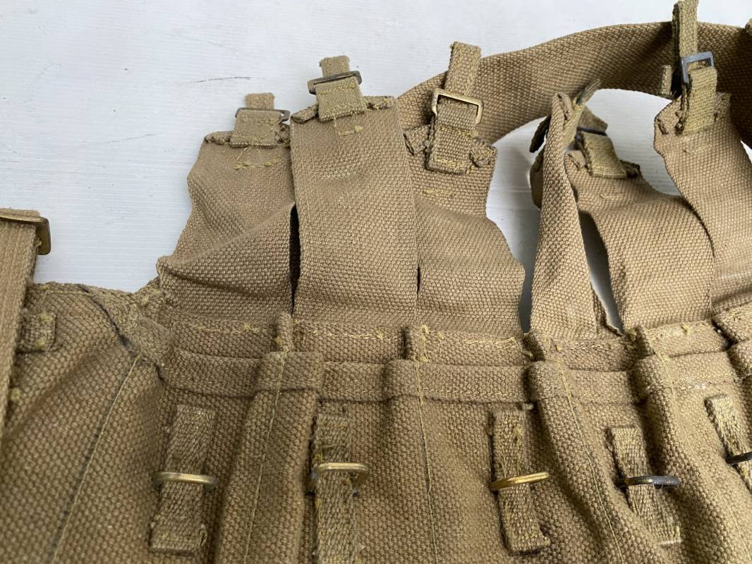 Très beau bandoulier porte chargeurs PM Sten pour troupe de choc anglaise (commando/parachutiste). Pochette de sept chargeurs en toile web. Boucles et passants laiton. Large sangle de transport. Tampon encre fabricant B. Ltd 1944. Légèrement utilisé en parfait état. Ref 17044