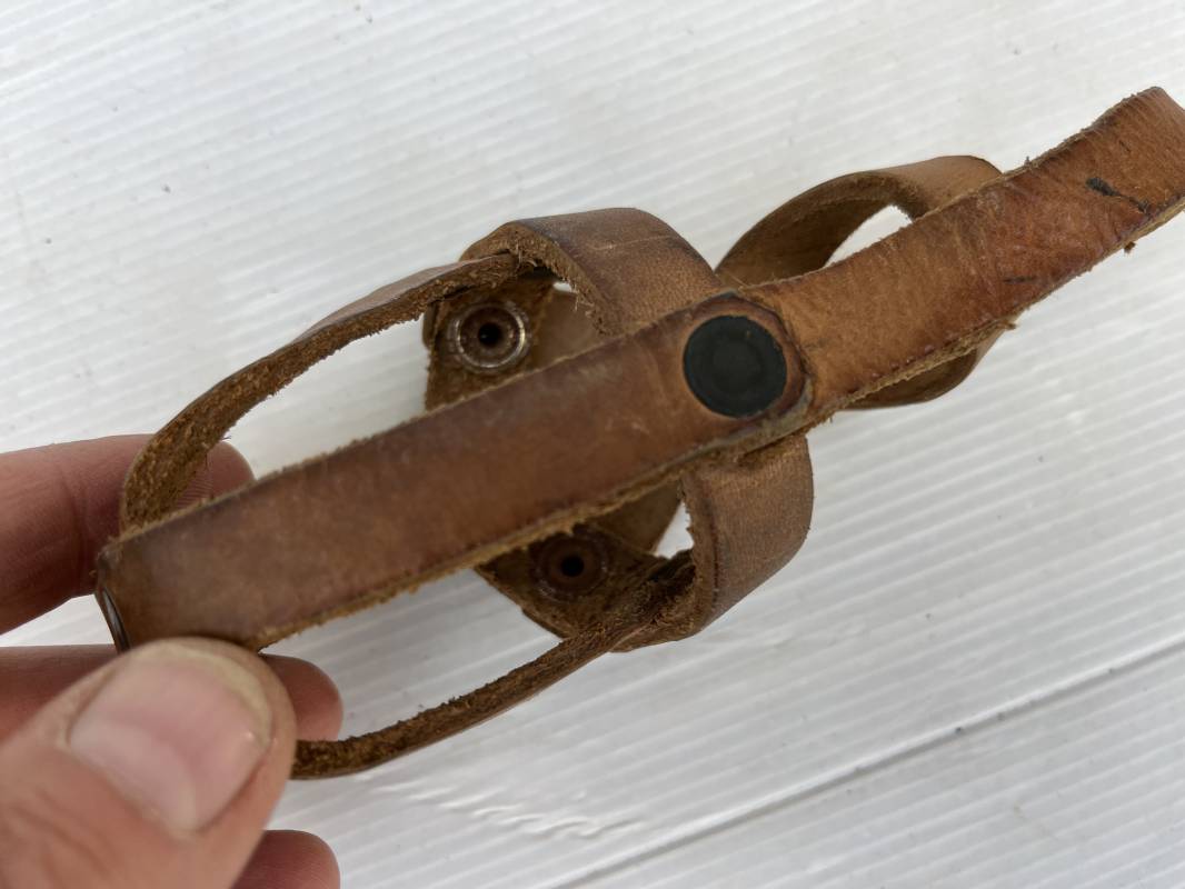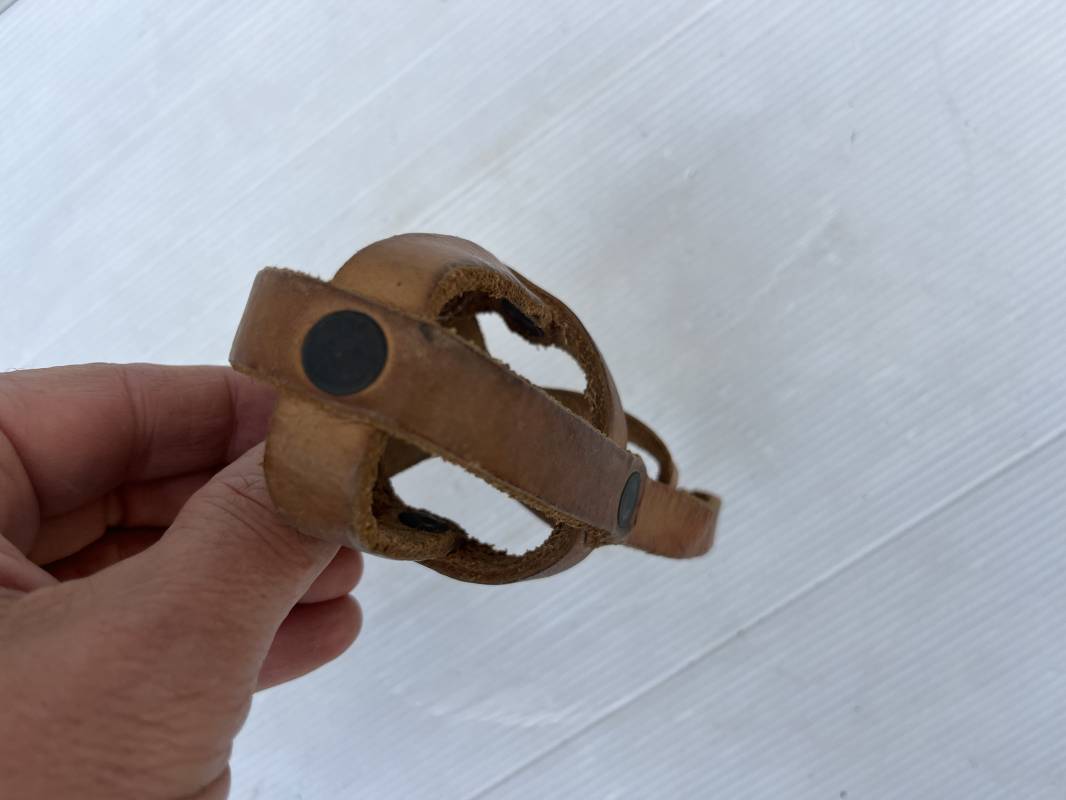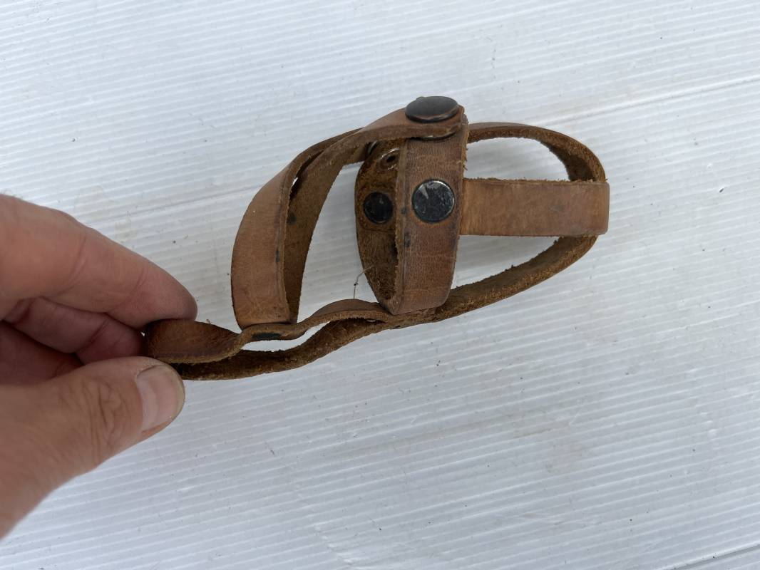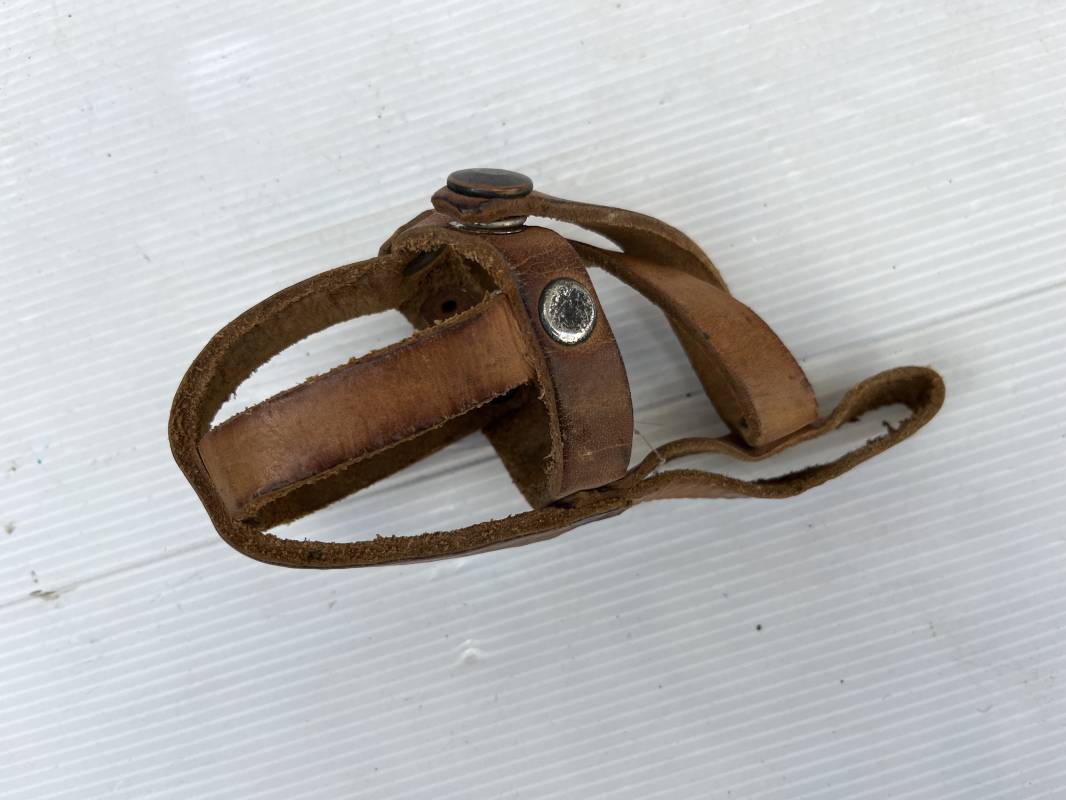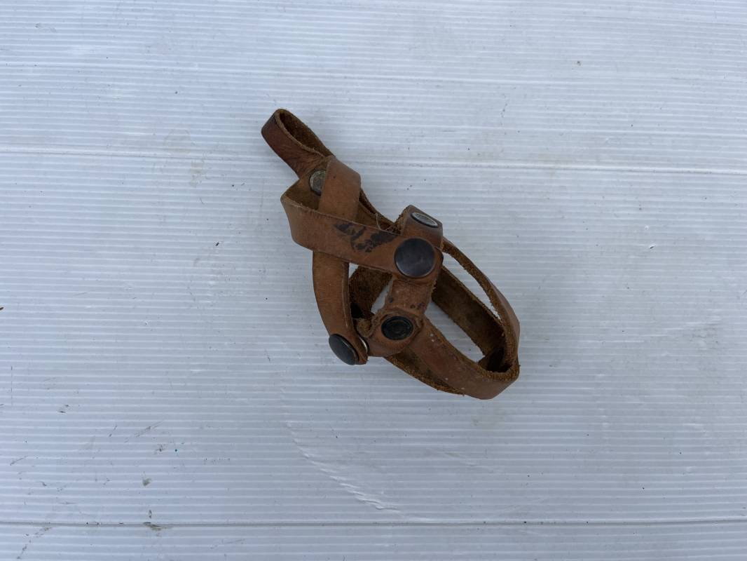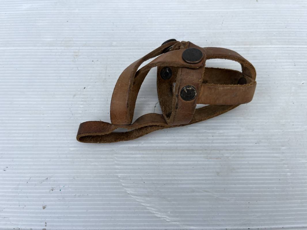 Porte grenade en cuir marron . 'Porte Boule' en cuir marron , rivets métalliques , deux passants de fermeture en cuir avec pression . Passant cuir de ceinturon . Parfait état Ref 21088