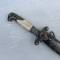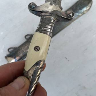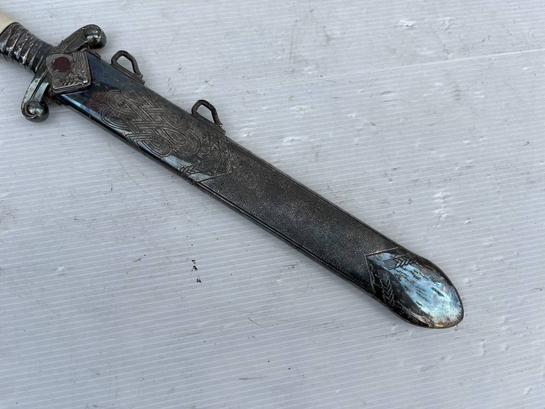 Rare fendoir modéle 1937 d' un officier du RAD (Reich Arbeit Dienst ) Dague en aluminium argenté . Plaquettes en plastique de couleur ivoire ( un petit manque voir photos ) Fourreau en partie grenelé avec passants pour fixation bélière . Lame avec devise ' Arbeit Adelt' et marquage avec logo du célèbre fabricant Carl Eickorn à Solingen . Poignée avec garde , tete d'aigle stylisée . Epis du RAD et croix gammée . Longueur 40 cm . Rare dague légèrement portée en bel état . Belle patine générale Ref 19612