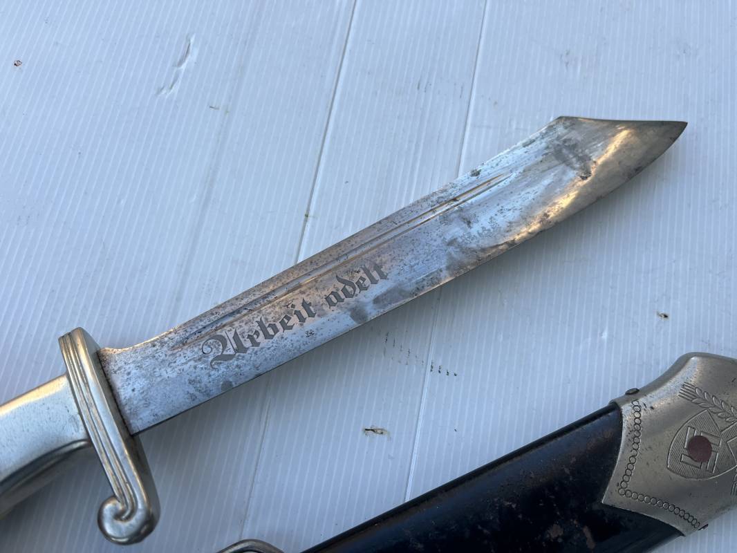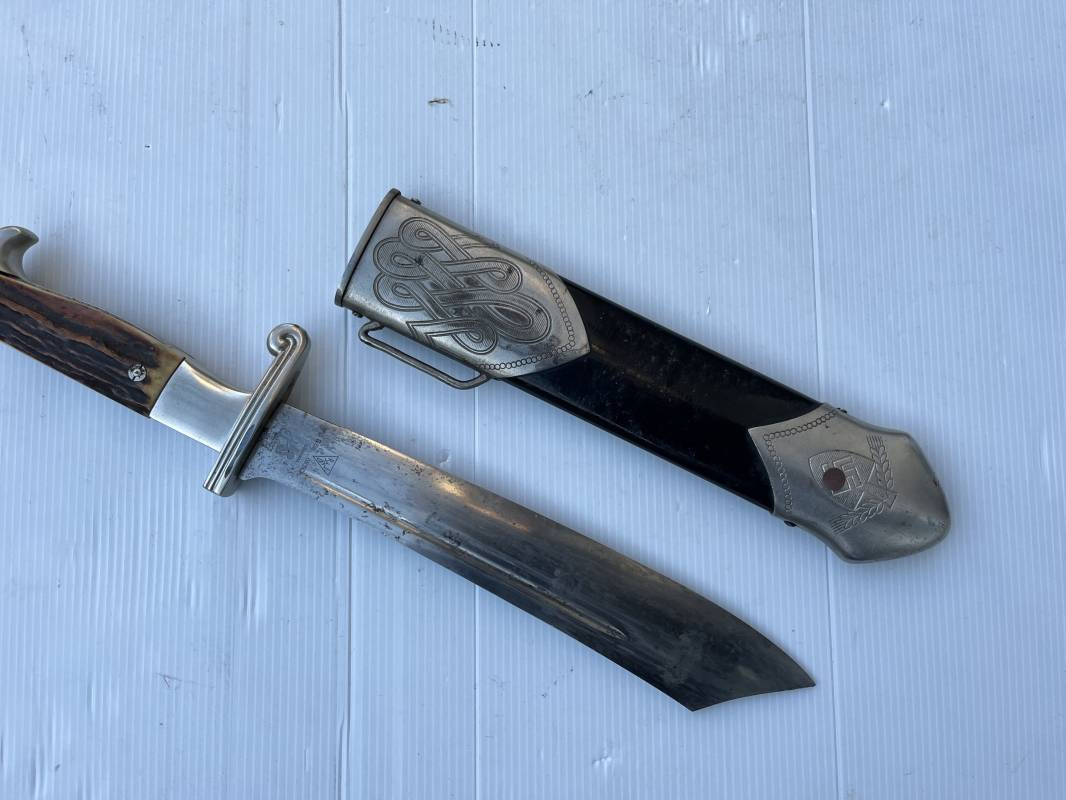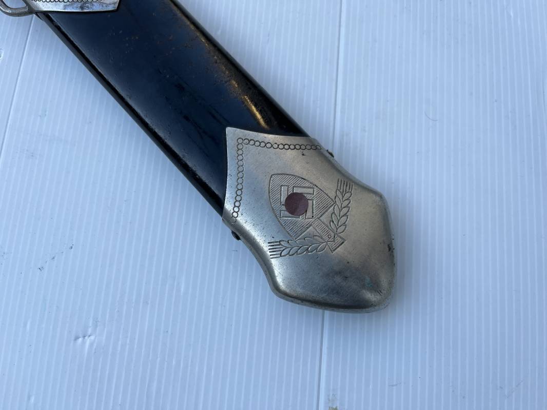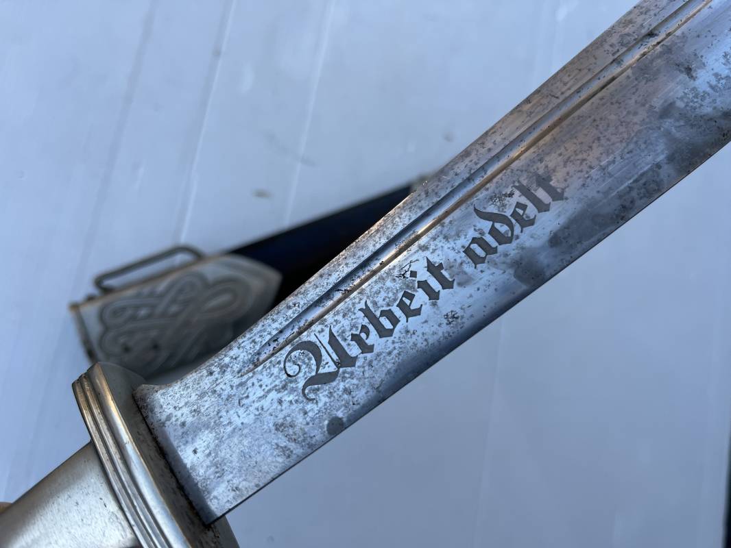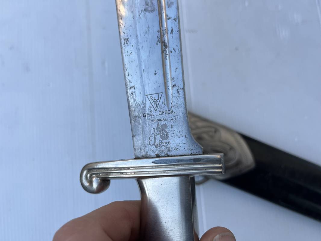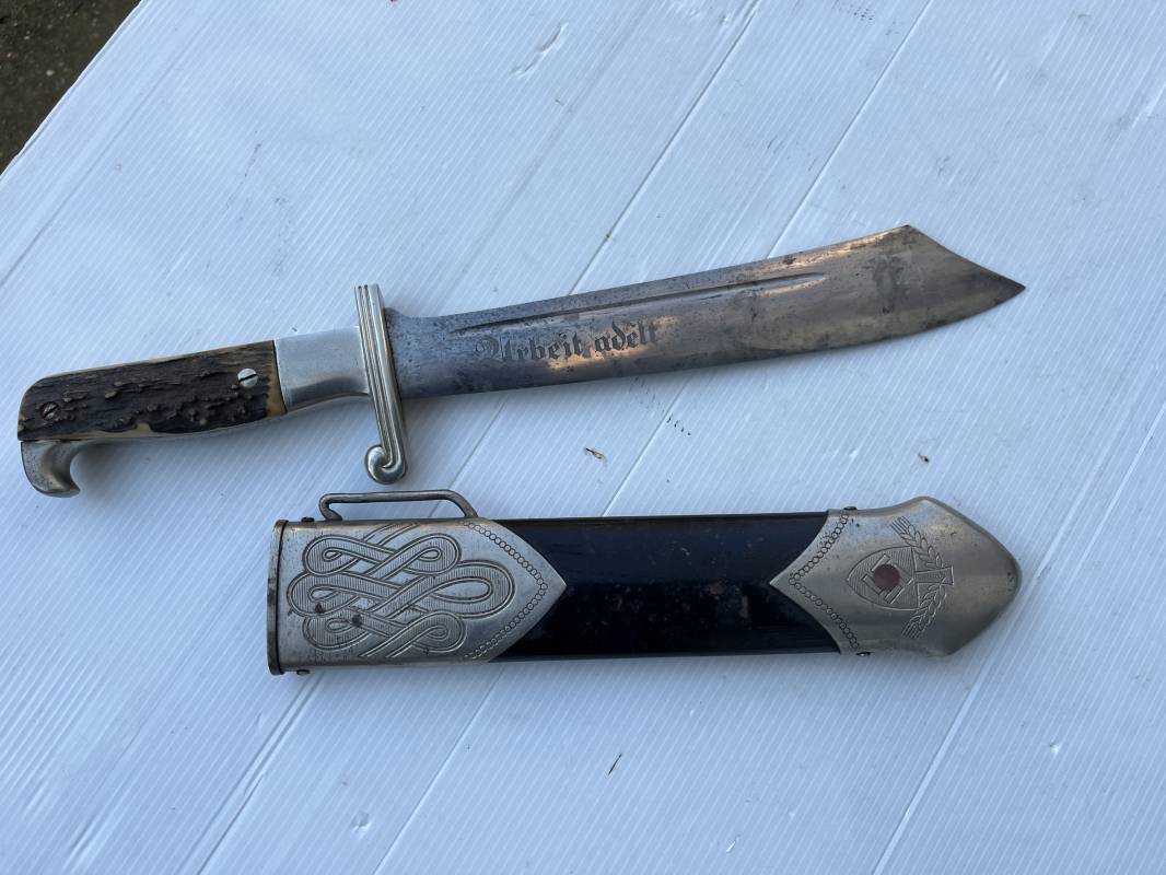 Trés beau fendoir troupe modèle 1934 du Reich Arbeit Dienst . Fendoir sous officier (Truppen Fuhrer à Unter Feldmeister). Poignée en corne de cerf. Pommeau en forme de tête d'aigle. Garde stylisée plate avec symbole du RAD . Lame en acier forgé avec devise 'Arbeit Adelt '(Le travail ennoblit). Marquage fabricant Carl Eickorn Solingen . Ges. Gesch. et estempille triangulaire de l inspection du RAD Fourreau métallique. Peinture noire d'origine. Garnitures avec emblème du RAD. Passant métallique pour fixation de la bélière.1935/45 . Fendoir légèrement utilisé en trés bel état Ref 20068