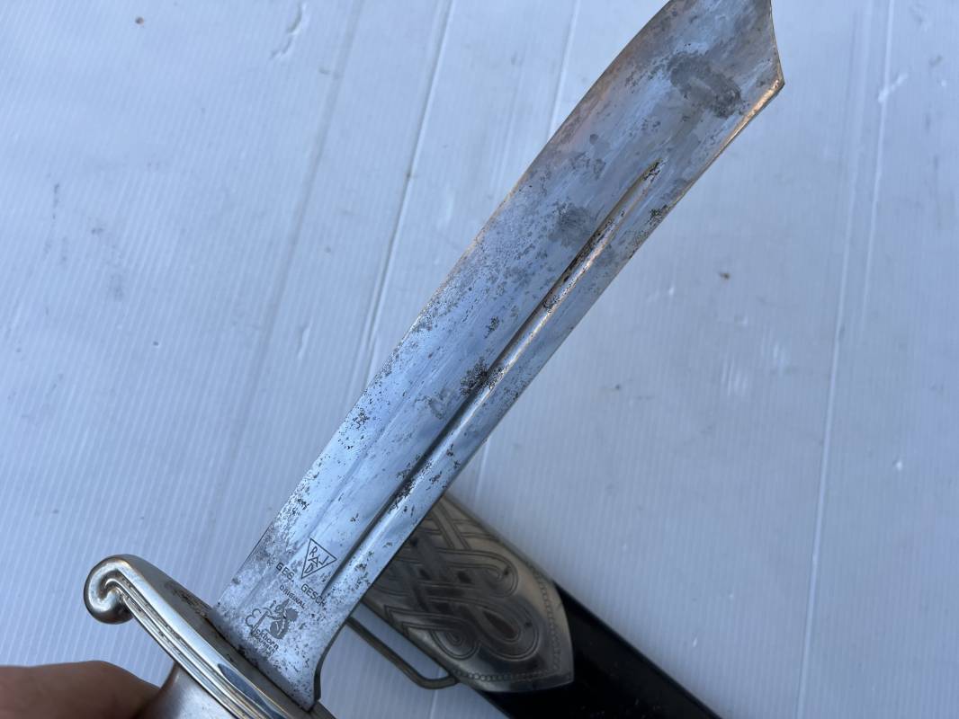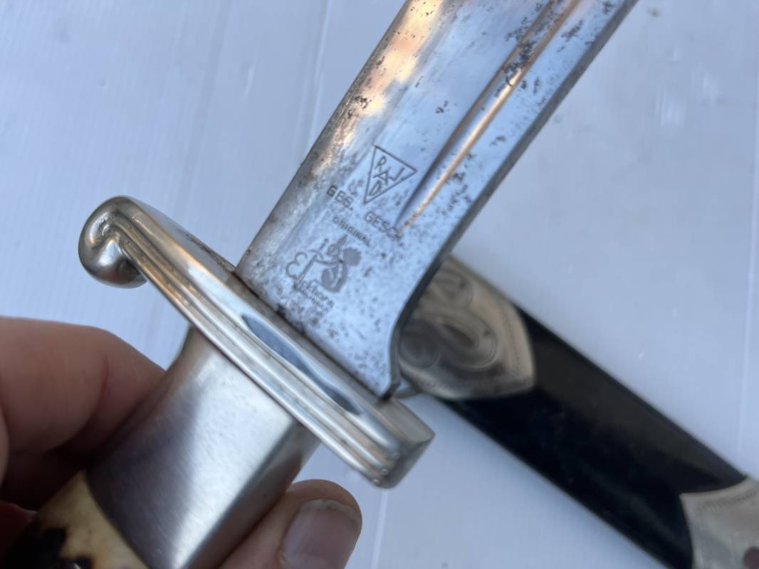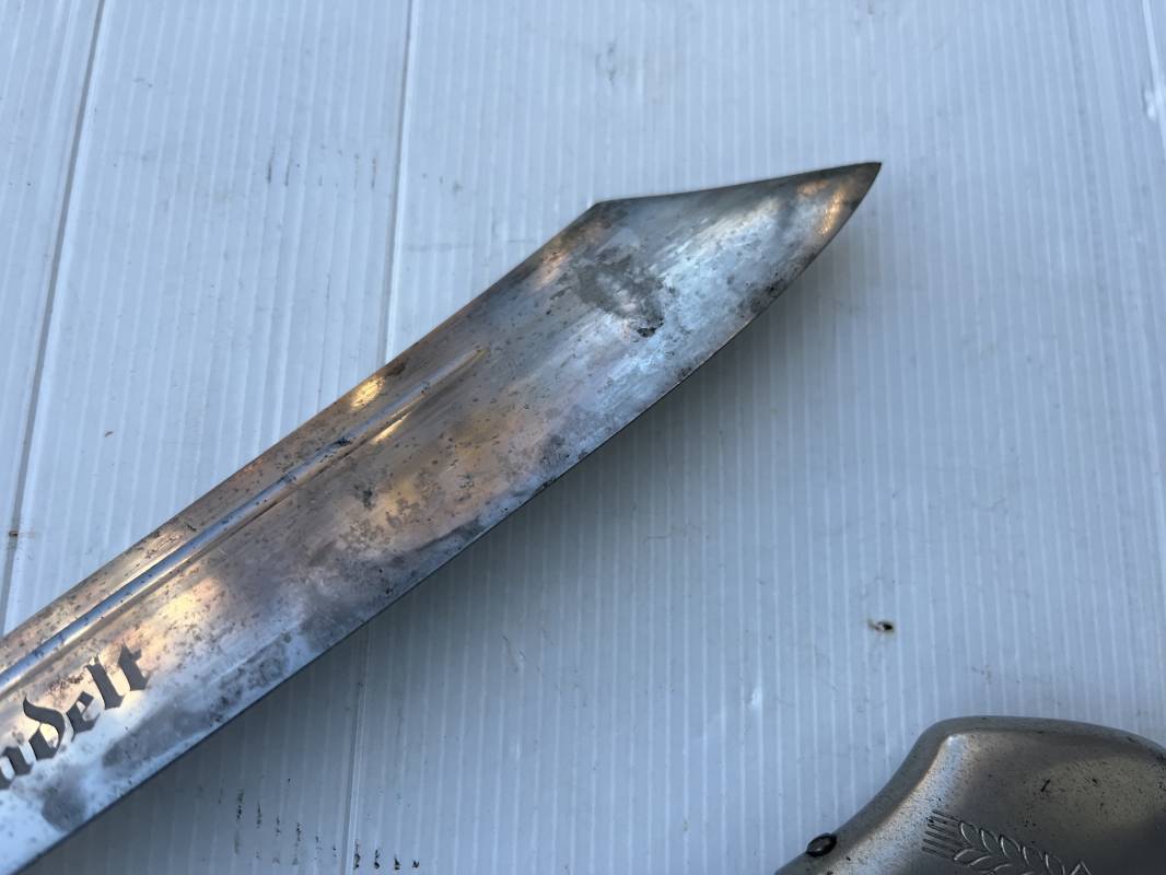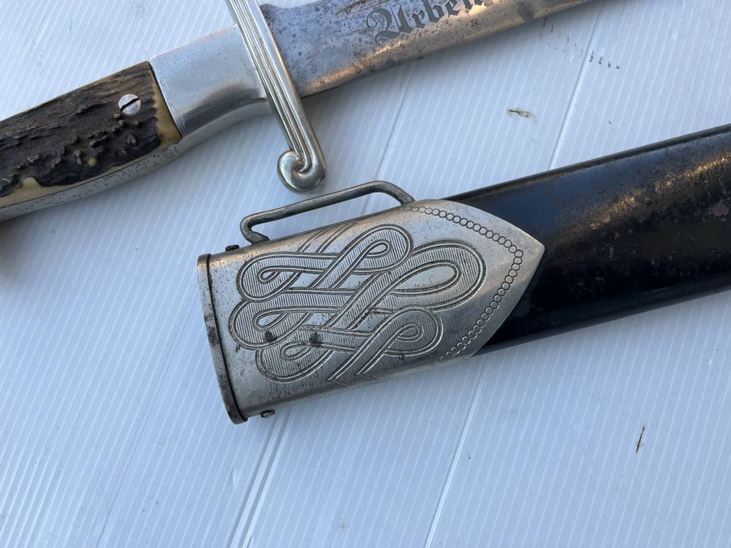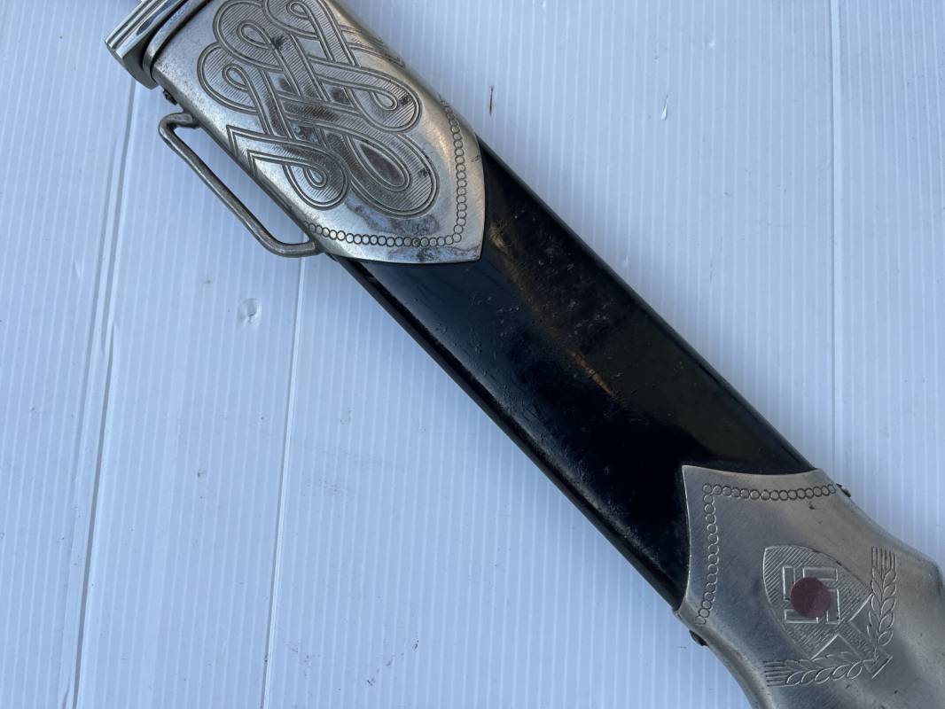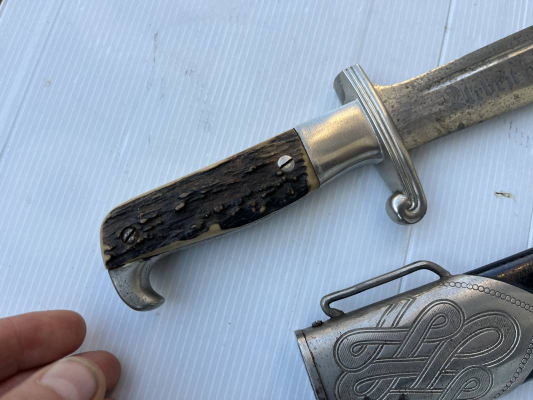 Trés beau fendoir troupe modèle 1934 du Reich Arbeit Dienst . Fendoir sous officier (Truppen Fuhrer à Unter Feldmeister). Poignée en corne de cerf. Pommeau en forme de tête d'aigle. Garde stylisée plate avec symbole du RAD . Lame en acier forgé avec devise 'Arbeit Adelt '(Le travail ennoblit). Marquage fabricant Carl Eickorn Solingen . Ges. Gesch. et estempille triangulaire de l inspection du RAD Fourreau métallique. Peinture noire d'origine. Garnitures avec emblème du RAD. Passant métallique pour fixation de la bélière.1935/45 . Fendoir légèrement utilisé en trés bel état Ref 20068