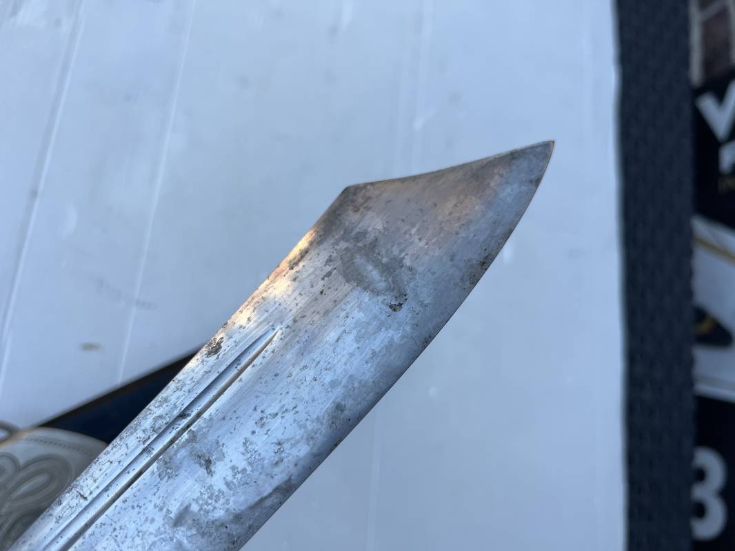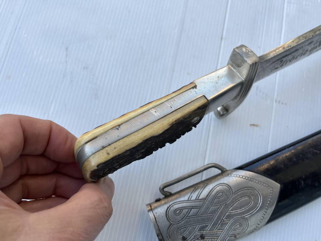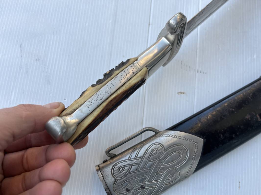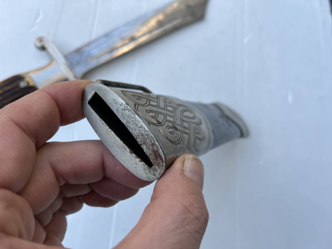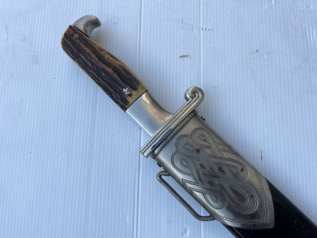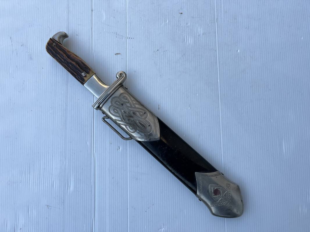 Trés beau fendoir troupe modèle 1934 du Reich Arbeit Dienst . Fendoir sous officier (Truppen Fuhrer à Unter Feldmeister). Poignée en corne de cerf. Pommeau en forme de tête d'aigle. Garde stylisée plate avec symbole du RAD . Lame en acier forgé avec devise 'Arbeit Adelt '(Le travail ennoblit). Marquage fabricant Carl Eickorn Solingen . Ges. Gesch. et estempille triangulaire de l inspection du RAD Fourreau métallique. Peinture noire d'origine. Garnitures avec emblème du RAD. Passant métallique pour fixation de la bélière.1935/45 . Fendoir légèrement utilisé en trés bel état Ref 20068
