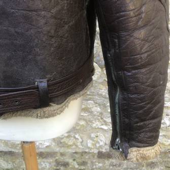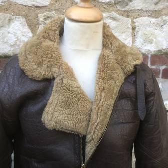 Rare blouson de vol d'un officier pilote de la Royal Air Force ' RA Cook 701 Squadron ' . Blouson de dotation pour navigant du modéle IRVIN en cuir marron fourré en mouton doré . Col demi lune avec nom et grade , escadrille peints d'origine sur le revers du col . Ceinture en cuir et boucle métallique . Glissière frontale fabricant TALON . Deux glissières de manches d'origines et fonctionnelles 'Dot Made in England' . Oeillets de ventilations sous les aisselles . Petites chainette sur le haut interieur . Cuir souple et non craquant , non graissé . 100 % dans sa couleur naturelle marron foncé .A noté petit accroc reparé d'origine sur manche gauche ( voir photo ) Largeur épaules 52 cm , longueur 64 cm , manche 62 cm . Rare blouson d'un pilote de la RAF 1940/45 Ref 19663