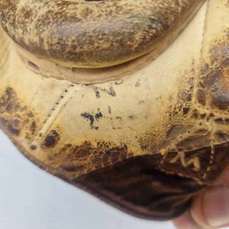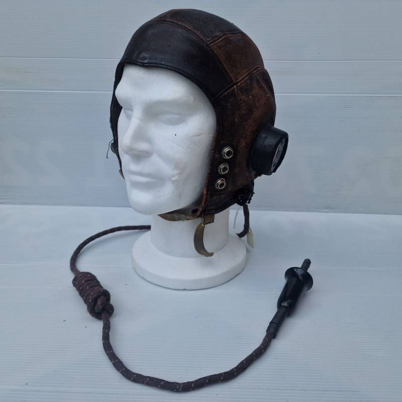 Trés beau serre téte type C d'un navigant de la Royal Air force avec écouteurs et cablage , fiche , montés d'origine . Ce serret téte a été trouvé en Allemagne tel quel et n'a jamais été remonté . Serre téte en cuir marron foncé , passants cuir pour fixation des lunettes , boutons pression pour masque , bonettes en caoutchouc noir . Jugulaire en toile bleu , intérieur doublé en chamois blanc , taille 57 . Marquage à froid sur le cuir avec code avec fléche . Ecouteurs 10A avec cablage , fiche pour le branchement du masque , cable et fiche de branchement . Trés bel ensemble légèrement porté en parfait état . 1943/45 Ref 5868