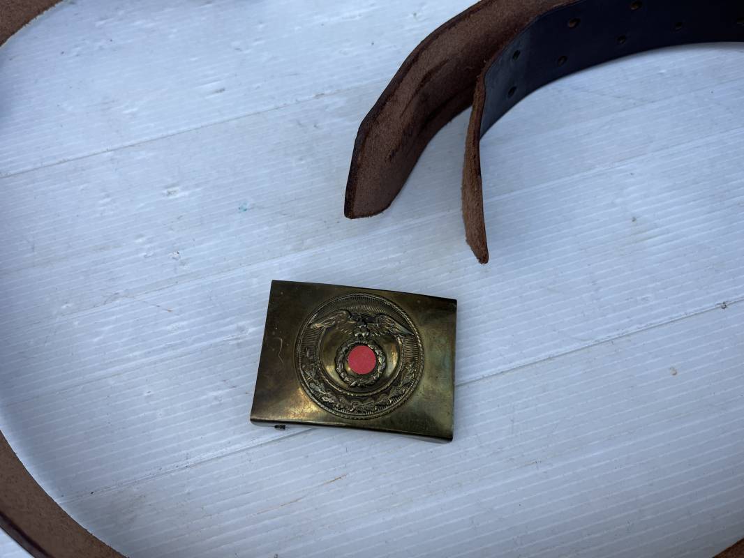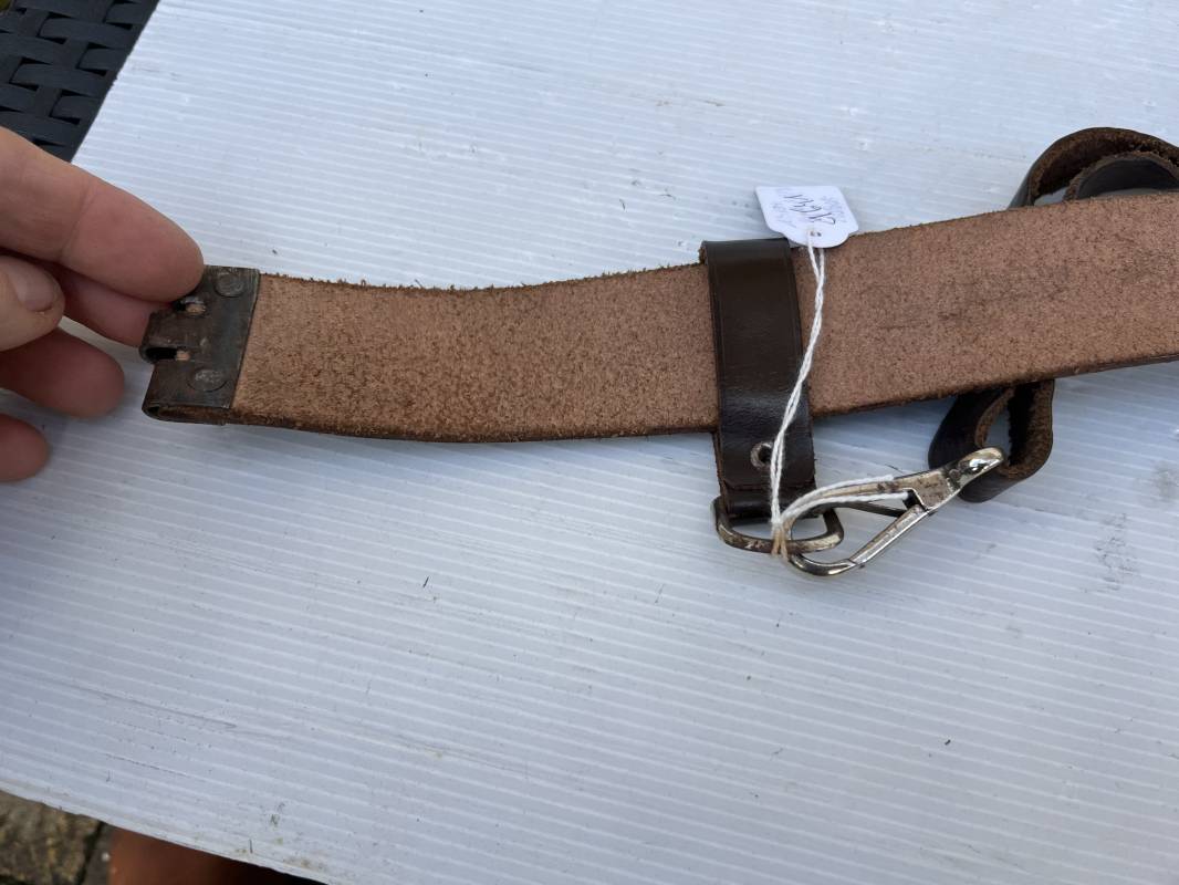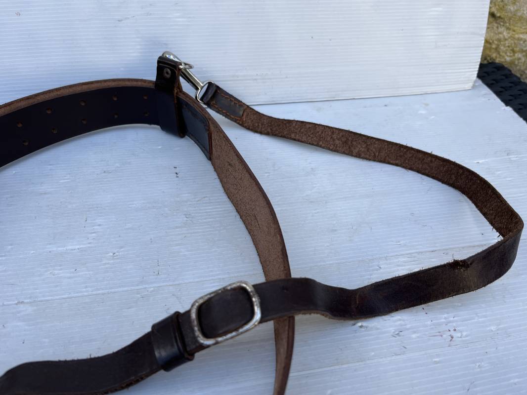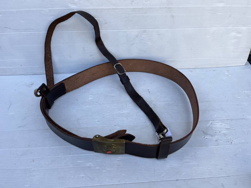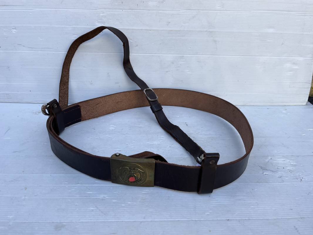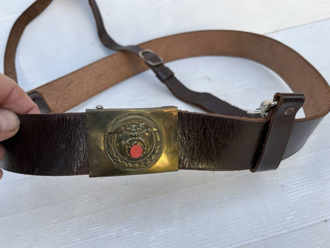 Trés beau ceinturon baudrier d un membre de la SA 5 Sturm Abteilung ) . Boucle en laiton doré , aigle et couronne feuilles de chene , crochet et passant sur le derrière . Ceinturon et baudrier avec passants en cuir marron foncé . , crochet métallique de fixation . Longueur total 105 cm . Baudrier avec crochets et boucle en fer nickelé , deux passants de ceinturon mobiles avec D en fer nickelé . Trés bel ensemble en superne état trouvé en succession familiale en Allemagne . Piece sans aucun défaut Ref 21641