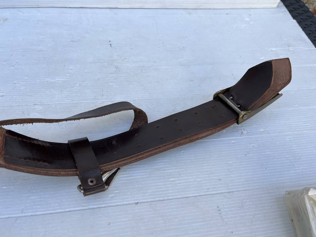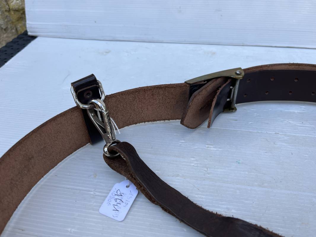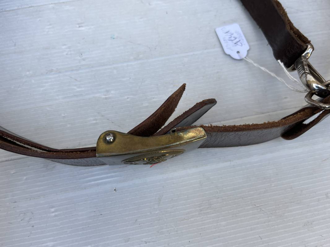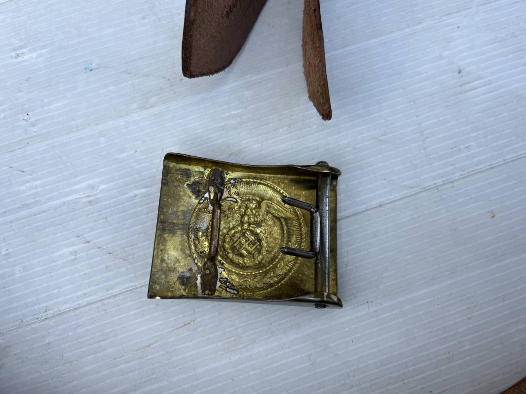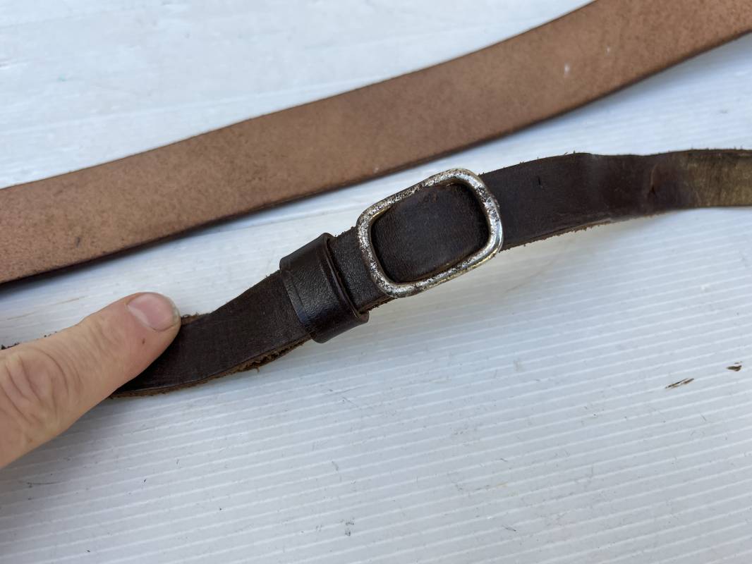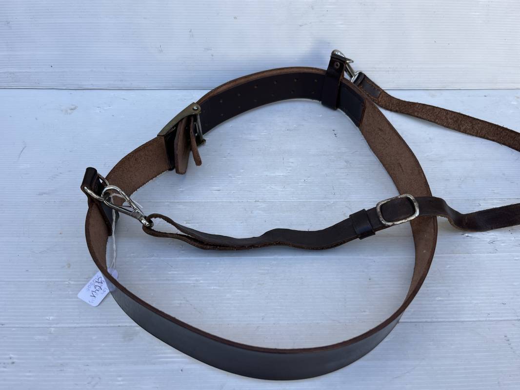 Trés beau ceinturon baudrier d un membre de la SA 5 Sturm Abteilung ) . Boucle en laiton doré , aigle et couronne feuilles de chene , crochet et passant sur le derrière . Ceinturon et baudrier avec passants en cuir marron foncé . , crochet métallique de fixation . Longueur total 105 cm . Baudrier avec crochets et boucle en fer nickelé , deux passants de ceinturon mobiles avec D en fer nickelé . Trés bel ensemble en superne état trouvé en succession familiale en Allemagne . Piece sans aucun défaut Ref 21641