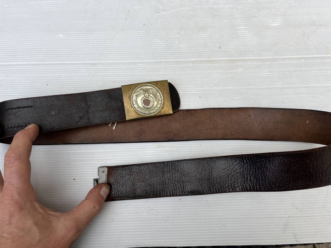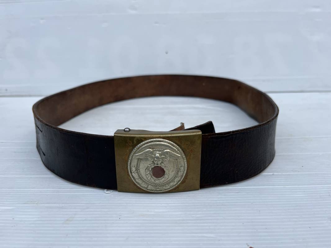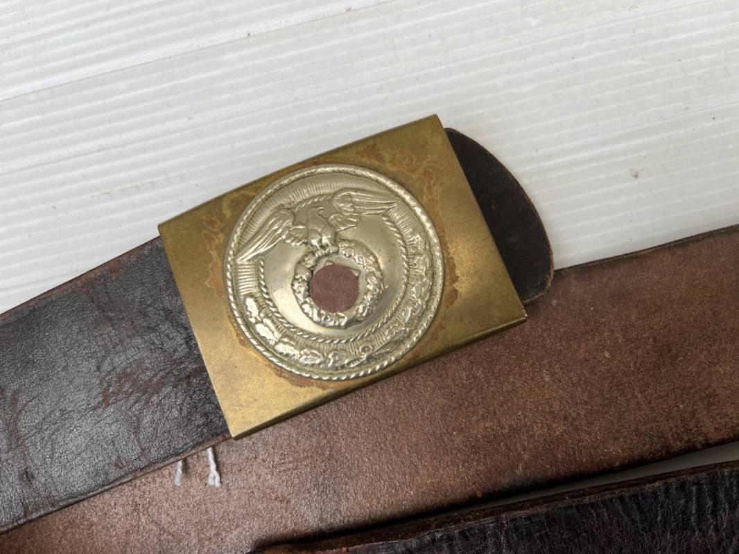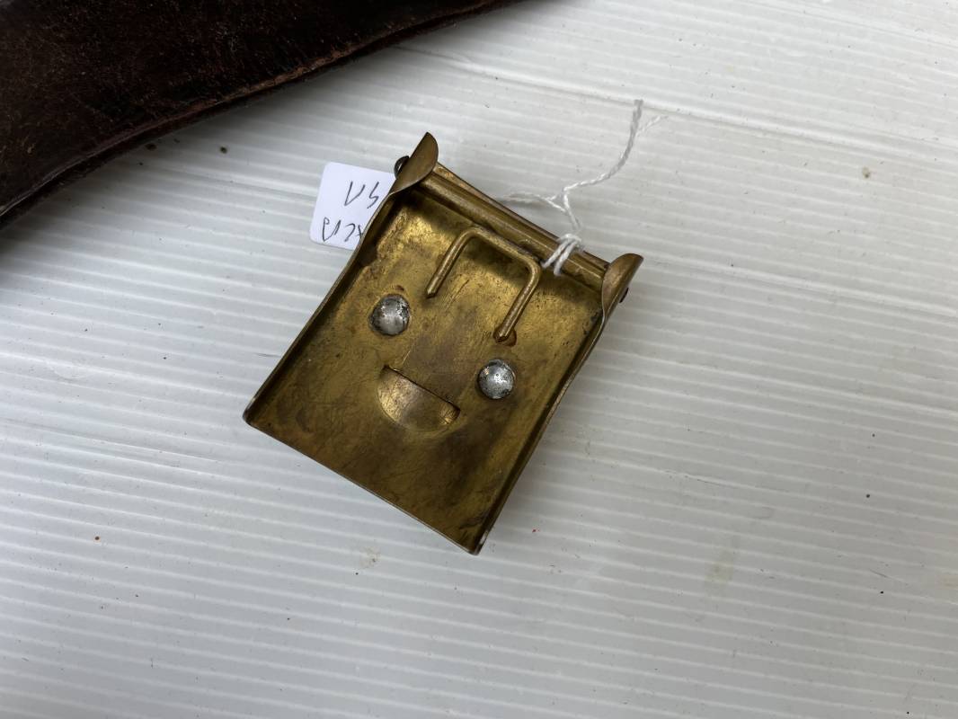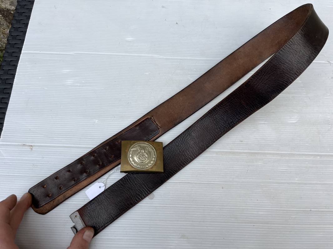 Ceinturon troupe SA ( Sturm Abteilung ) du NSDAP . Boucle en laiton avec cercle riveté en maillechort . , passant et crochet de fixation . Ceinturon en cuir marron foncé , noirci au cirage à l usage . Patelette en cuir pour réglage de taille et crochet en fer . Cuir souple Longueur 105cm .légèrement porté en parfait état 1935/45 Ref 6072