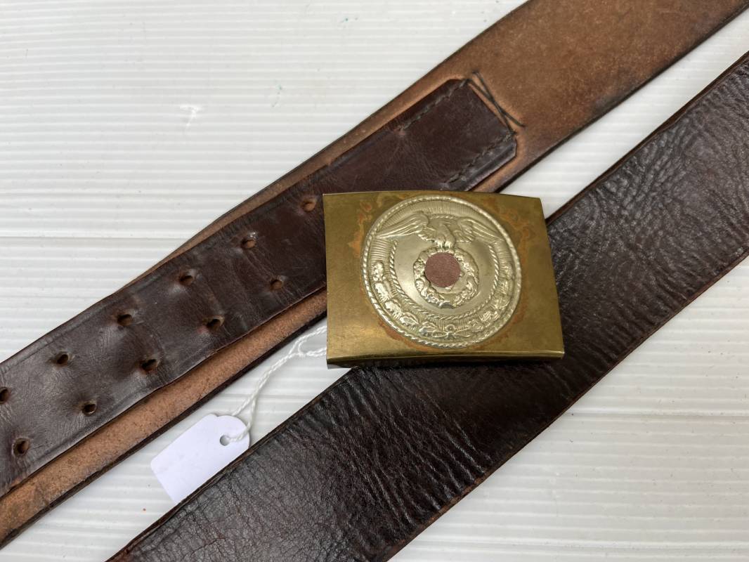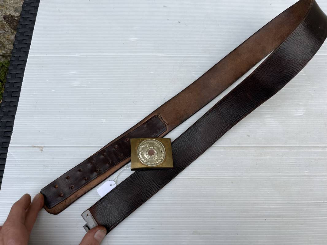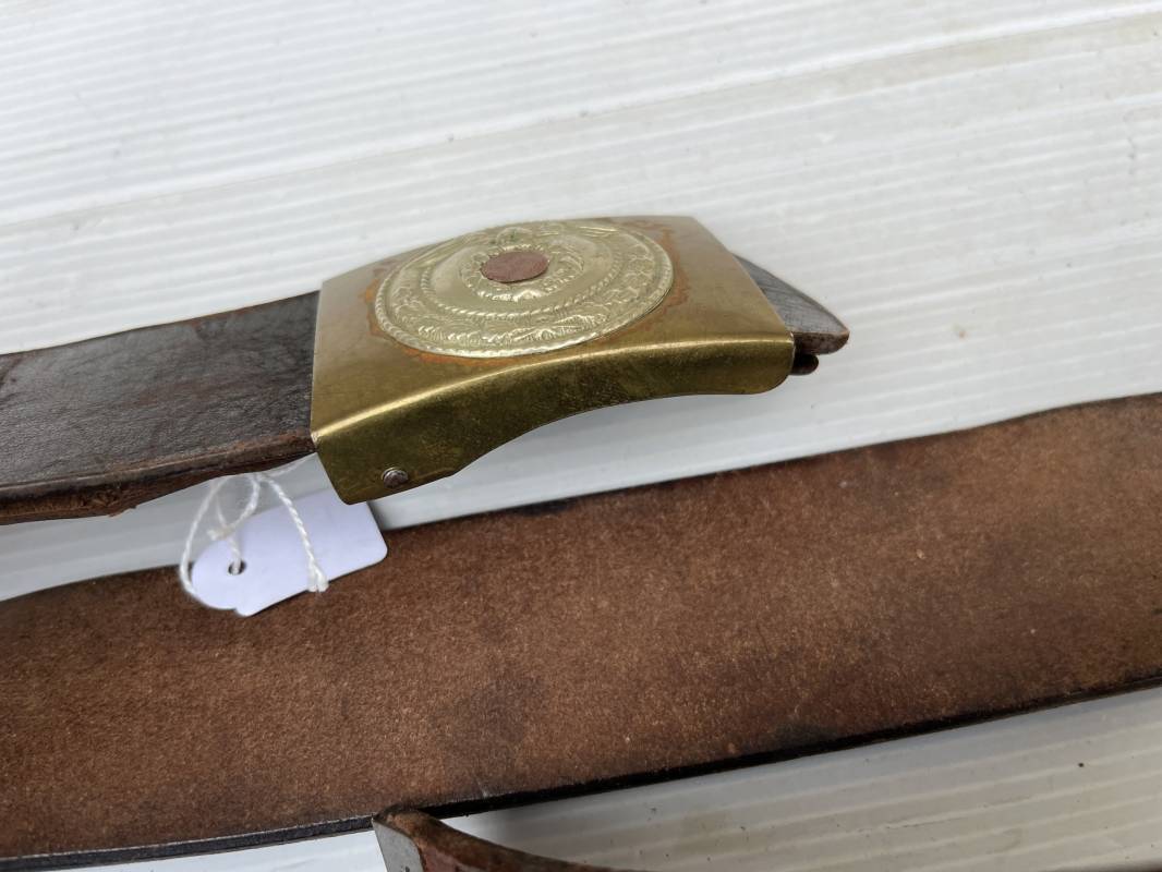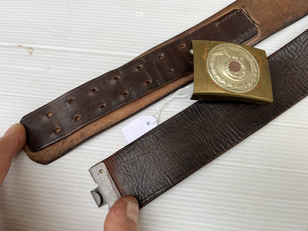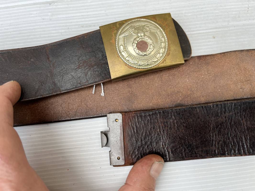 Ceinturon troupe SA ( Sturm Abteilung ) du NSDAP . Boucle en laiton avec cercle riveté en maillechort . , passant et crochet de fixation . Ceinturon en cuir marron foncé , noirci au cirage à l usage . Patelette en cuir pour réglage de taille et crochet en fer . Cuir souple Longueur 105cm .légèrement porté en parfait état 1935/45 Ref 6072