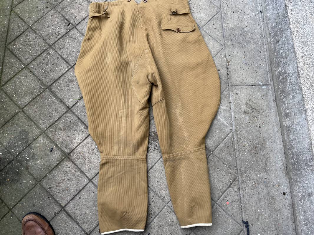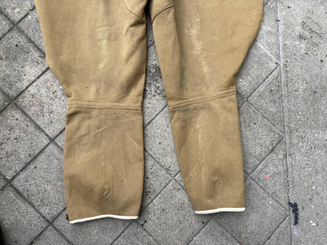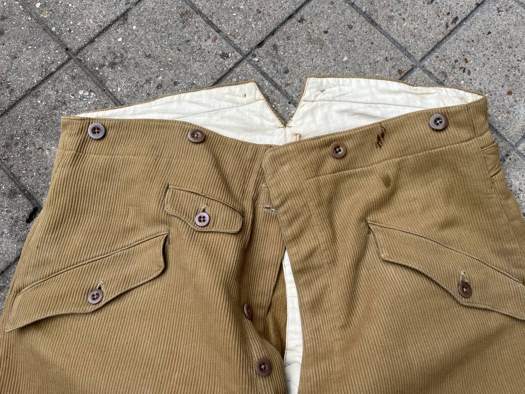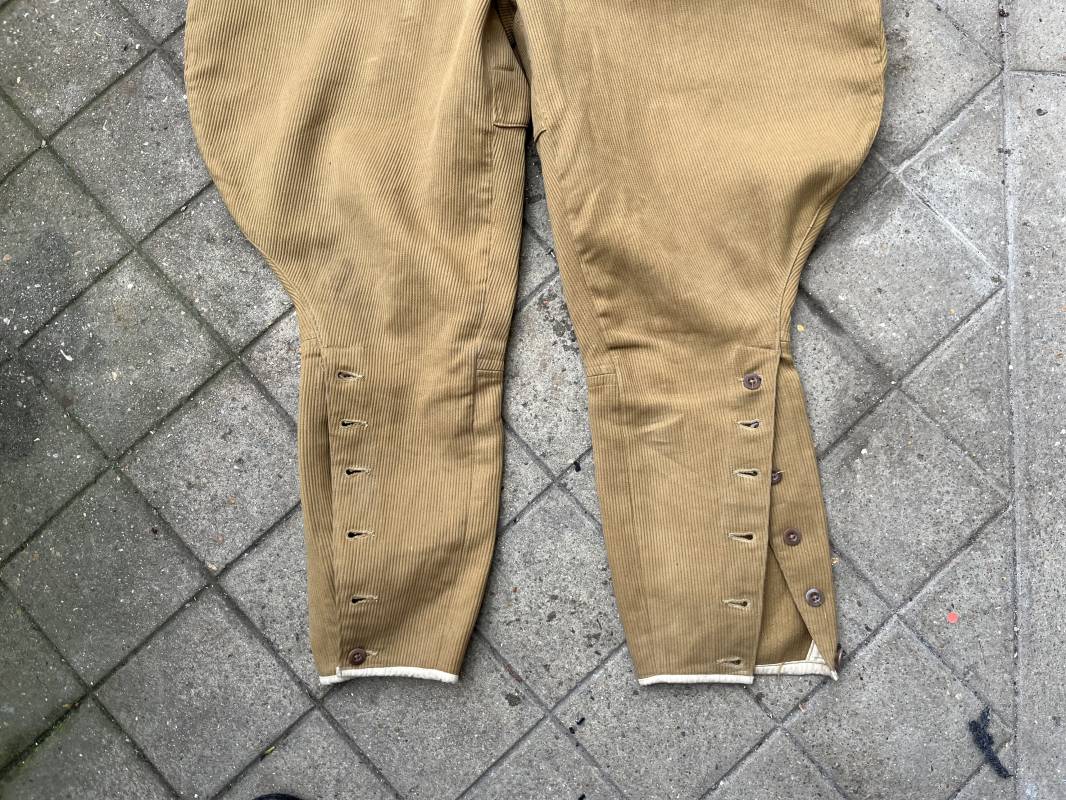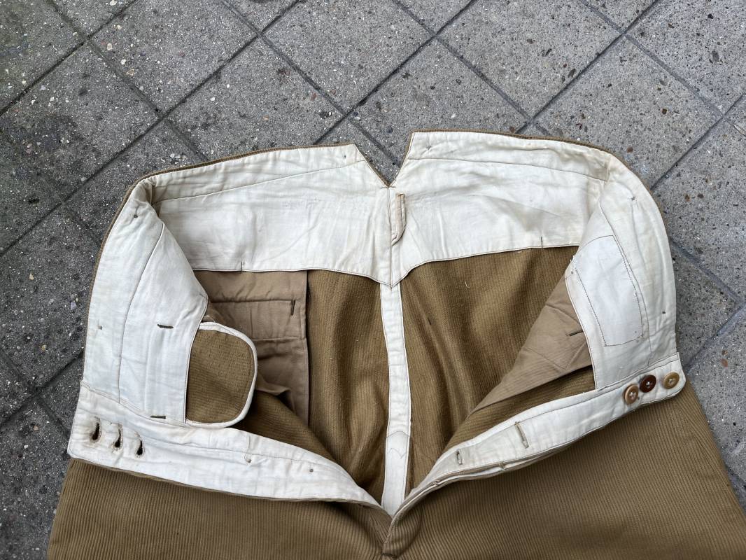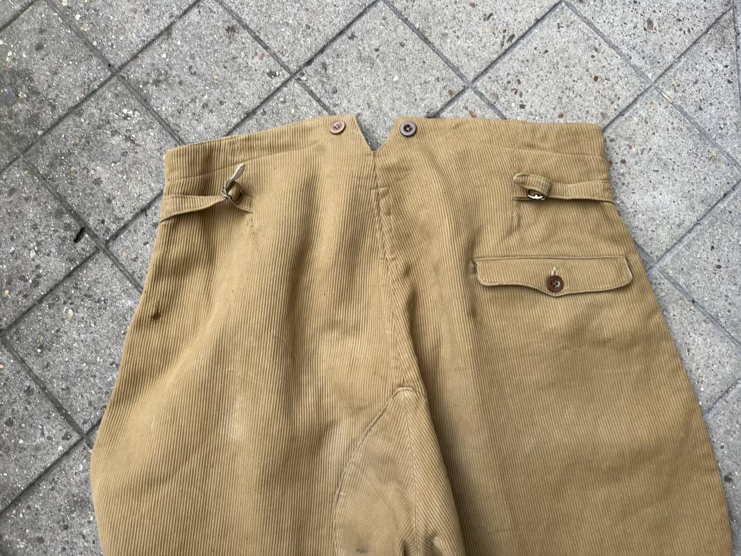 Culotte d'un membre de la SA ( Sturm Abteillung) . Tissu cotelé brun clair . Trois poches à rabats dont une fessière , poche à gousset . Deux pattes de serrage sur chaque coté . Boutons marron cousus d'origine . Bas de jambes boutonnés . Intérieur doublé coton beige . Trace d une étiquette RZM ici manquante Taille 44 Longueur 104 cm . Culotte légèrement portée en bel état . 1935/45 Ref 18604