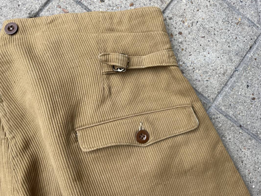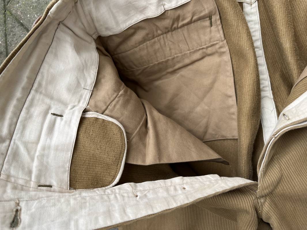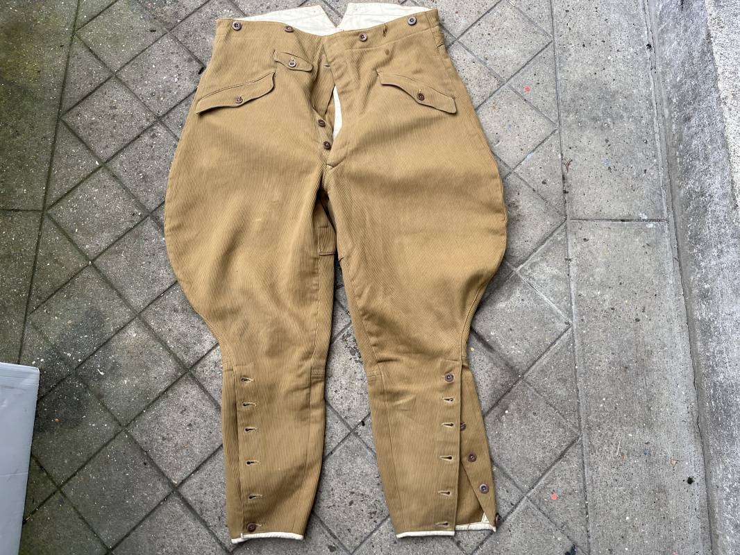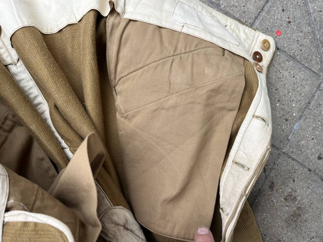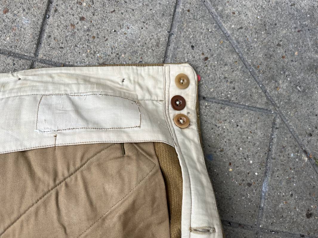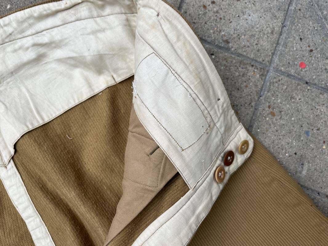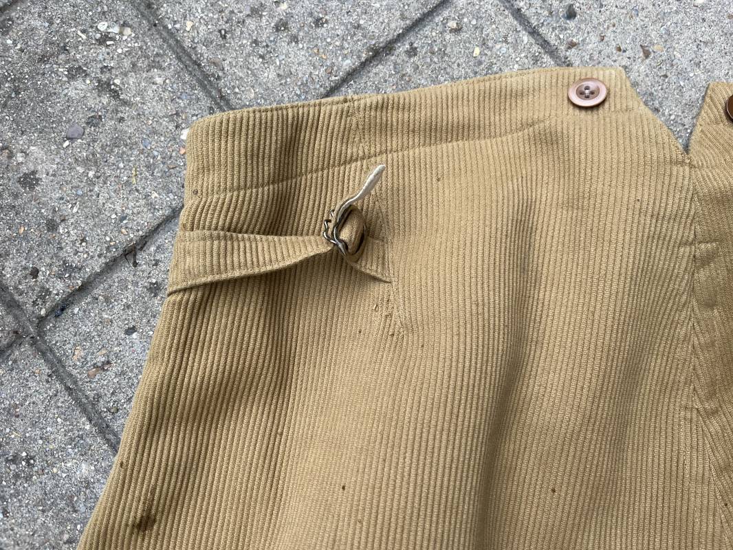 Culotte d'un membre de la SA ( Sturm Abteillung) . Tissu cotelé brun clair . Trois poches à rabats dont une fessière , poche à gousset . Deux pattes de serrage sur chaque coté . Boutons marron cousus d'origine . Bas de jambes boutonnés . Intérieur doublé coton beige . Trace d une étiquette RZM ici manquante Taille 44 Longueur 104 cm . Culotte légèrement portée en bel état . 1935/45 Ref 18604