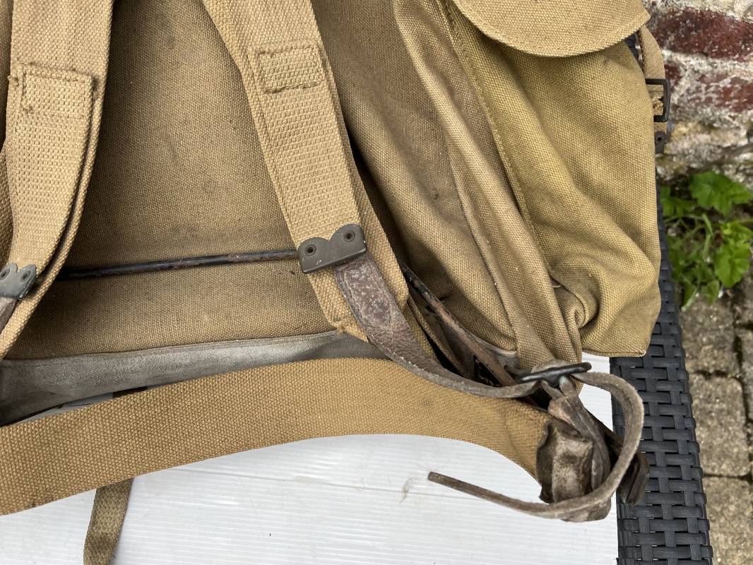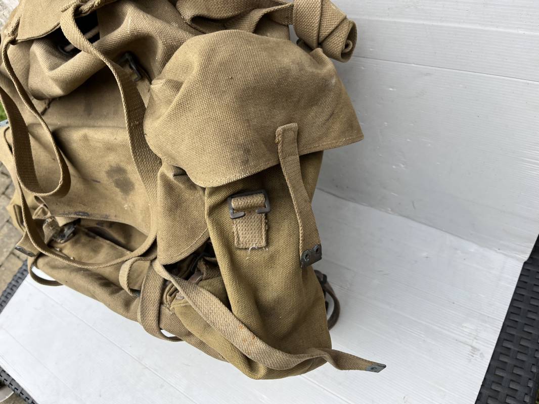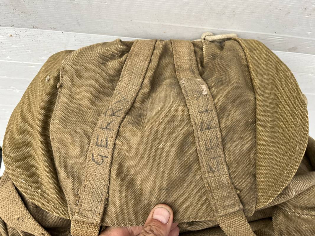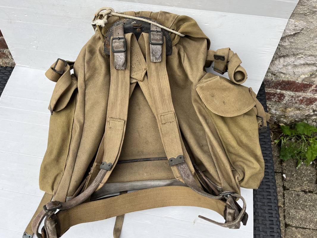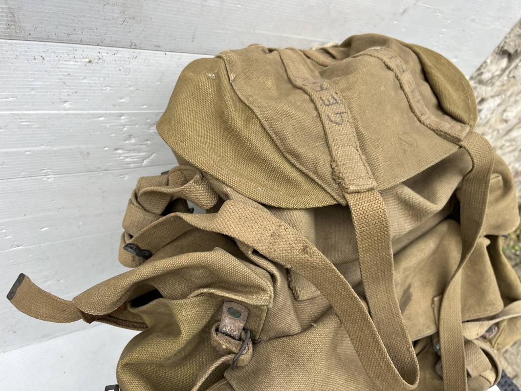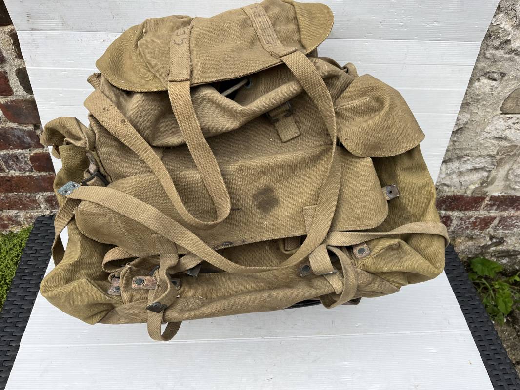 Beau sac d'assaut commando Britannique. Sac en toile caoutchoutée étanche de couleur kaki . Sangles en toile web. Boucles en laiton. Armature métallique amovible formant une claie de portage. Bretelles en toile web. Renforts en cuir. Rabat avec sangles en toile. Marquage fabricant sous le rabat marque L&B Ltd 1943 . Cordon de serrage. Légèrement porté en bon état. Bon sac commando 1942/45. Ref 12017
