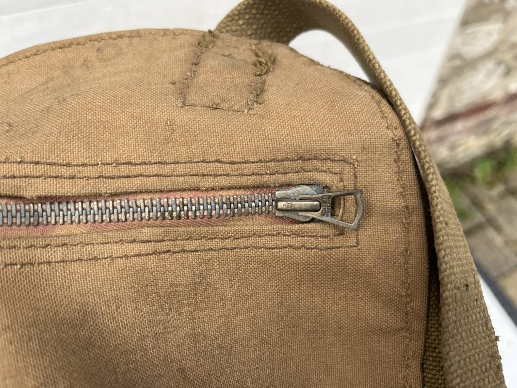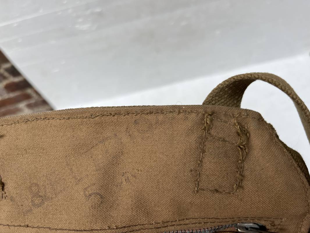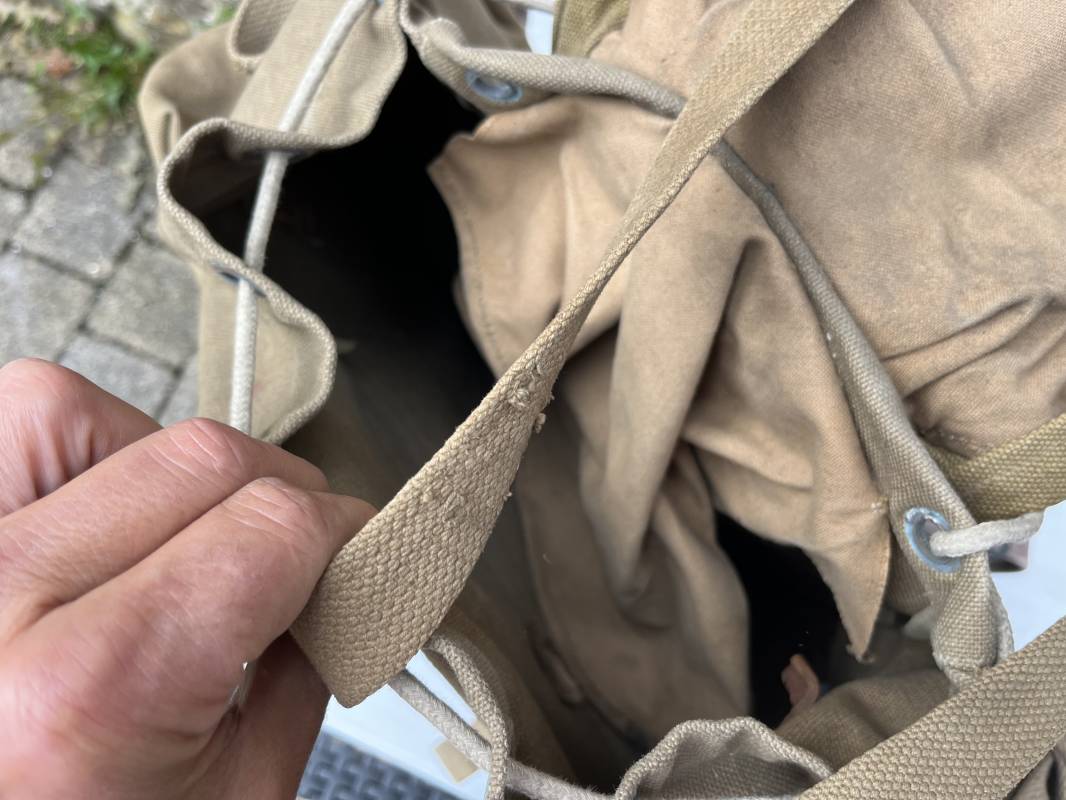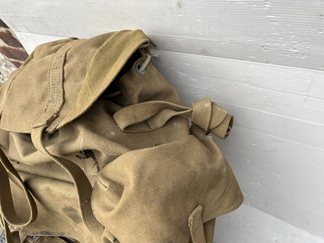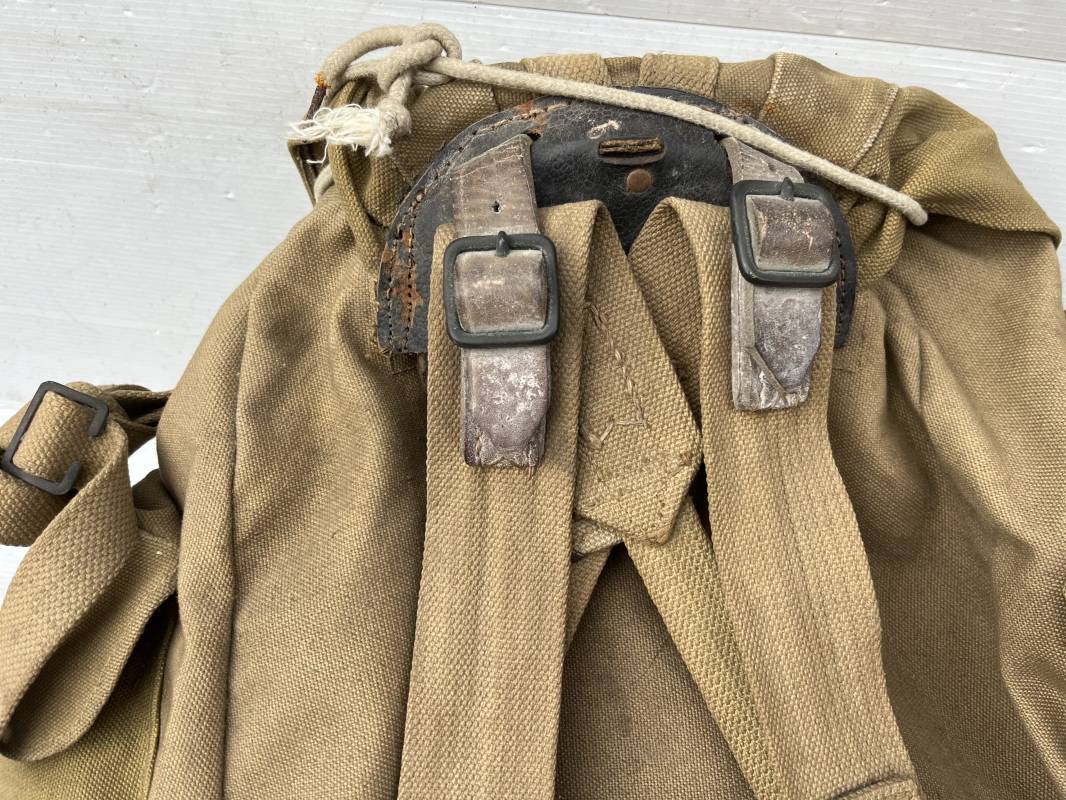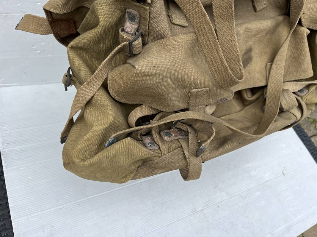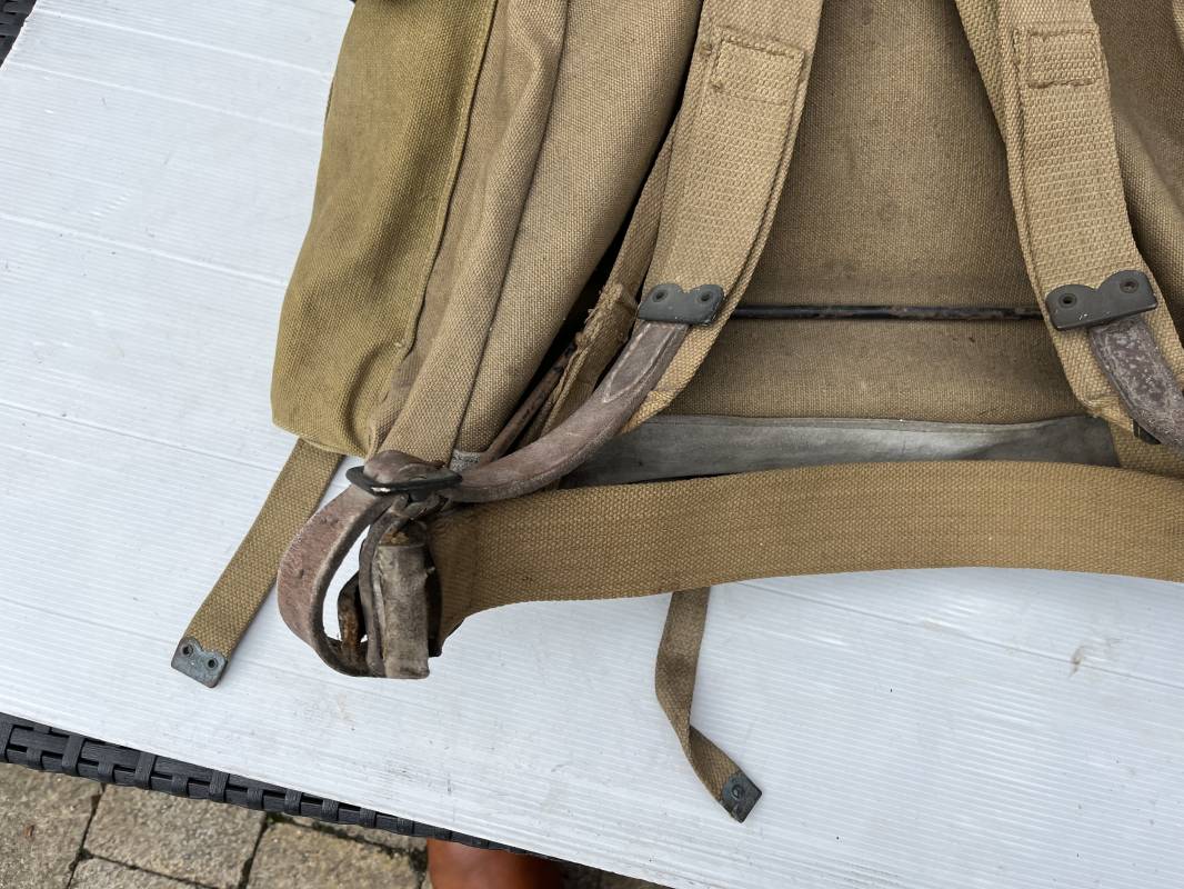 Beau sac d'assaut commando Britannique. Sac en toile caoutchoutée étanche de couleur kaki . Sangles en toile web. Boucles en laiton. Armature métallique amovible formant une claie de portage. Bretelles en toile web. Renforts en cuir. Rabat avec sangles en toile. Marquage fabricant sous le rabat marque L&B Ltd 1943 . Cordon de serrage. Légèrement porté en bon état. Bon sac commando 1942/45. Ref 12017