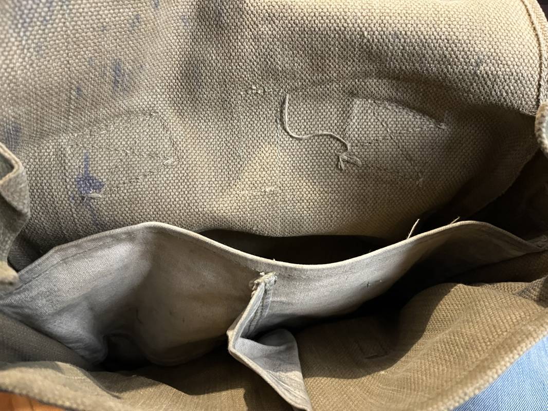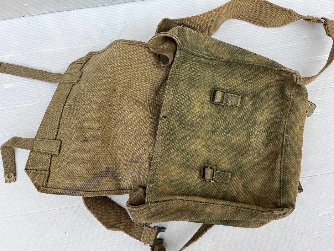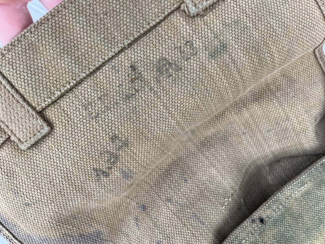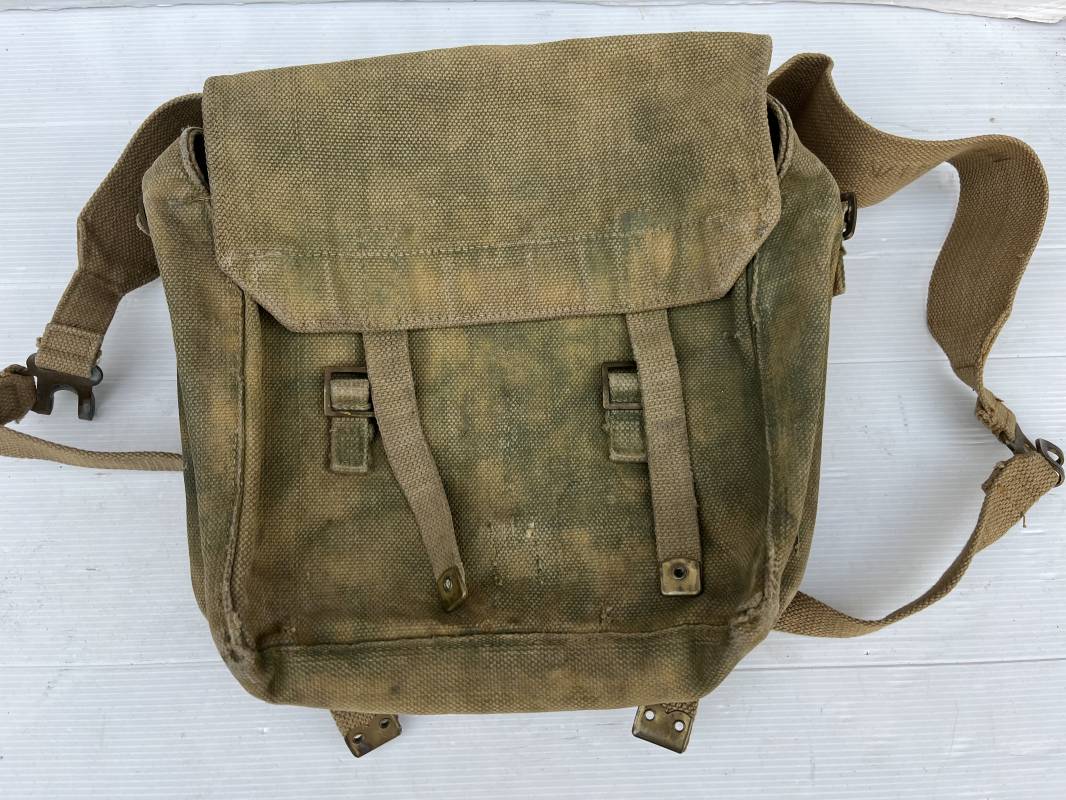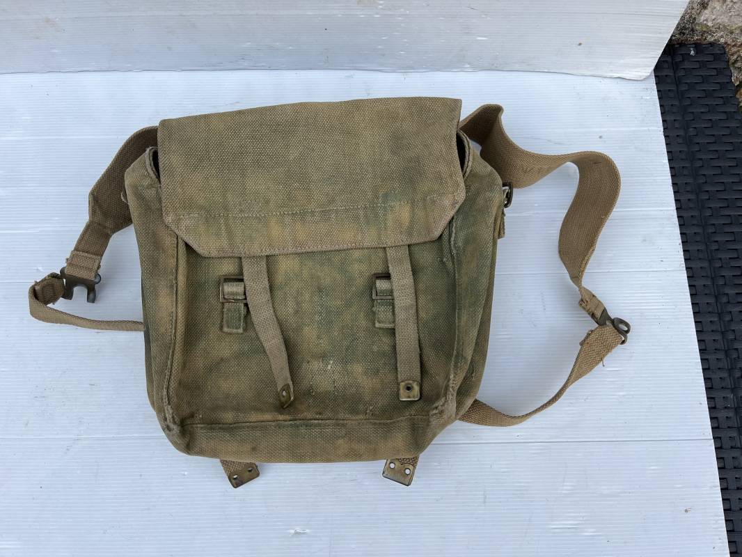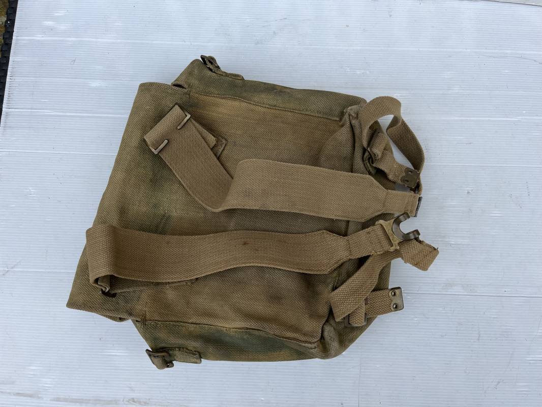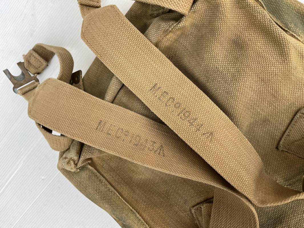 Sac à dos d assaut (small pack). Pattern 1937 en toile web de coton filet beige , blancoté . Boucles laiton, marquage fabricant sous rabat CE LY 1943 .Compartiments intérieurs en toile . Bretelles de suspension avec crochets laiton , marquages MECo 1943/44 . Sac trouvé en brocante dans le Calvados . Porté en bel état. Ref 21603