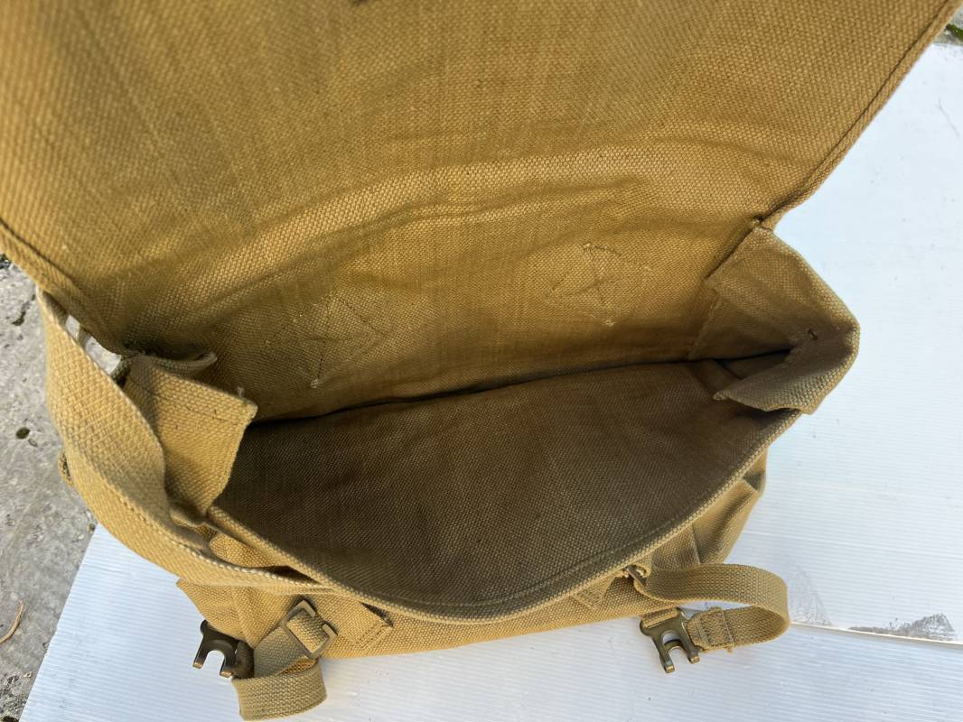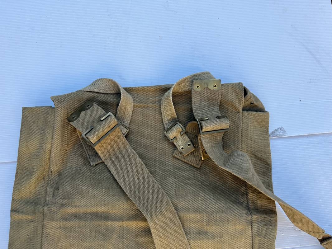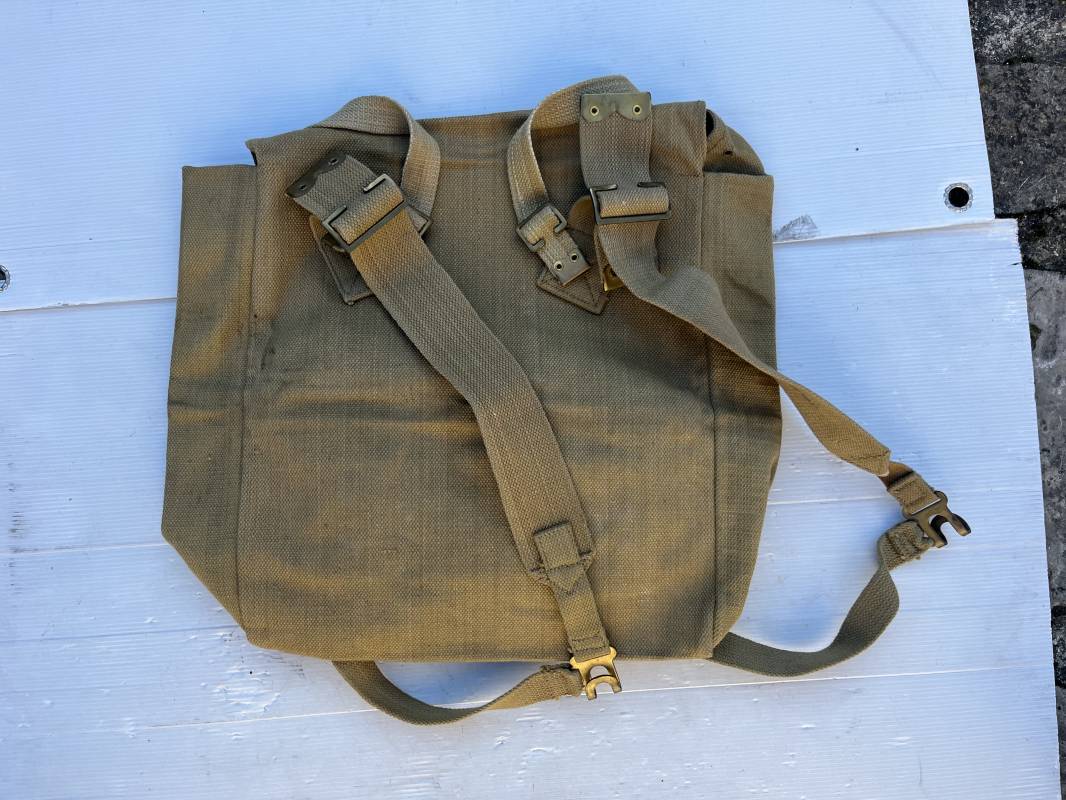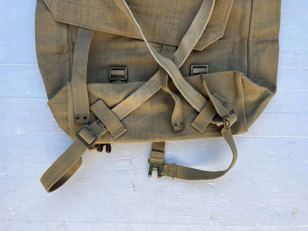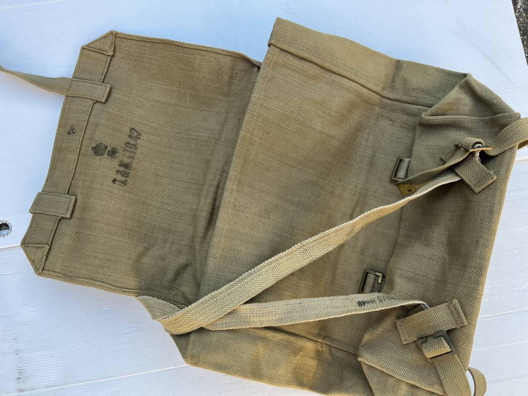 Sac à dos de marche (large pack). Pattern 1937 en toile web. Boucles laiton, marquage fabricant Q & N 1942. Bretelles de suspension avec crochets laiton , marquages encre . Deux sangles de charges avec boucles laiton. Bel ensemble en parfait état. Ref 21831