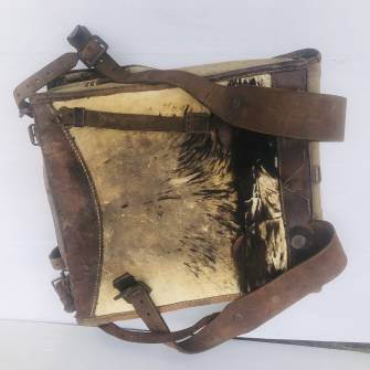 Sac à dos Mdle 1888 en forte toile de coton verte , bretelles en cuir marron . Sac à dos de dotation avec cadre en bois , et forte toile de couleur verte typique des confection de guerre . Intérieur avec pochette , sangles cuir . Partie dorsale du sac en poils de veau . Passants en cuir pour fixation des équipements . Bretelles en cuir retourné marron foncé avec contre sanglons de fixation en cuir . Boucles et crochets métalliques . Marquage fabricant . Sac porté dans son jus en bon état . Belle patine générale 1915/18 Ref 18424