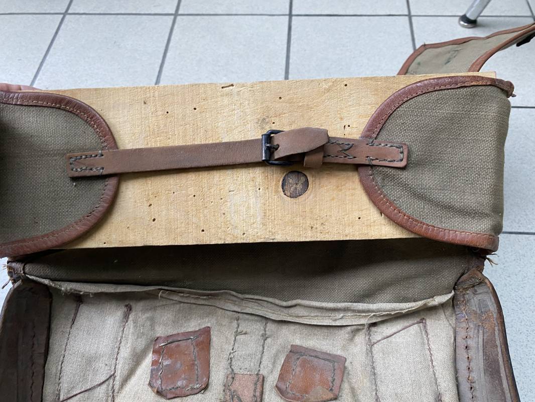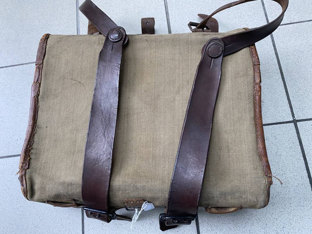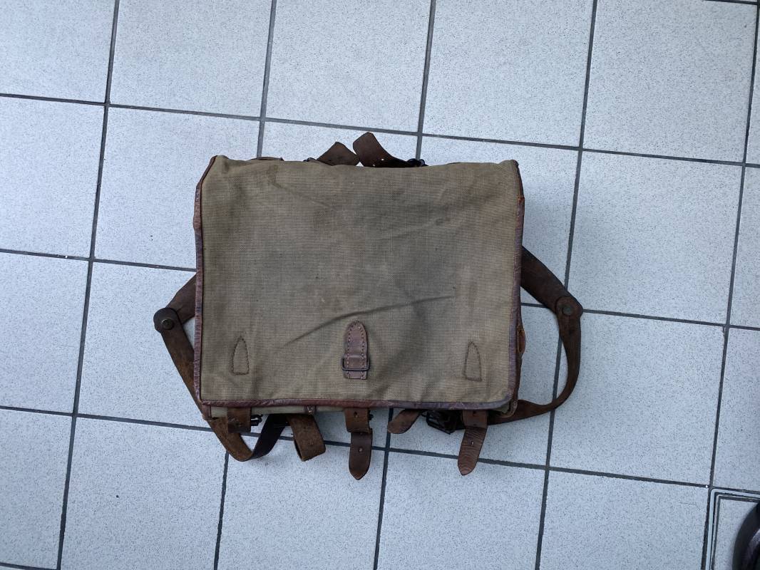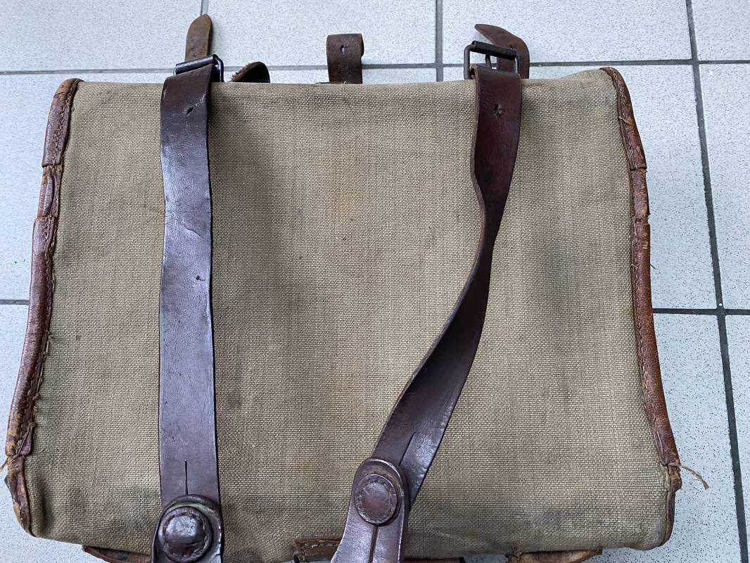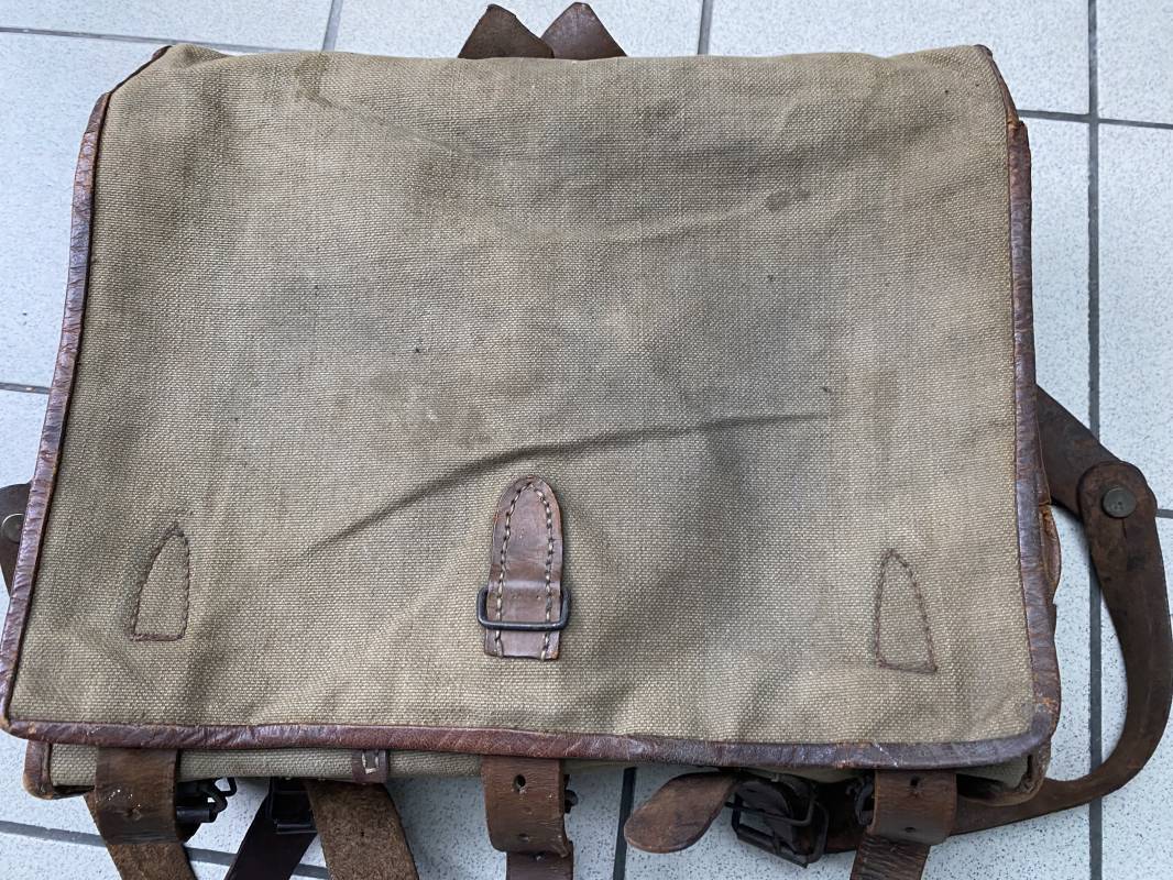 Bon sac à dos modèle 1893/15 en toile kaki avec ses bretelles en cuir marron. Sac à dos 'as de carreau'. Cadre en bois. Passants cuir et fer pour fixation des équipements. Boucles métalliques, pochette intérieure avec rabat. Tampon oval de réception daté 1928. Bretelles en cuir marron. Sac porté en bon état. Bon équipement pour fantassin français en 1935/40. Ref 17990
