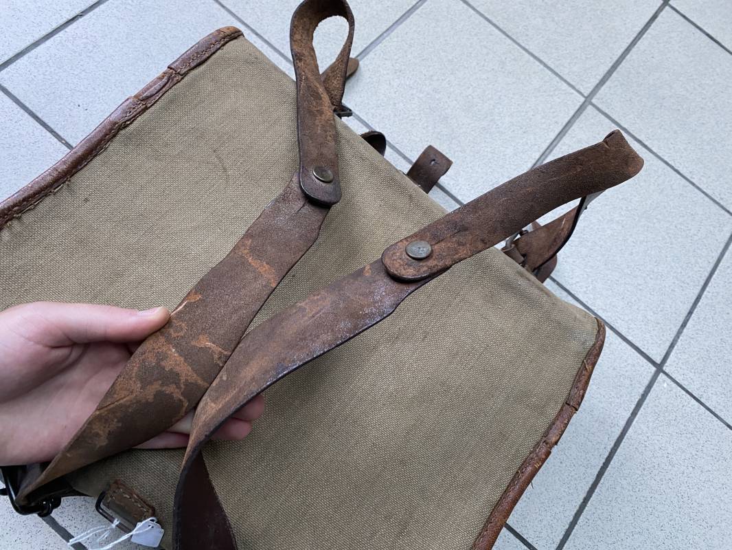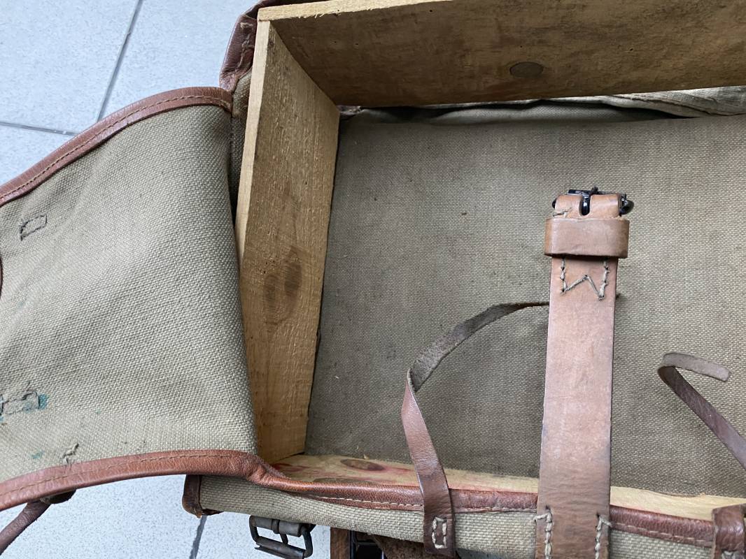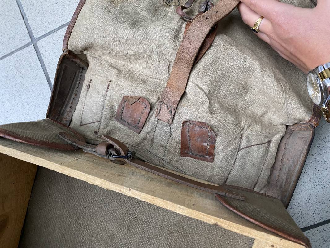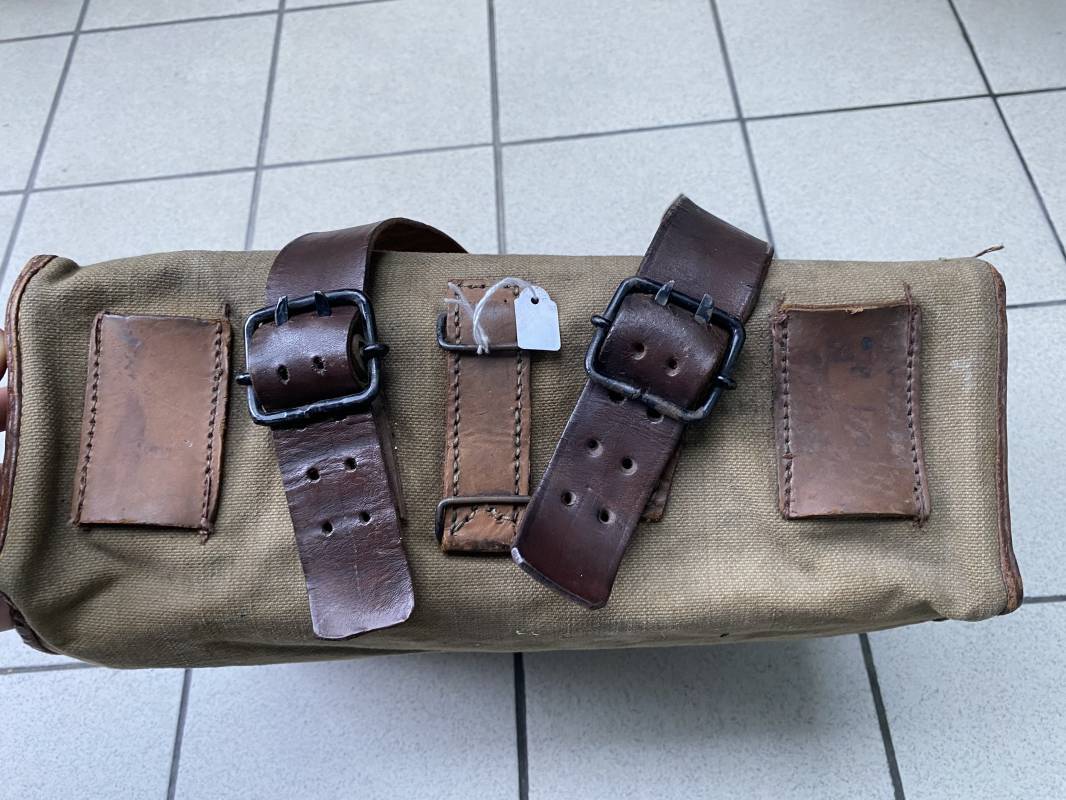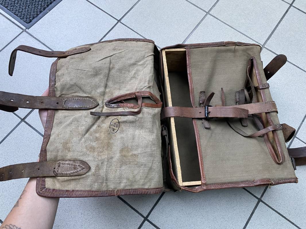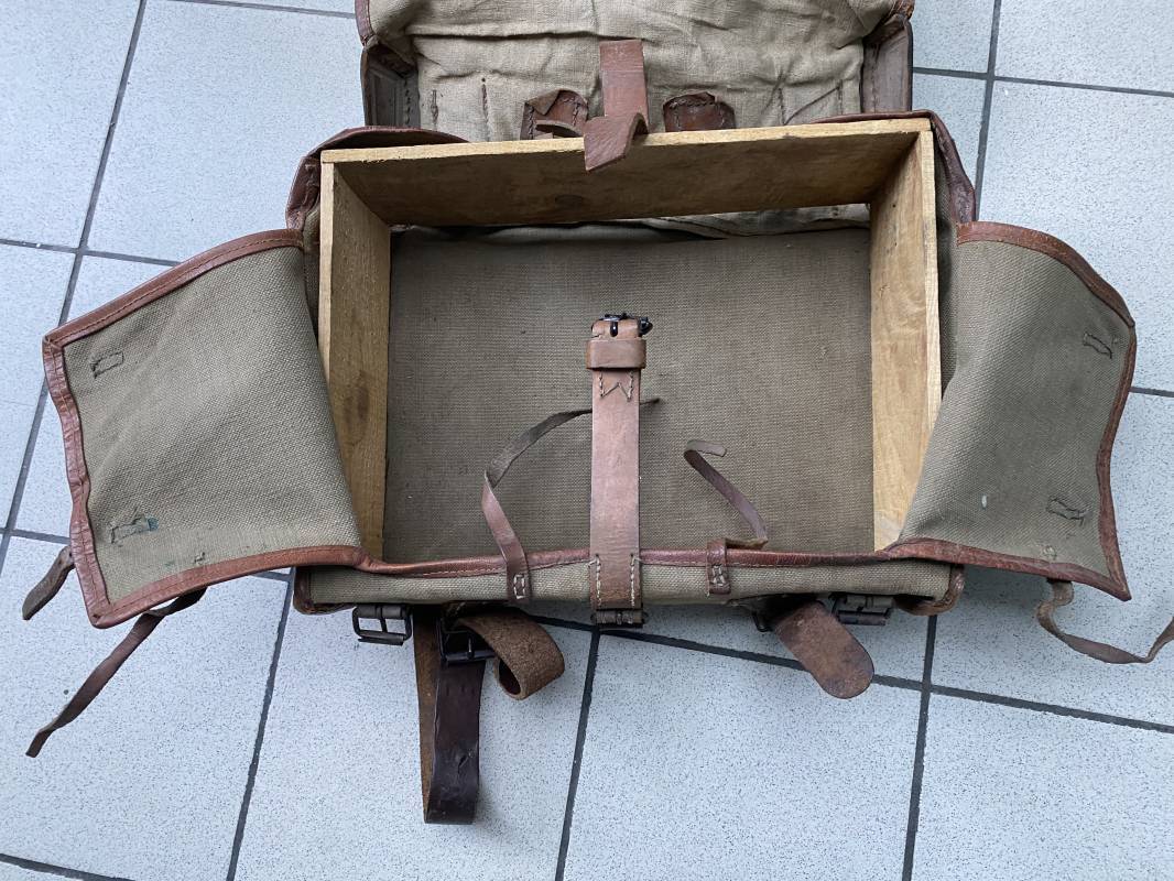Bon sac à dos modèle 1893/15 en toile kaki avec ses bretelles en cuir marron. Sac à dos 'as de carreau'. Cadre en bois. Passants cuir et fer pour fixation des équipements. Boucles métalliques, pochette intérieure avec rabat. Tampon oval de réception daté 1928. Bretelles en cuir marron. Sac porté en bon état. Bon équipement pour fantassin français en 1935/40. Ref 17990