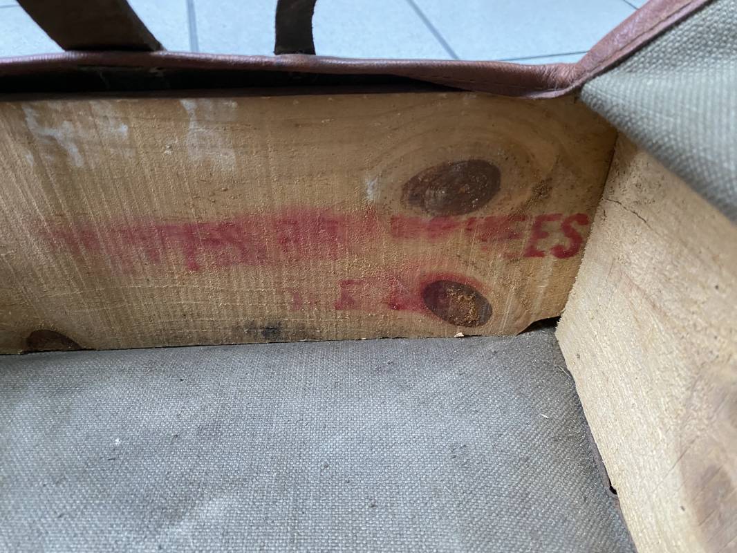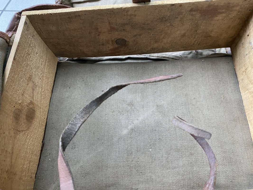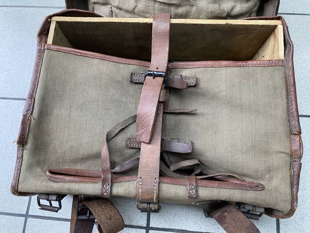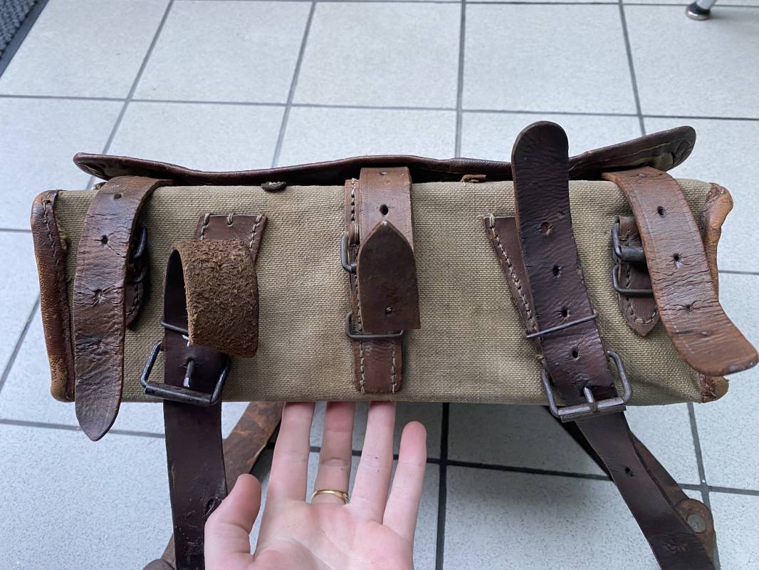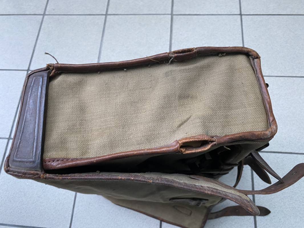 Bon sac à dos modèle 1893/15 en toile kaki avec ses bretelles en cuir marron. Sac à dos 'as de carreau'. Cadre en bois. Passants cuir et fer pour fixation des équipements. Boucles métalliques, pochette intérieure avec rabat. Tampon oval de réception daté 1928. Bretelles en cuir marron. Sac porté en bon état. Bon équipement pour fantassin français en 1935/40. Ref 17990