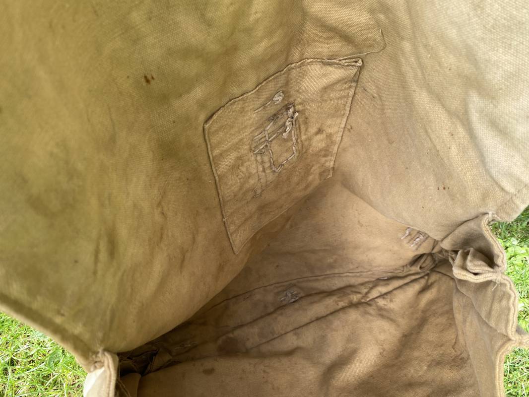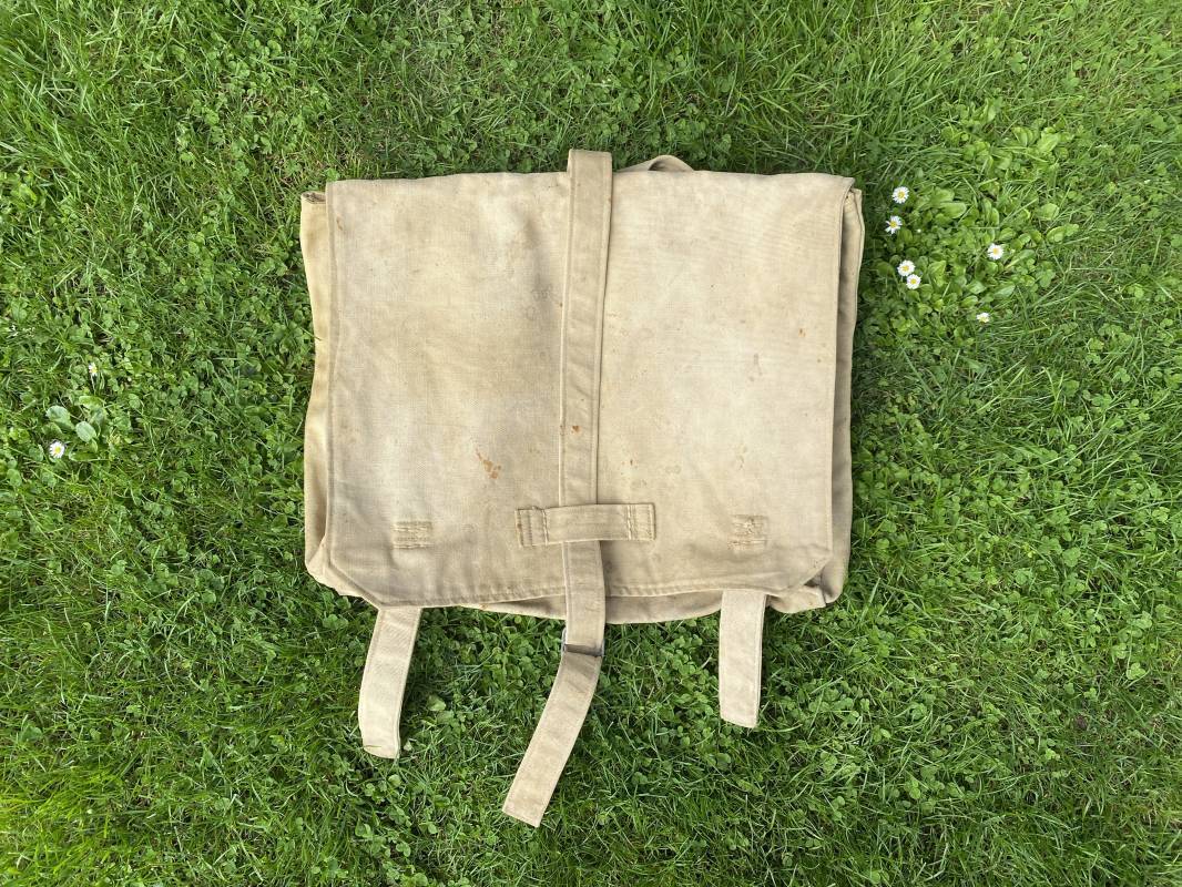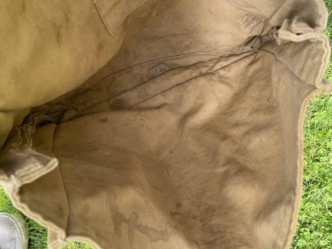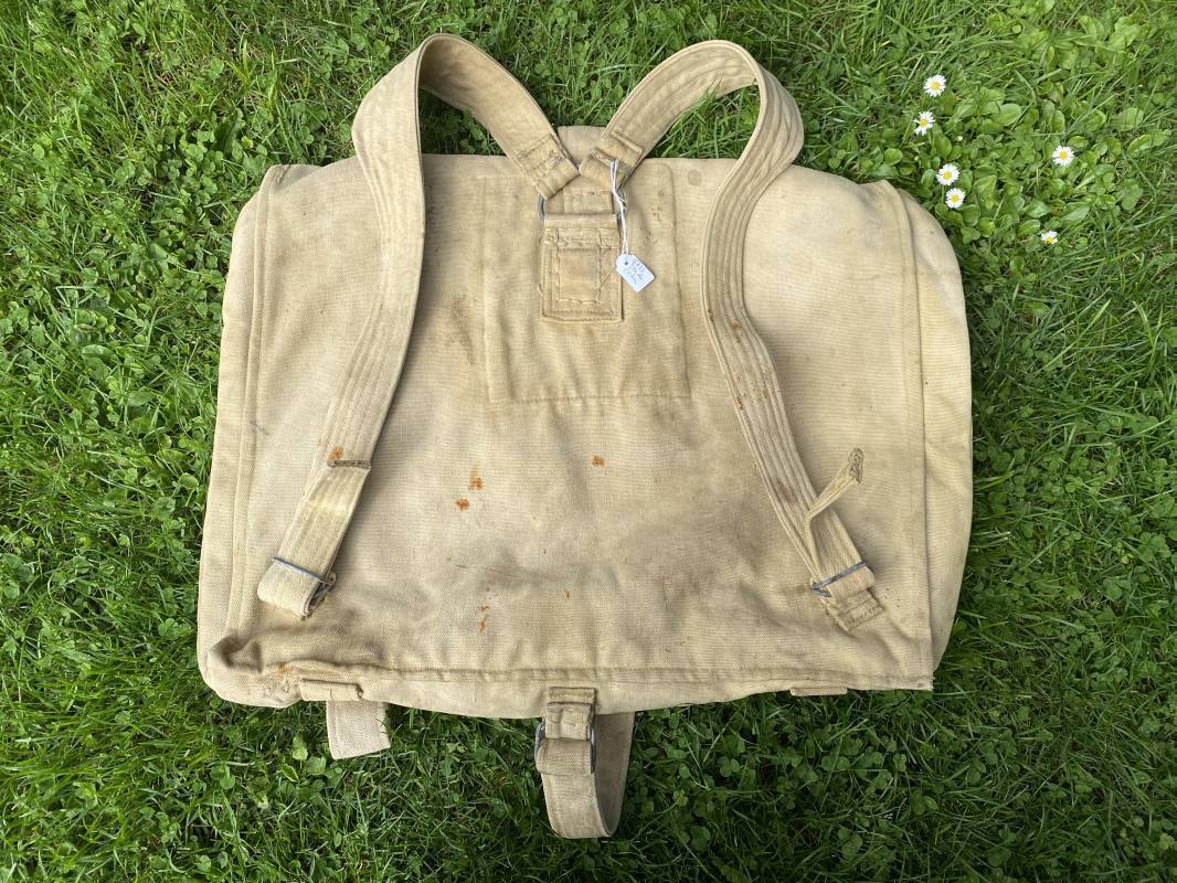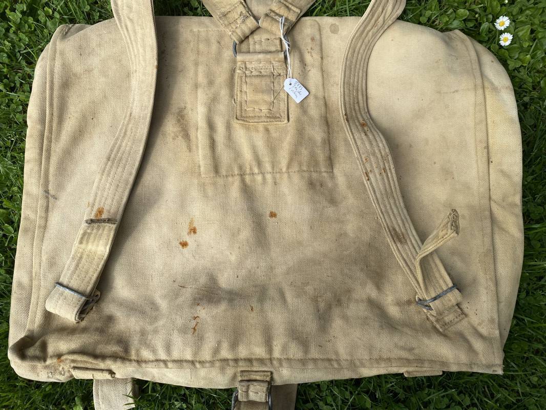 Sac a dos modéle 1915 de fabrication Ersatz . Forte toile kaki clair . Bretelles toile et boucleries métalliques . Grande sangle frontale pour le port de la marmitte et équipements divers . Sac porté en bon état . Fabrication dite 'de fortune' typique de l'année 1915 Equipement ersatz peu courant 1915/18 Ref 5773