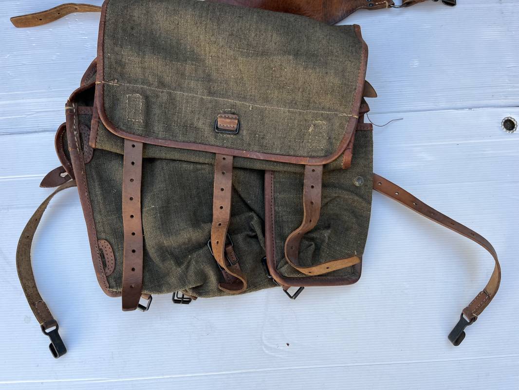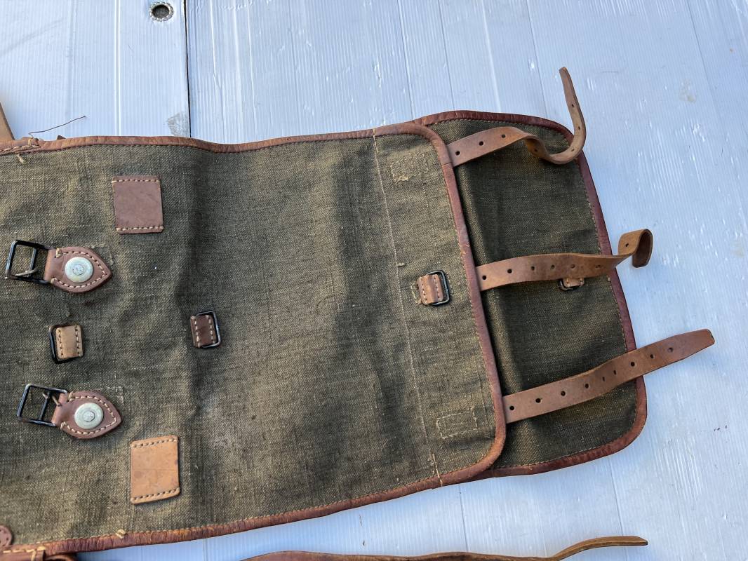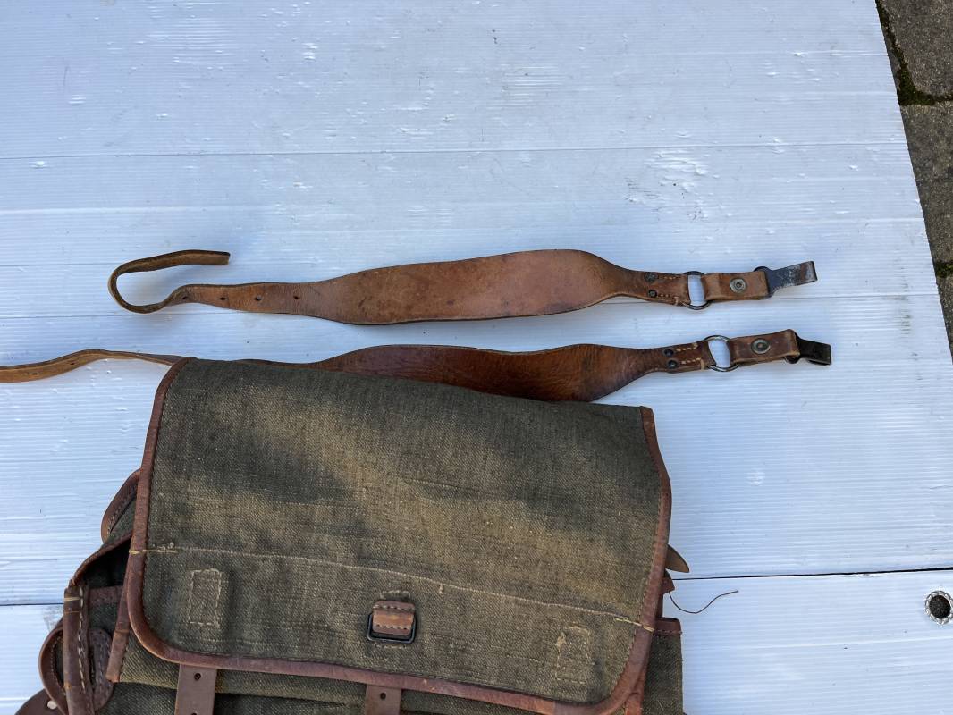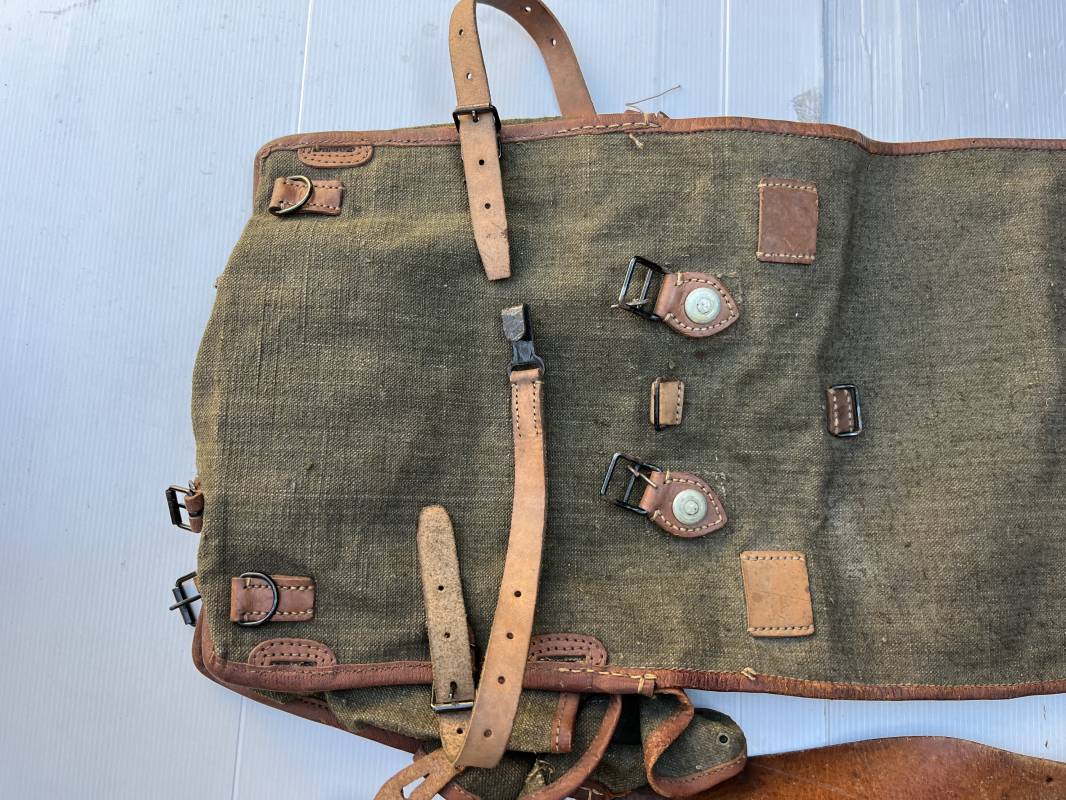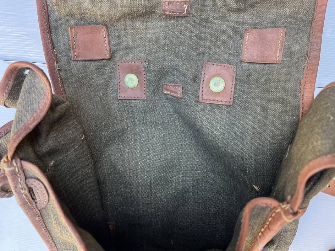 Trés beau Sac à dos modéle 1935 , bretelles et contre sanglons en cuir fauve . Sac à dos en forte toile kaki , ourlé en cuir fauve . Deux poches latérales à munitions , rabat avec lanières en cuir . Passants métalliques pour fixation des équipements . Bretelles en cuir fauve avec crochets métalliques plats . Deux contre sanglons en cuir avec crochets fer plats . Trés beau sac à dos de dotation pour troupe à pied , légérement porté en parfait état . 1935/40 Ref 21808