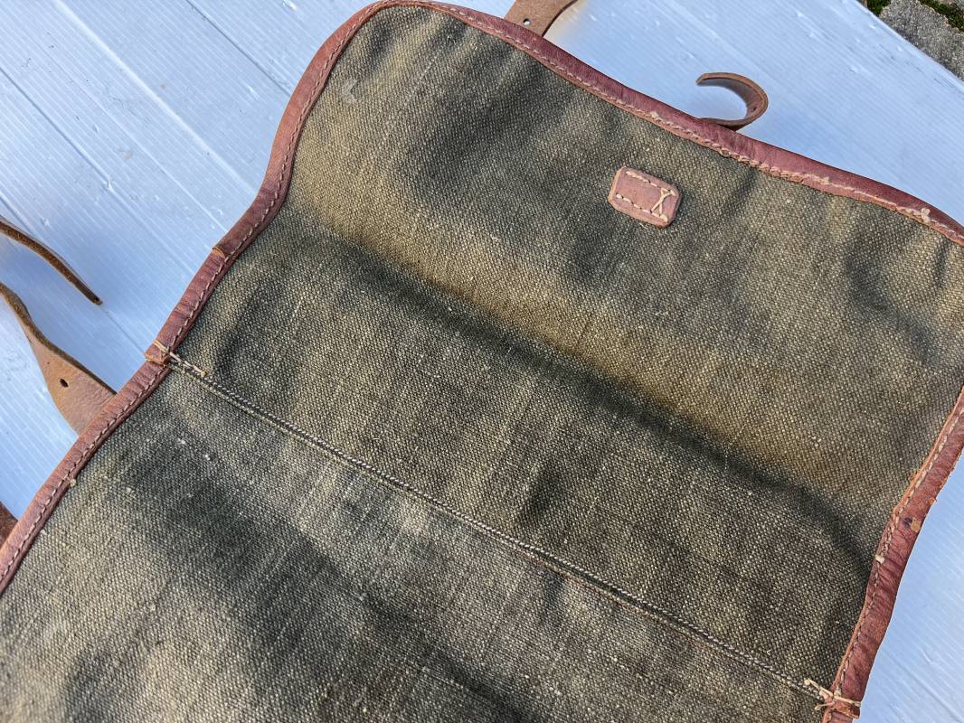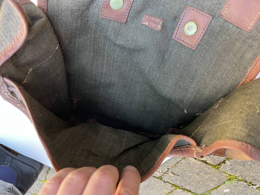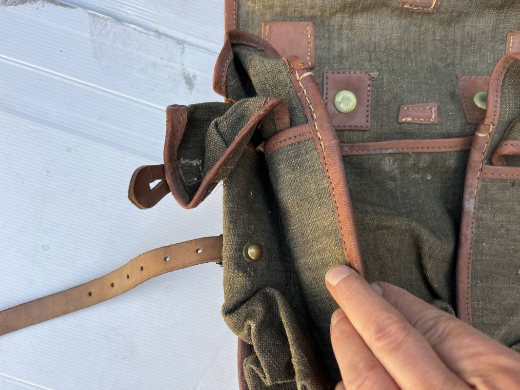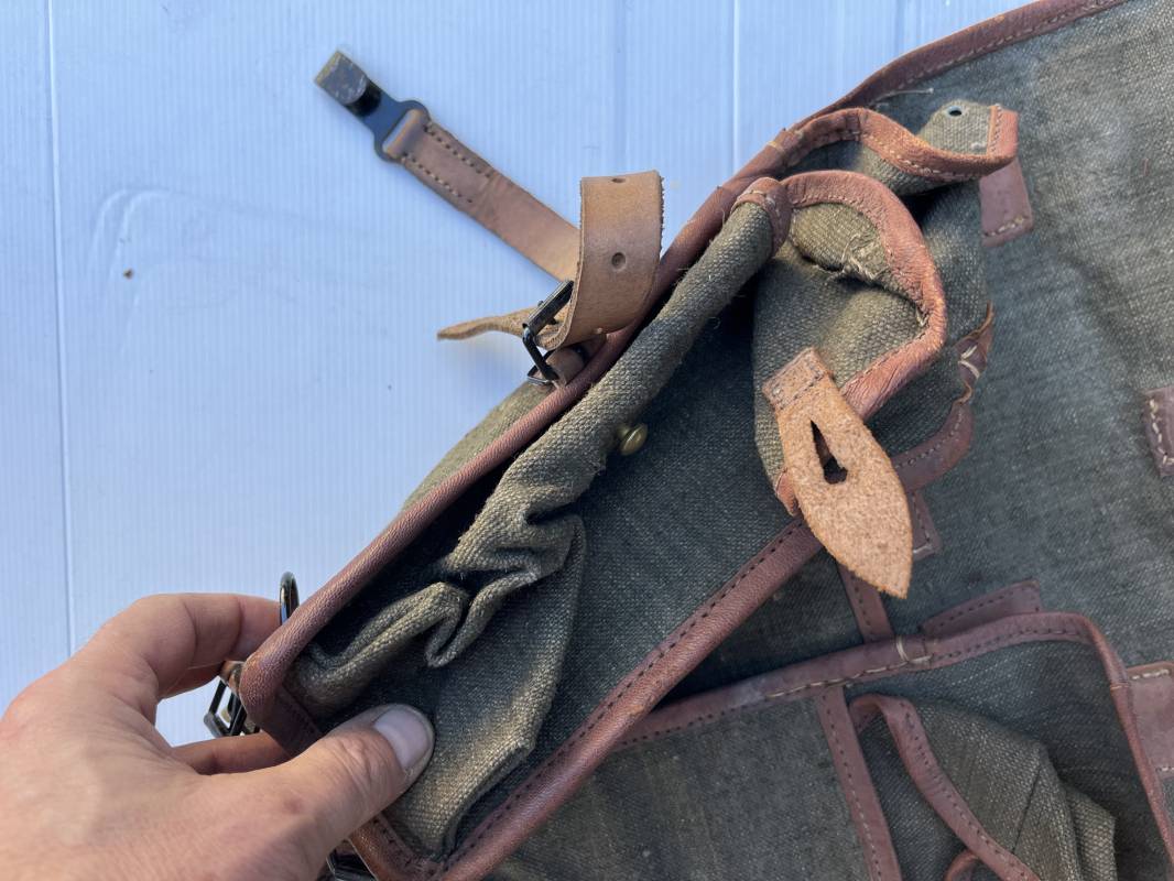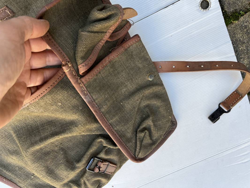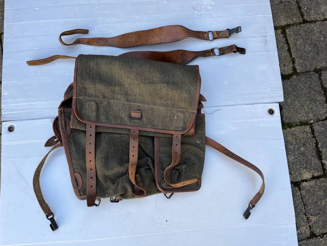 Trés beau Sac à dos modéle 1935 , bretelles et contre sanglons en cuir fauve . Sac à dos en forte toile kaki , ourlé en cuir fauve . Deux poches latérales à munitions , rabat avec lanières en cuir . Passants métalliques pour fixation des équipements . Bretelles en cuir fauve avec crochets métalliques plats . Deux contre sanglons en cuir avec crochets fer plats . Trés beau sac à dos de dotation pour troupe à pied , légérement porté en parfait état . 1935/40 Ref 21808