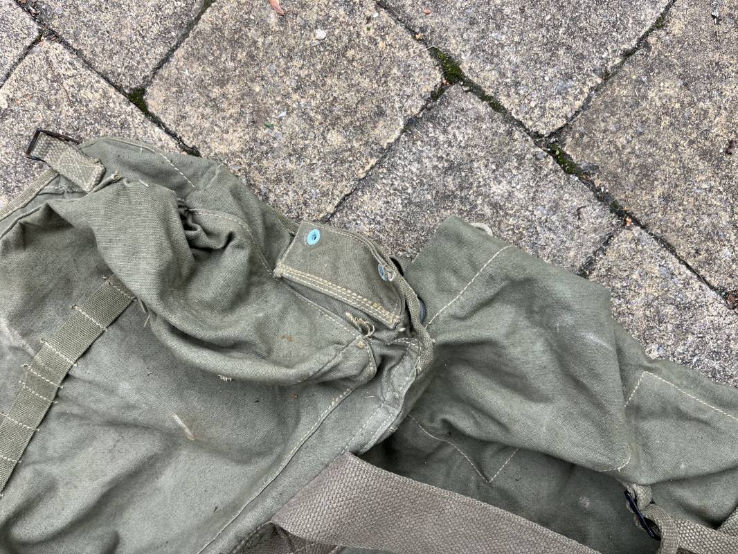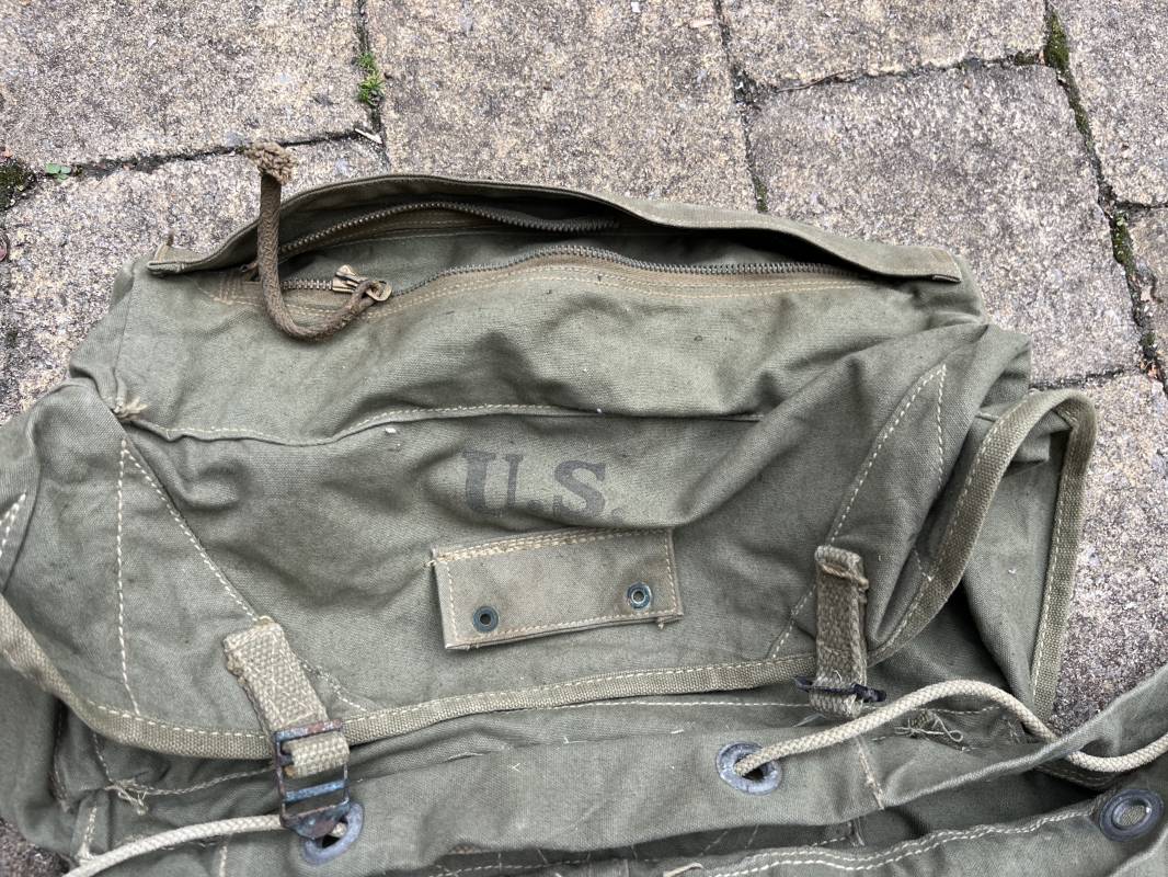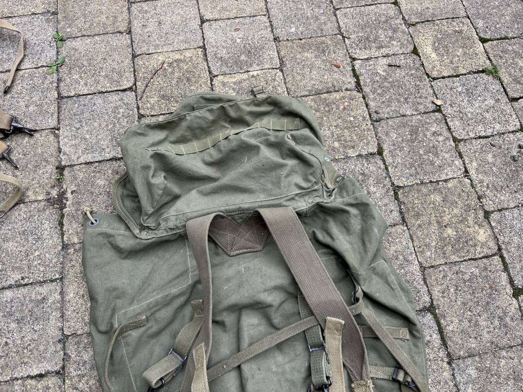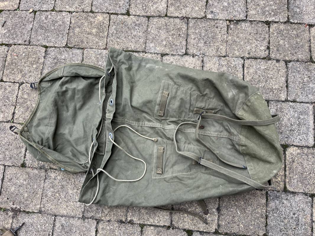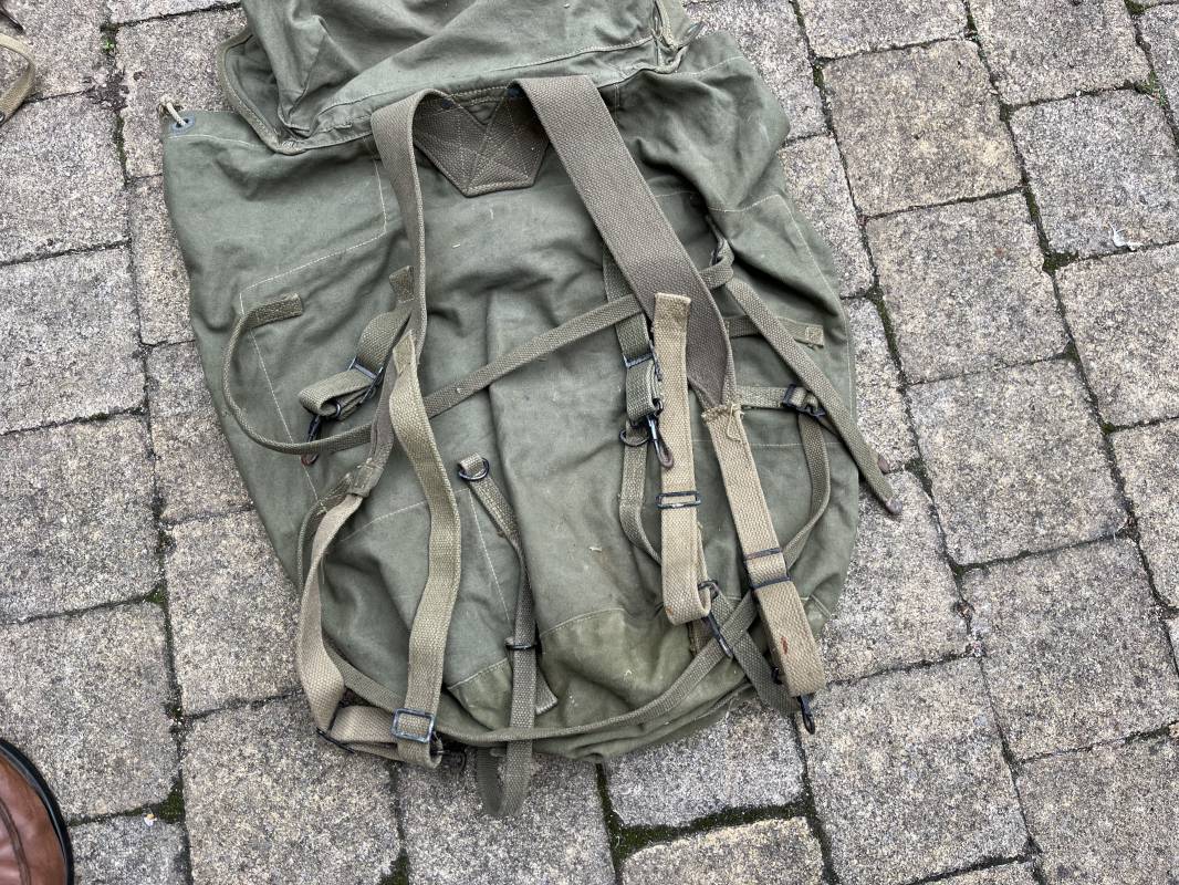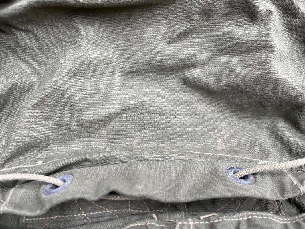 Sac à dos modéle 1943 en forte toile vert foncé . Complet avec toutes ses sangles et boucles métalliques . Marquage encre fabricant Laird Schober 1944 . Rabat avec fermeture a glissière d 'origine mais non fonctionnelle . Bretelles en toile avec boucles et crochets métalliques Sac porté en bel état 1944/45 Ref 21177