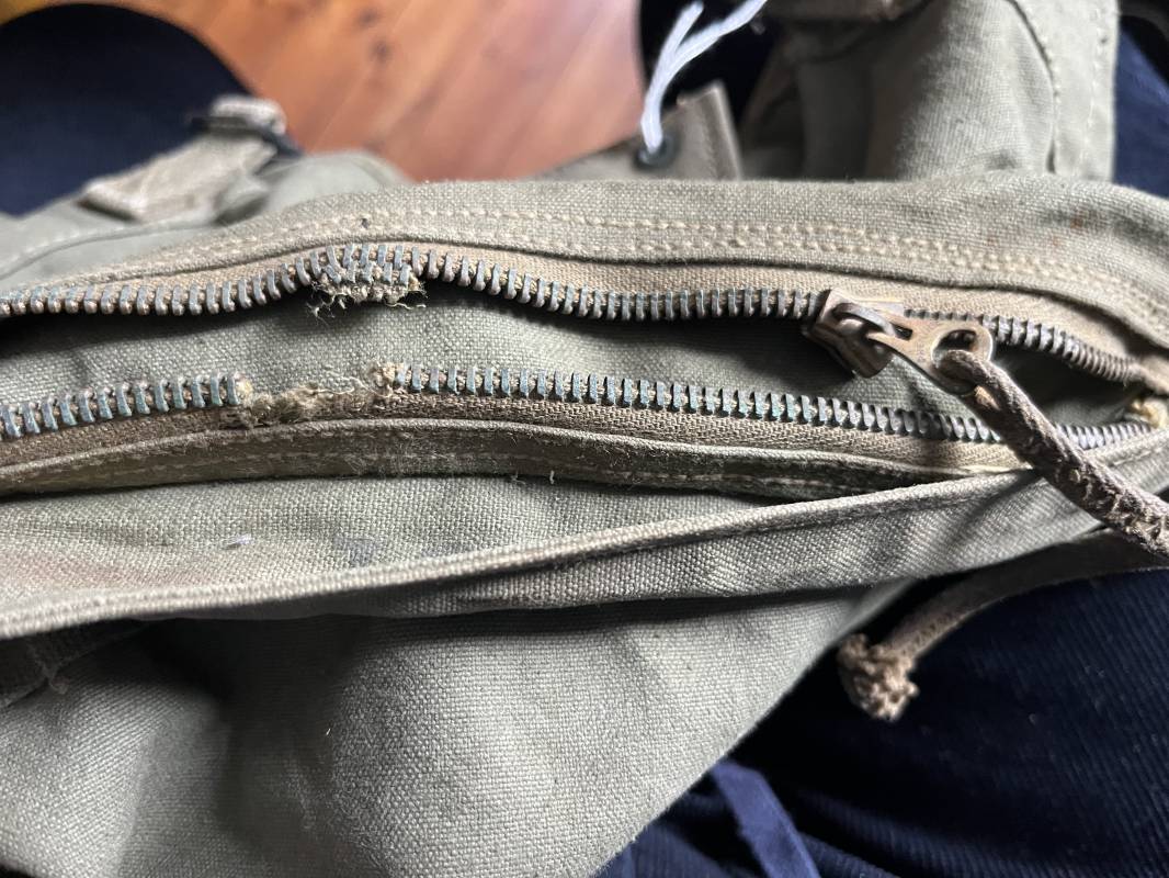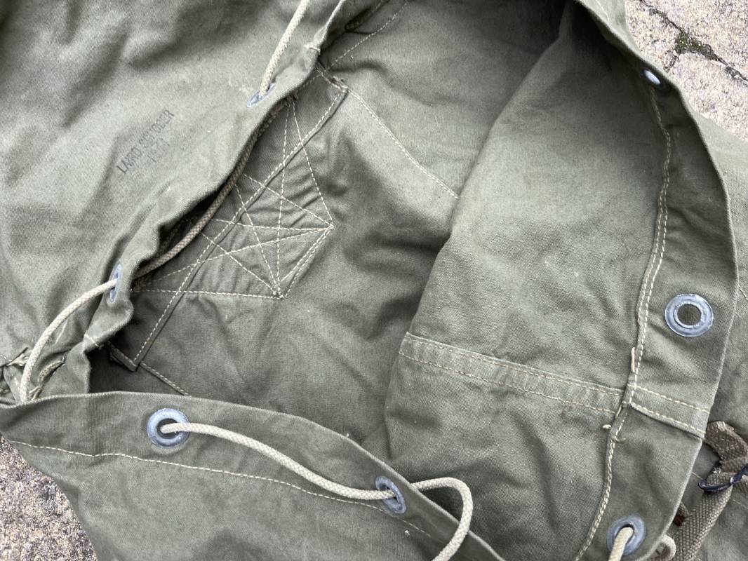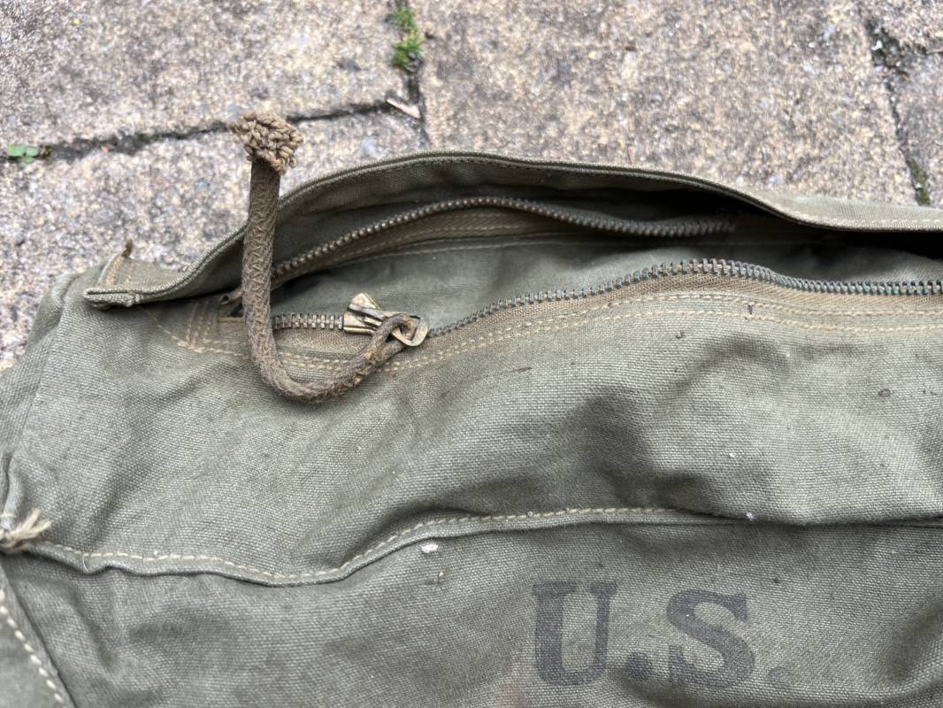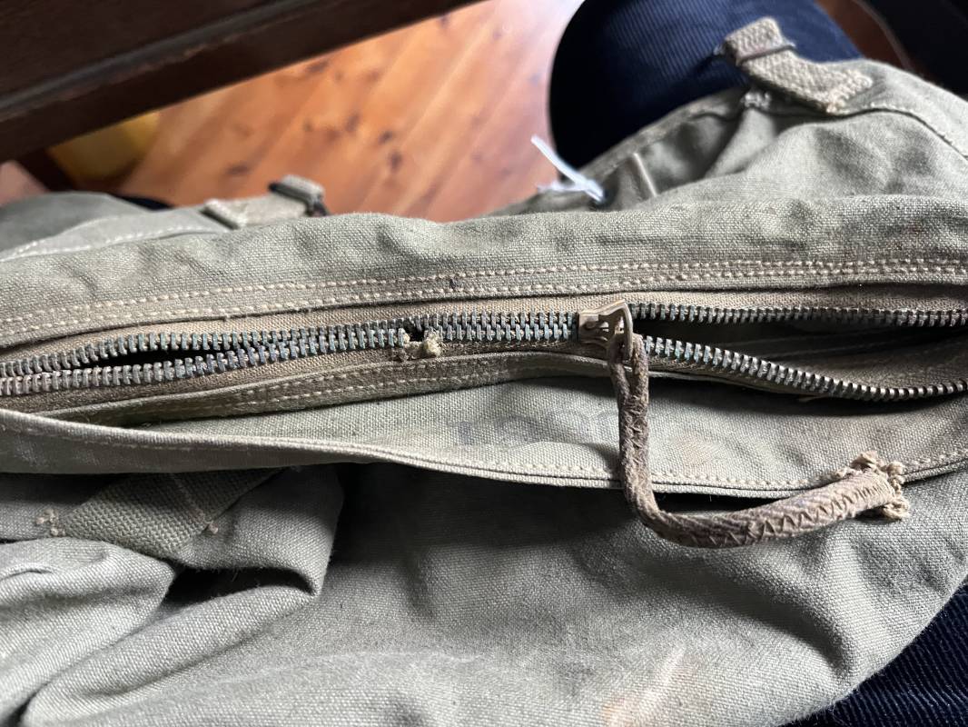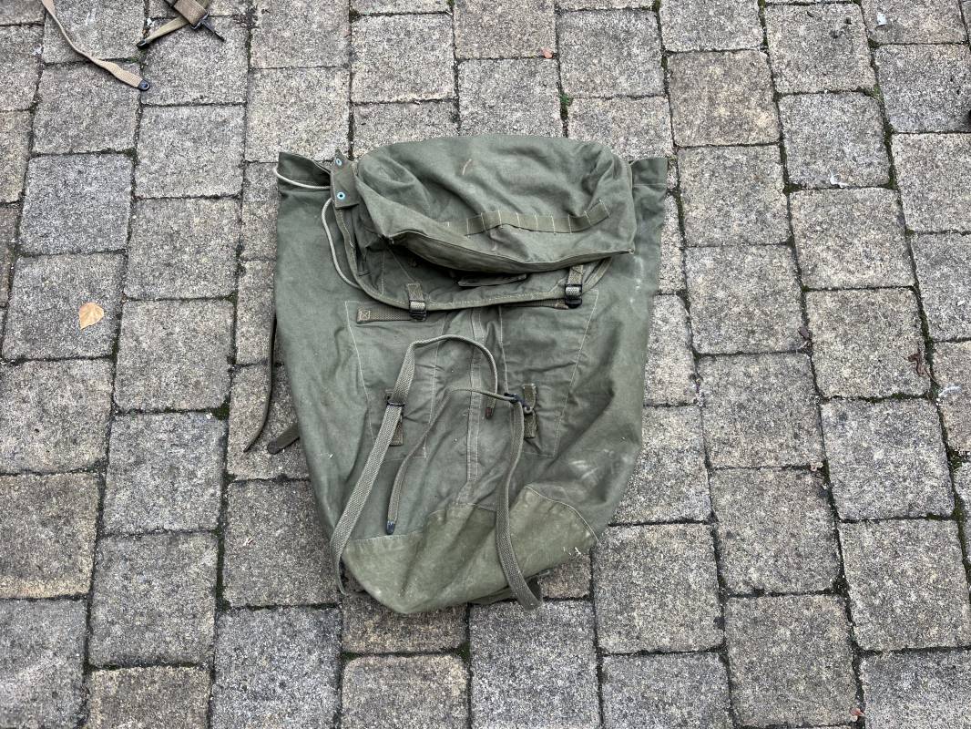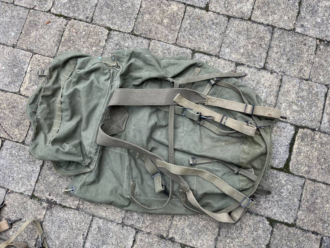 Sac à dos modéle 1943 en forte toile vert foncé . Complet avec toutes ses sangles et boucles métalliques . Marquage encre fabricant Laird Schober 1944 . Rabat avec fermeture a glissière d 'origine mais non fonctionnelle . Bretelles en toile avec boucles et crochets métalliques Sac porté en bel état 1944/45 Ref 21177