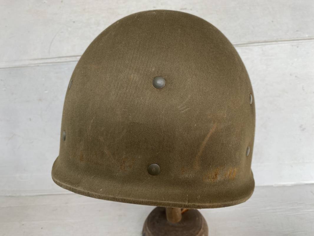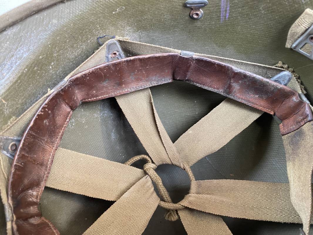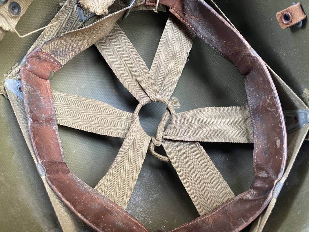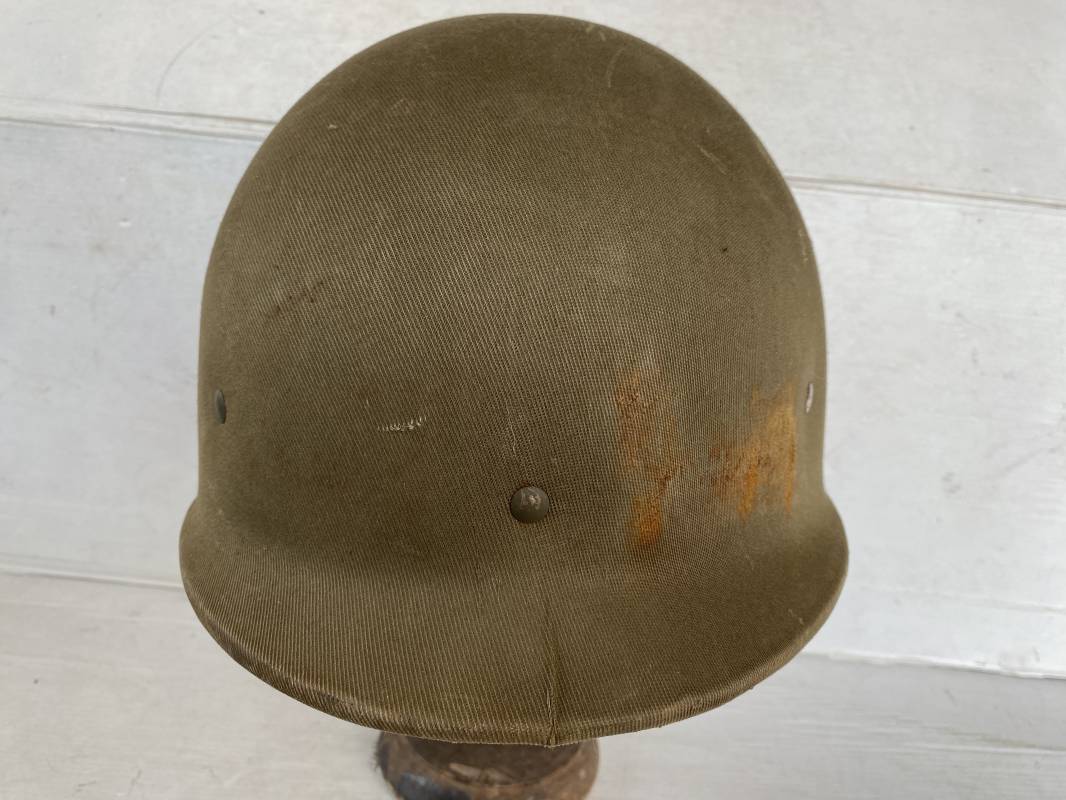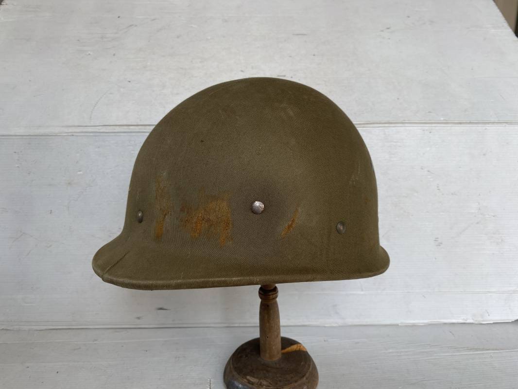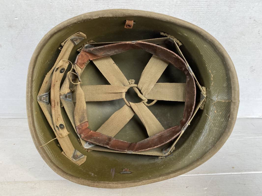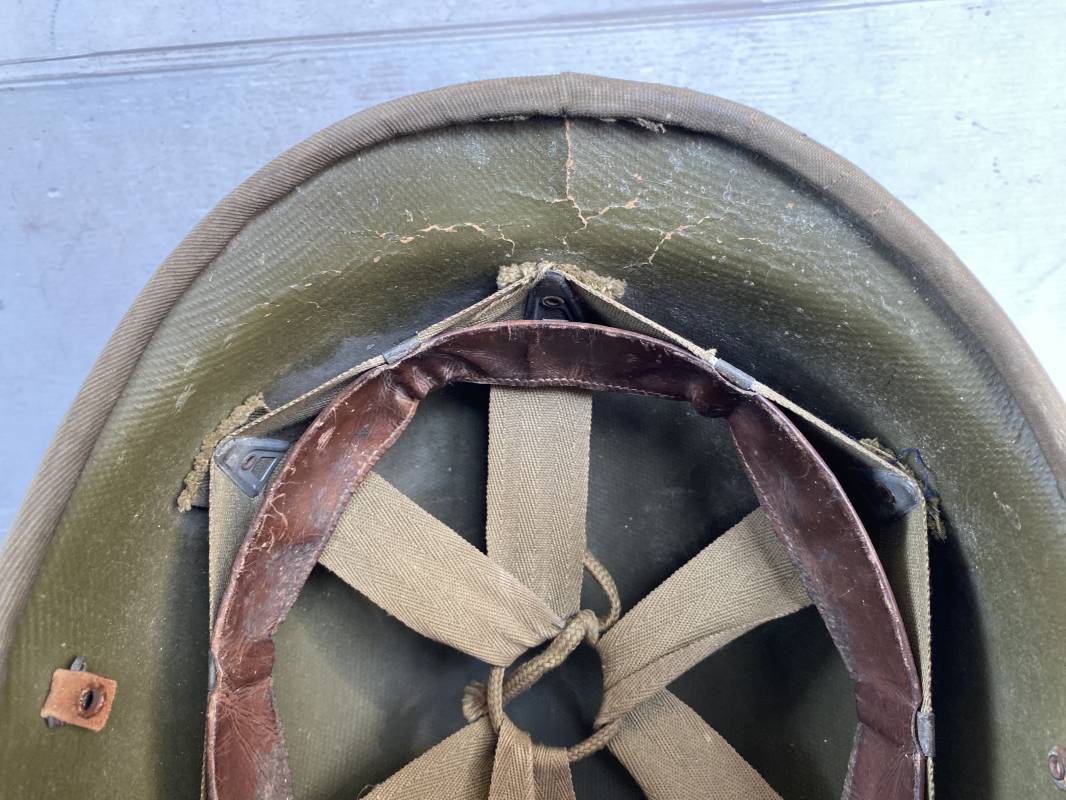 Rare sous casque Américain (Liner) du type Hawley en fibre compressée recouvert de toile Olive Drab . Liner du 2ème modèle avec bandeau de coiffe intérieur réglable en taille. Jugulaire en cuir fauve manquante. Intérieur en toile avec lacet coton. Rivets métal brut. Nuquière en toile. Casque légèrement porté en parfait état. Rare liner de fabrication précoce 1942. Pas courant. Ref 16032