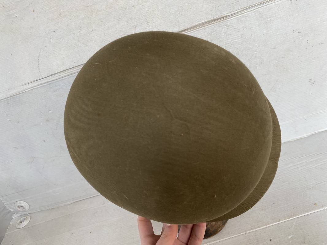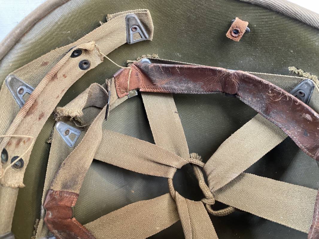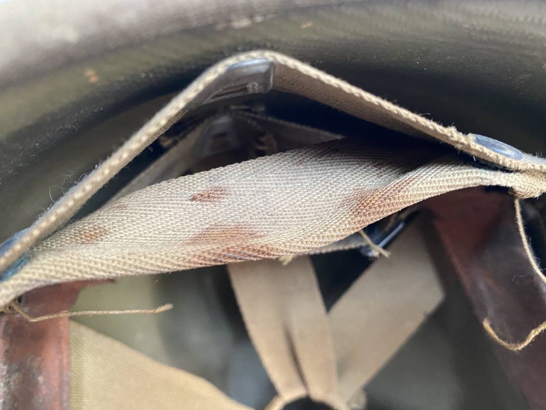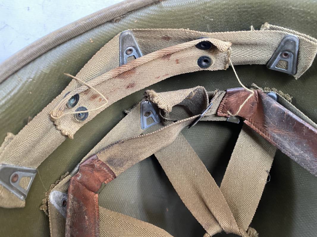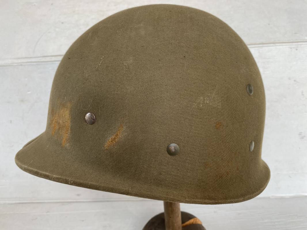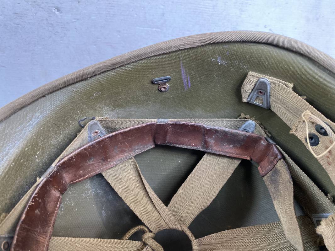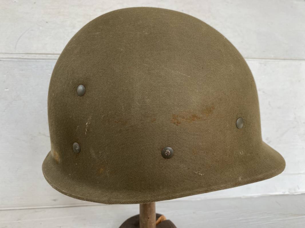 Rare sous casque Américain (Liner) du type Hawley en fibre compressée recouvert de toile Olive Drab . Liner du 2ème modèle avec bandeau de coiffe intérieur réglable en taille. Jugulaire en cuir fauve manquante. Intérieur en toile avec lacet coton. Rivets métal brut. Nuquière en toile. Casque légèrement porté en parfait état. Rare liner de fabrication précoce 1942. Pas courant. Ref 16032